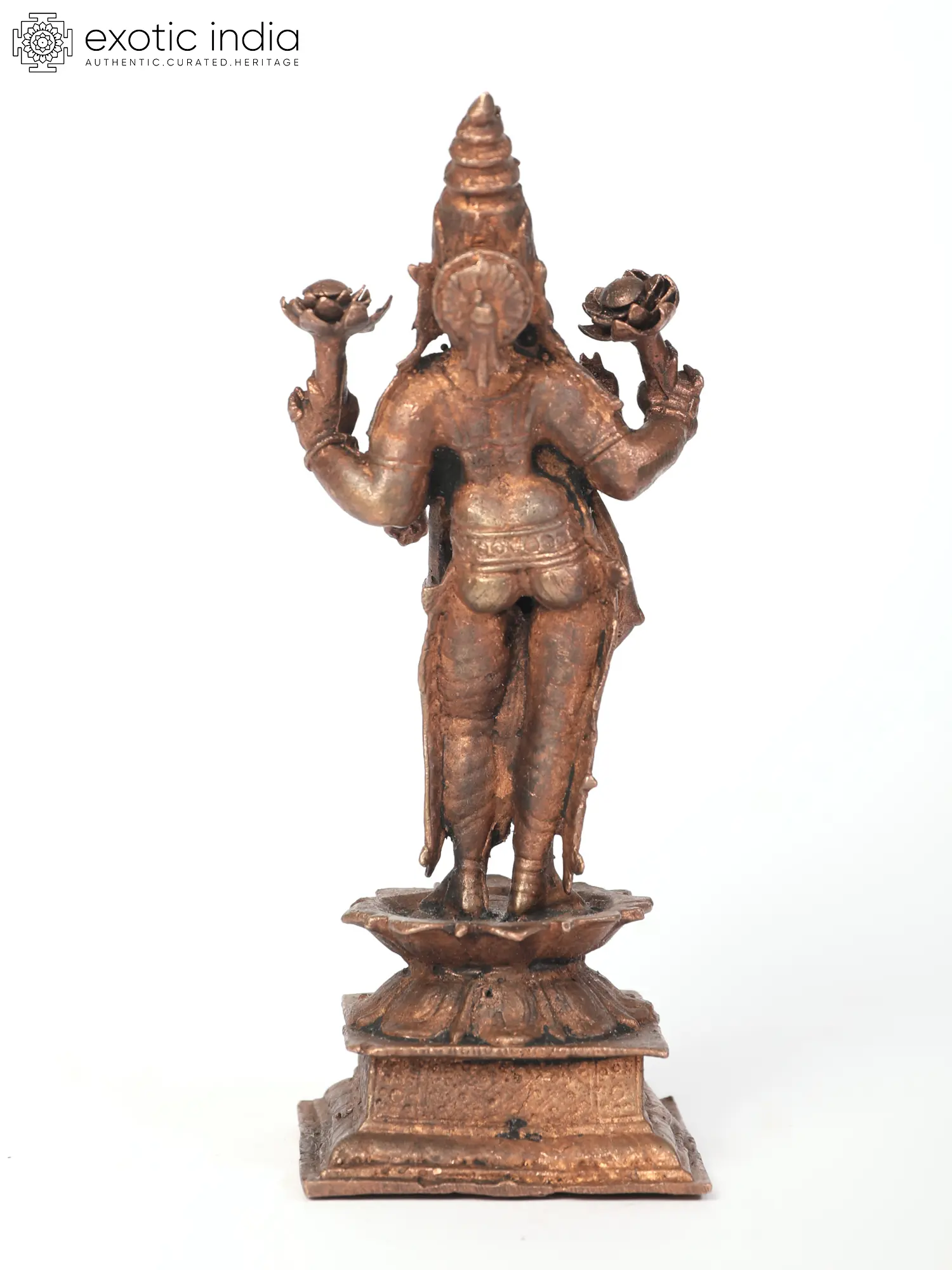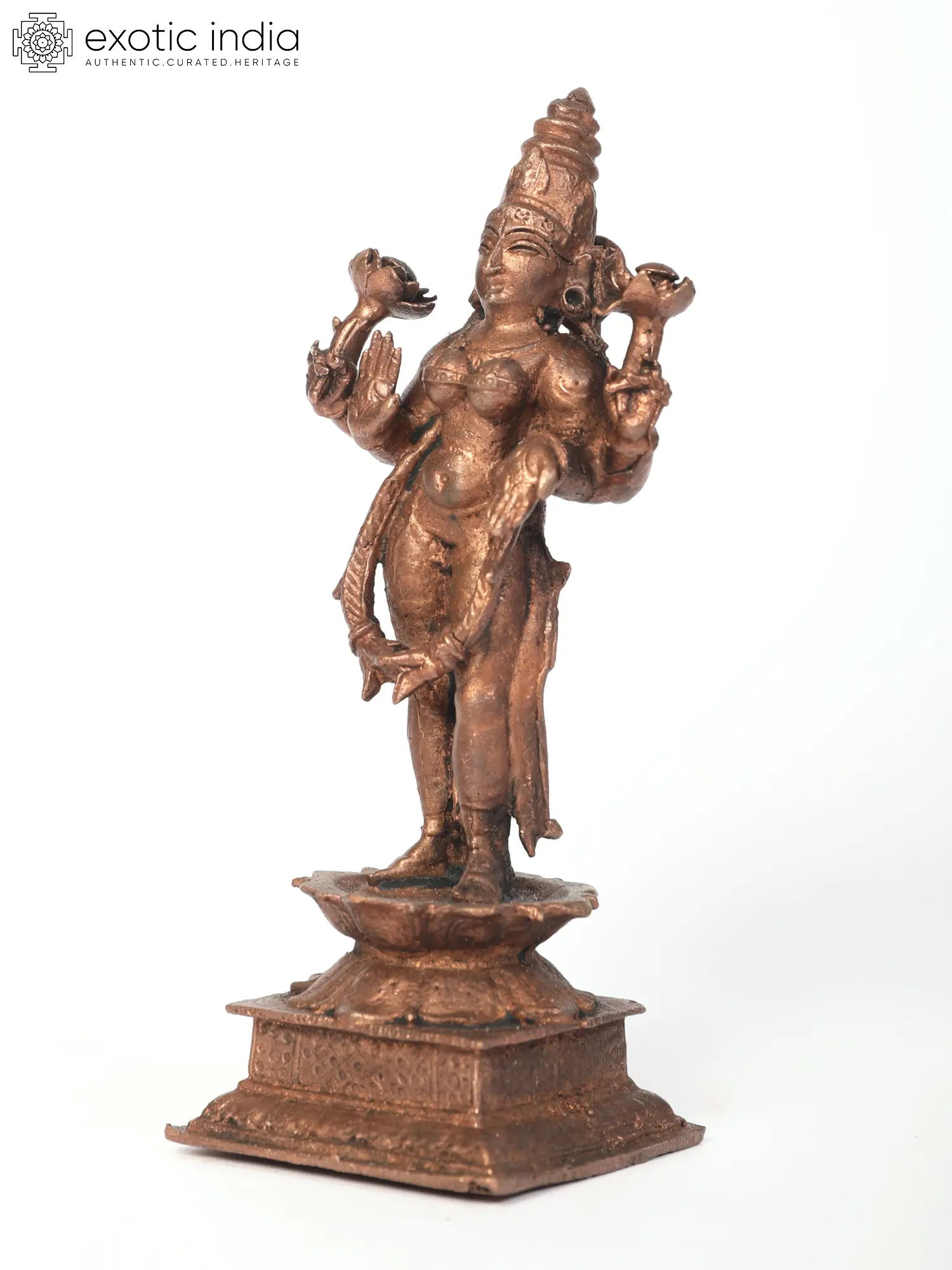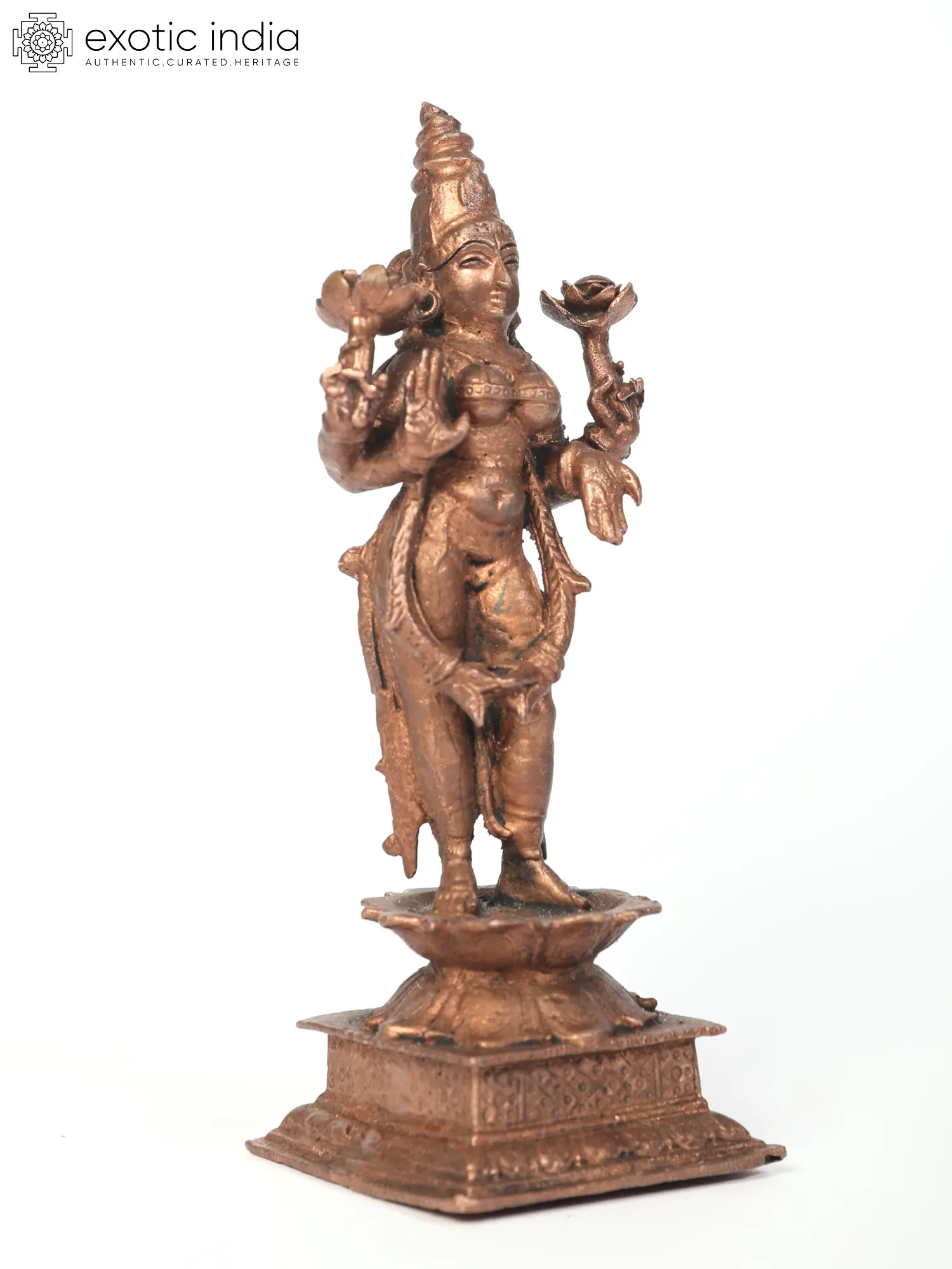 The most beautiful and auspicious woman in three realms, the beloved of Sri Vishnu, goddess Lakshmi is fortune and beauty incarnate. In this small copper statue, the great mother goddess appears in an enchanting form, standing gracefully on a lotus which symbolizes the origin of the Universe. Her youthful form is richly adorned by jewellery and clothes fit of a sovereign and she is ornamented by a long garland that frames her body charmingly. Holding lotuses and the gesture of Abhaya (fearlessness) and Varada (giving boons), goddess Lakshmi in this murti emanates divinity all around.