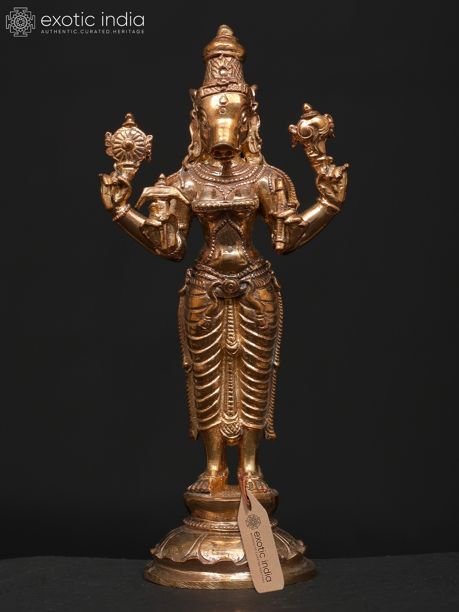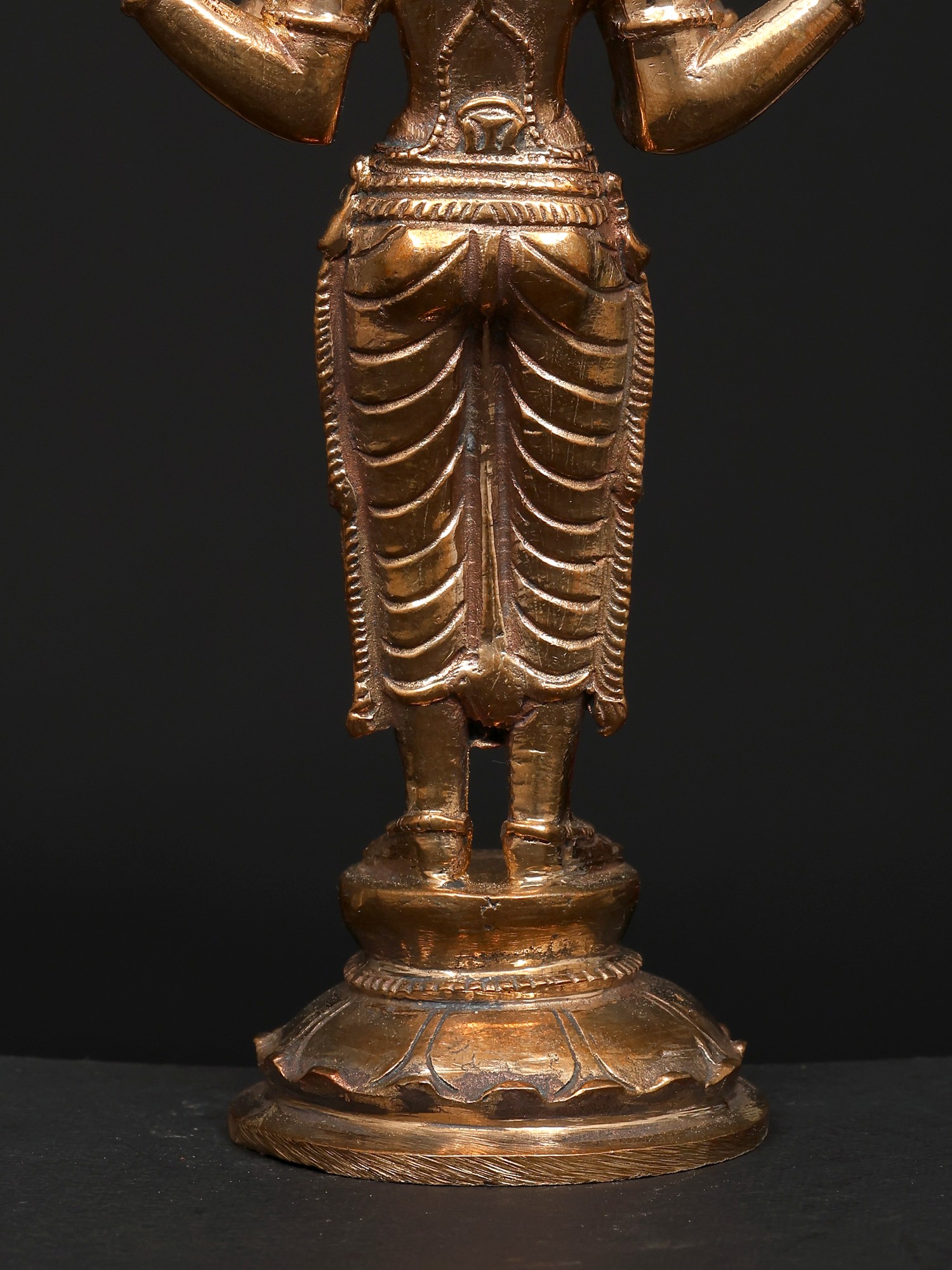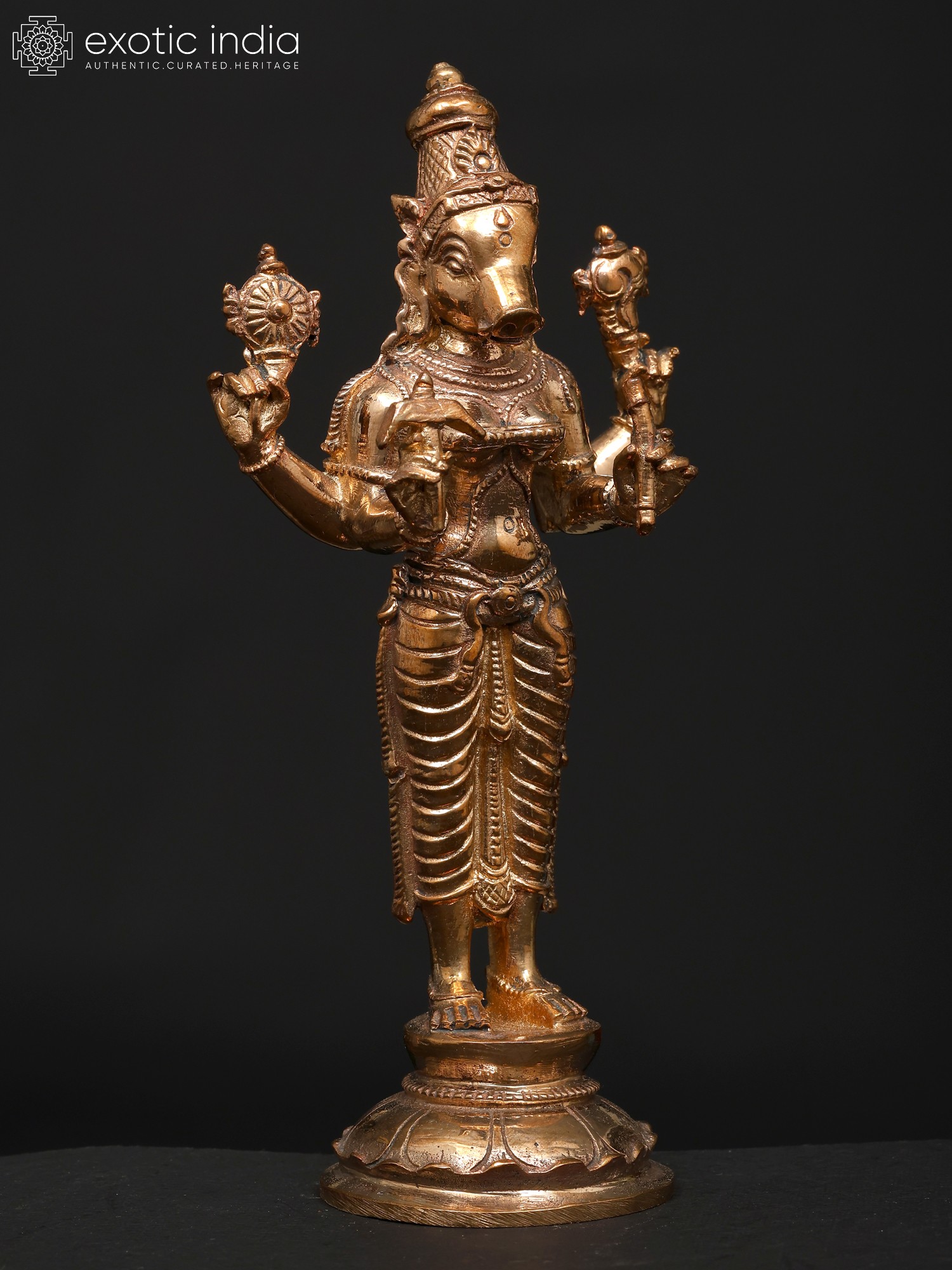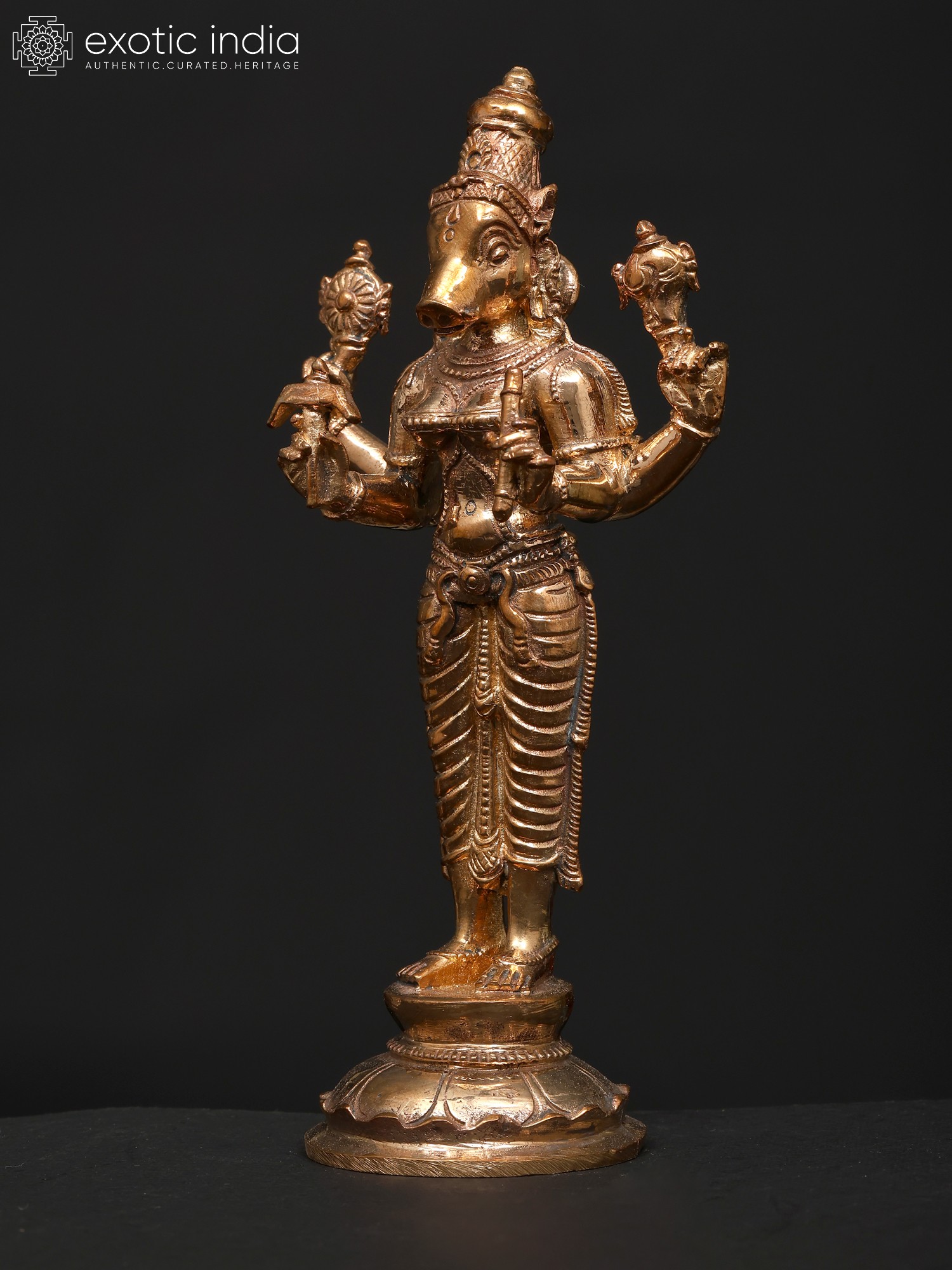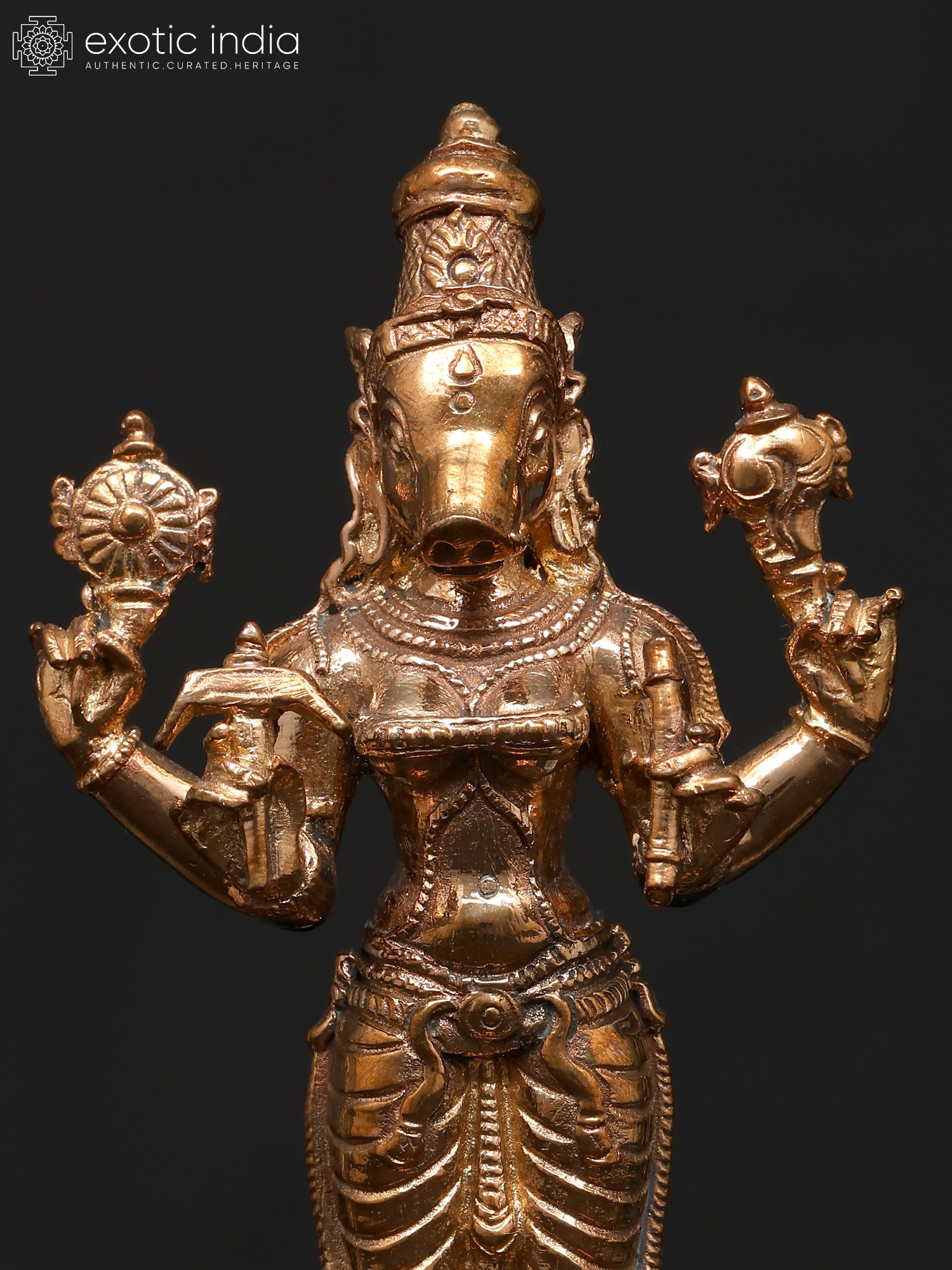 Standing in the beautiful Sampadasathanaka posture which balances her ethereal form on a lovely lotus pedestal, the Shakti (energy) of Sri Vishnu’s Varaha avatar, goddess Varahi is presented in this exquisite small bronze statue. The goddess is Chaturbhuja and is adorned in the Vaishnava Kiritamukuta crown, and ornaments, which give her a divine appearance of Sri- the goddess of wealth.