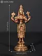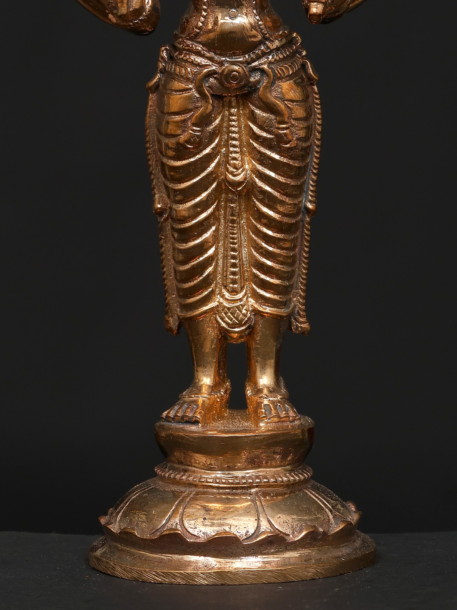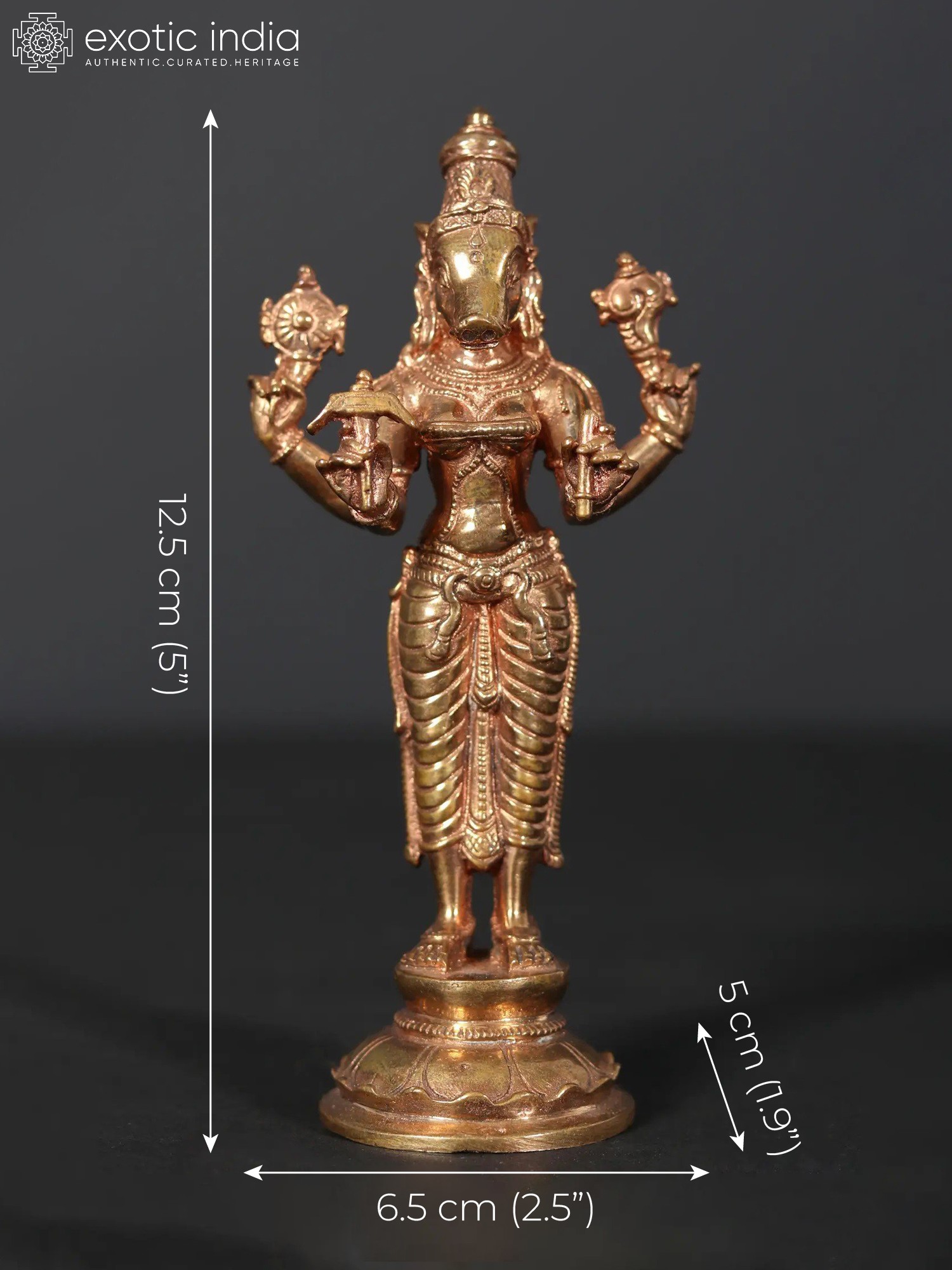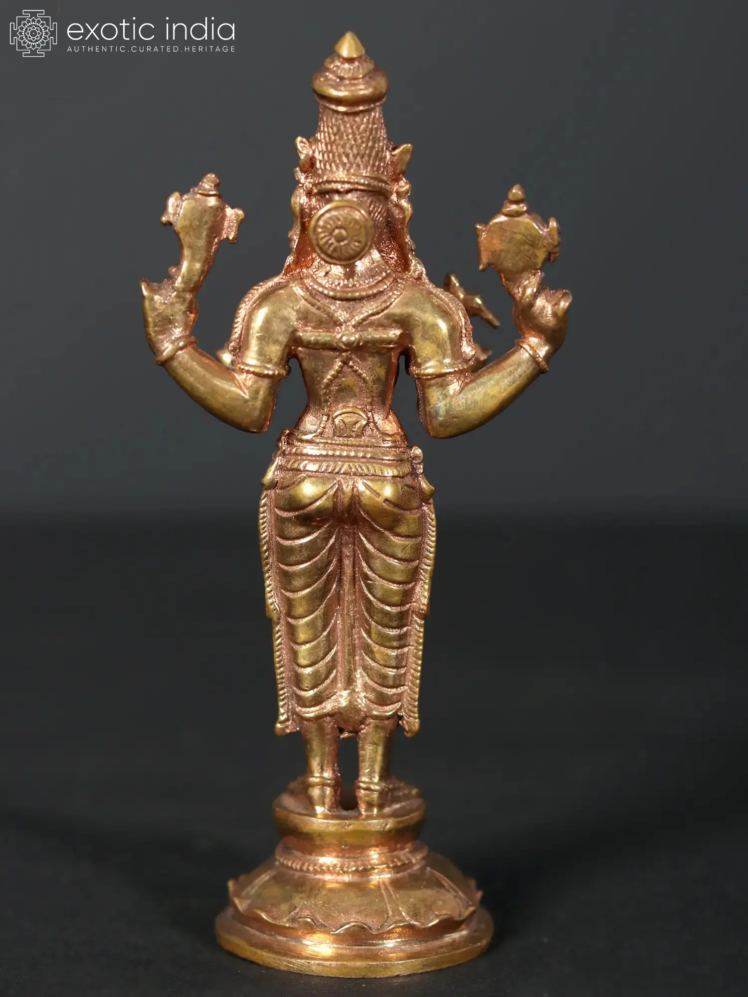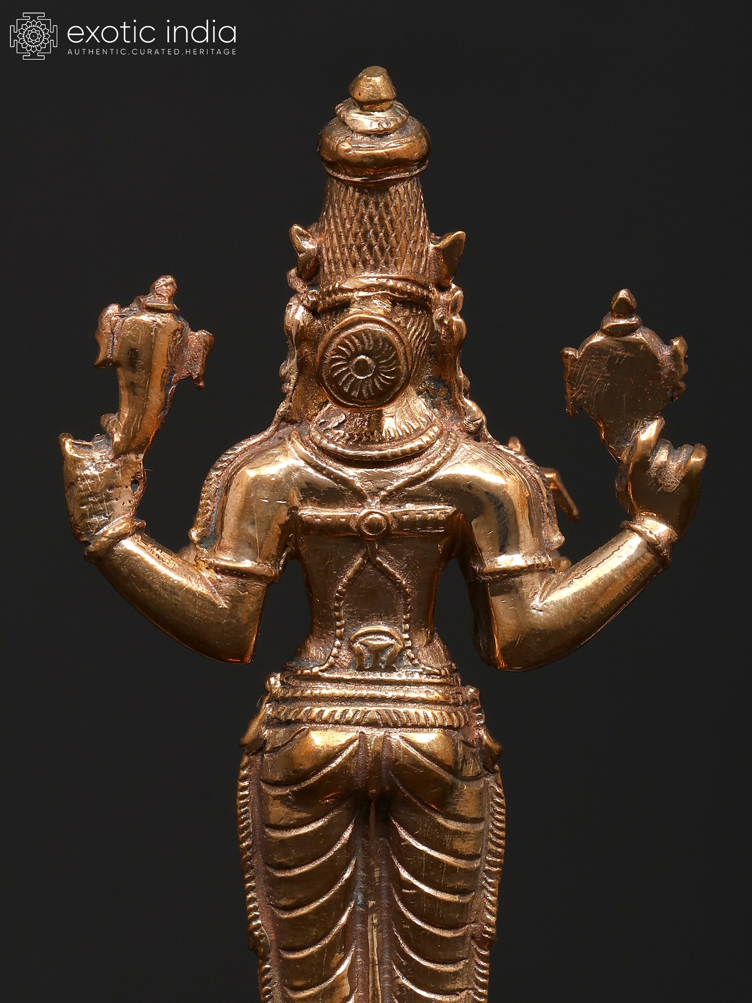 Standing in the beautiful Sampadasathanaka posture which balances her ethereal form on a lovely lotus pedestal, the Shakti (energy) of Sri Vishnu’s Varaha avatar, goddess Varahi is presented in this exquisite small bronze statue. The goddess is Chaturbhuja and is adorned in the Vaishnava Kiritamukuta crown, and ornaments, which give her a divine appearance of Sri- the goddess of wealth.