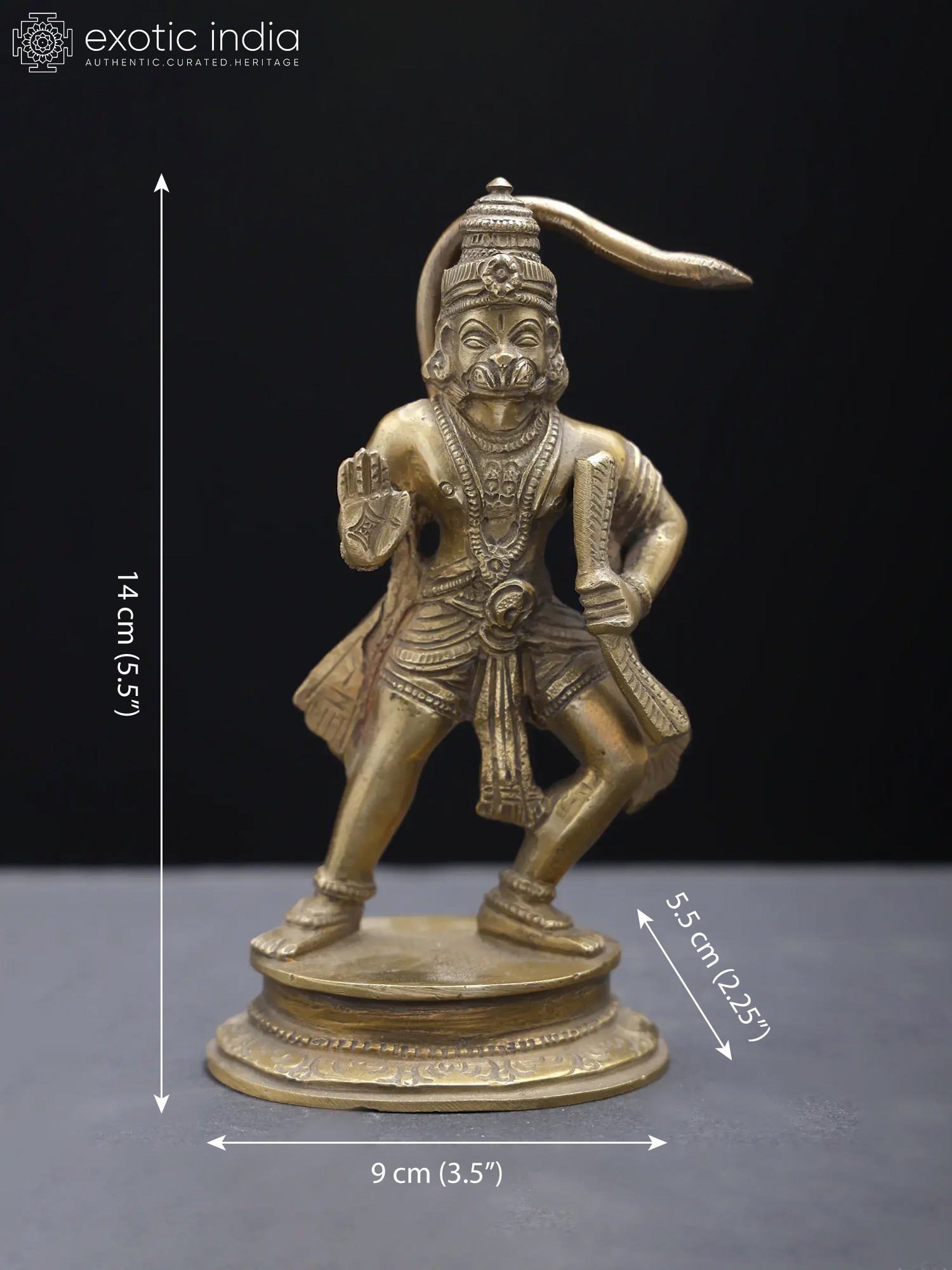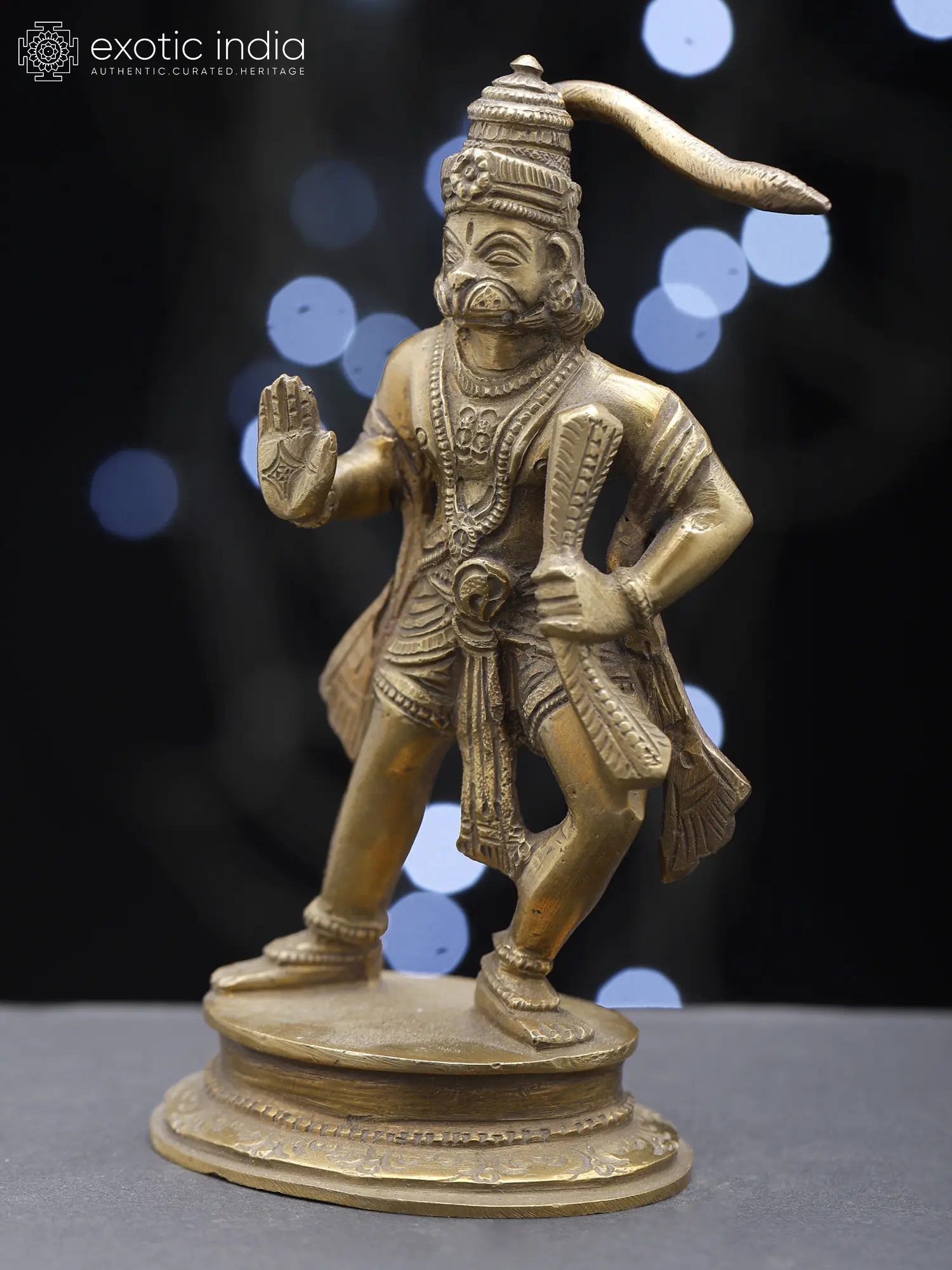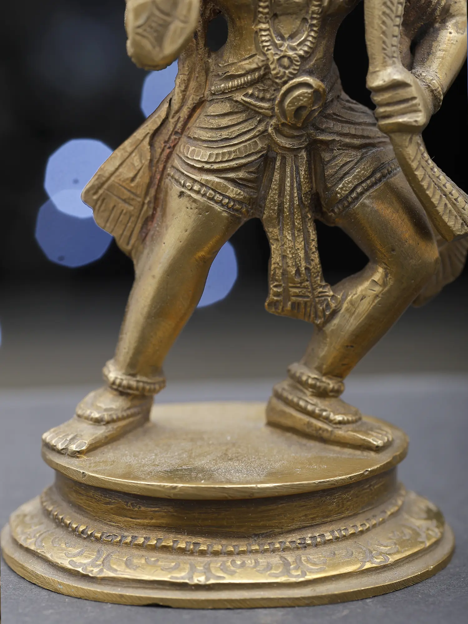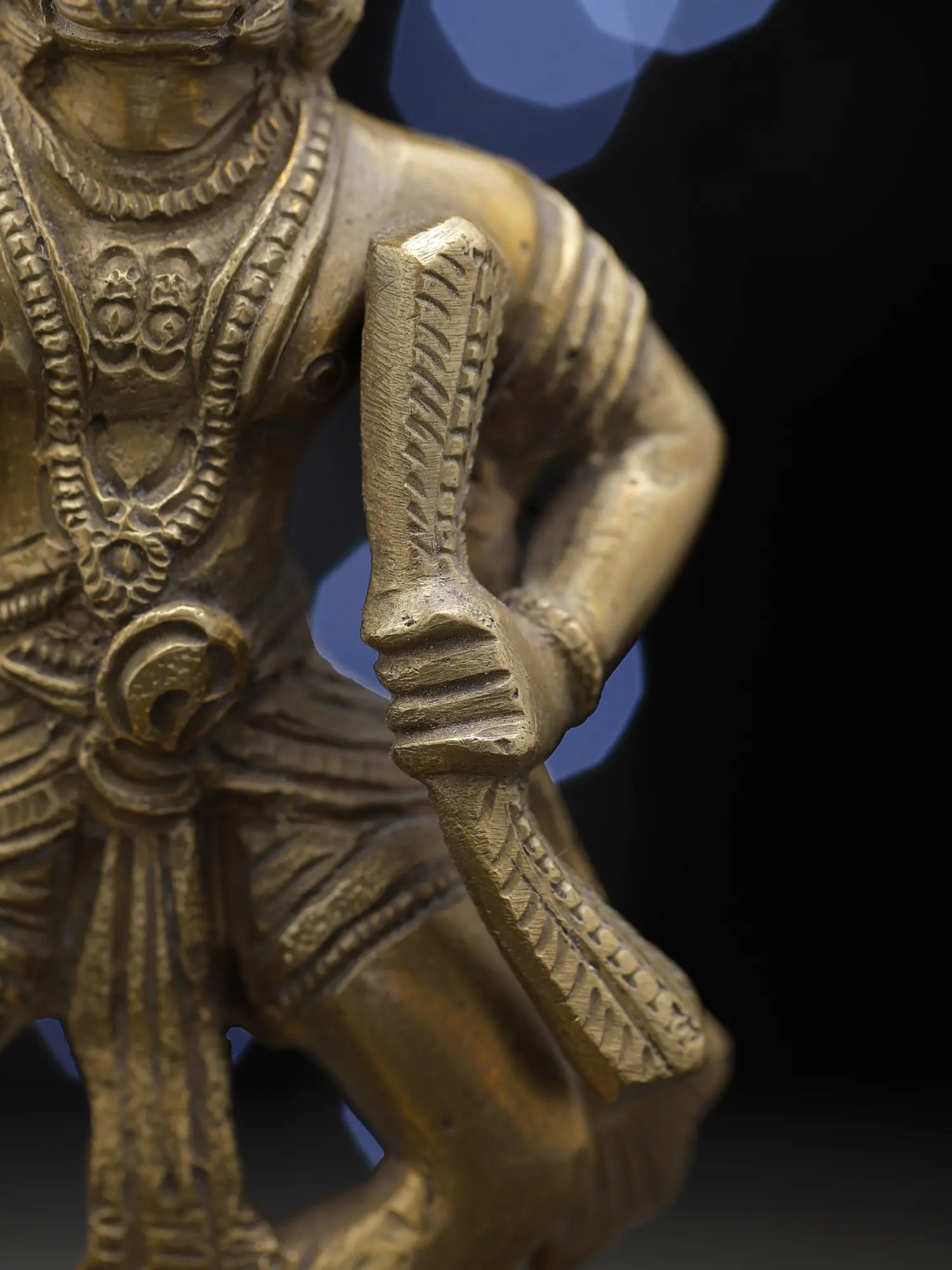 Bronze statues hold ritualistic significance in Hindu culture, representing divine beings and serving as focal points for worship and meditation. They embody spiritual energy and convey the presence of gods and goddesses, fostering devotion and reverence among worshippers. The Small Standing Lord Hanuman in Blessing Gesture exemplifies this significance, depicting Hanuman in a dynamic posture, with one leg extended as if preparing for flight.