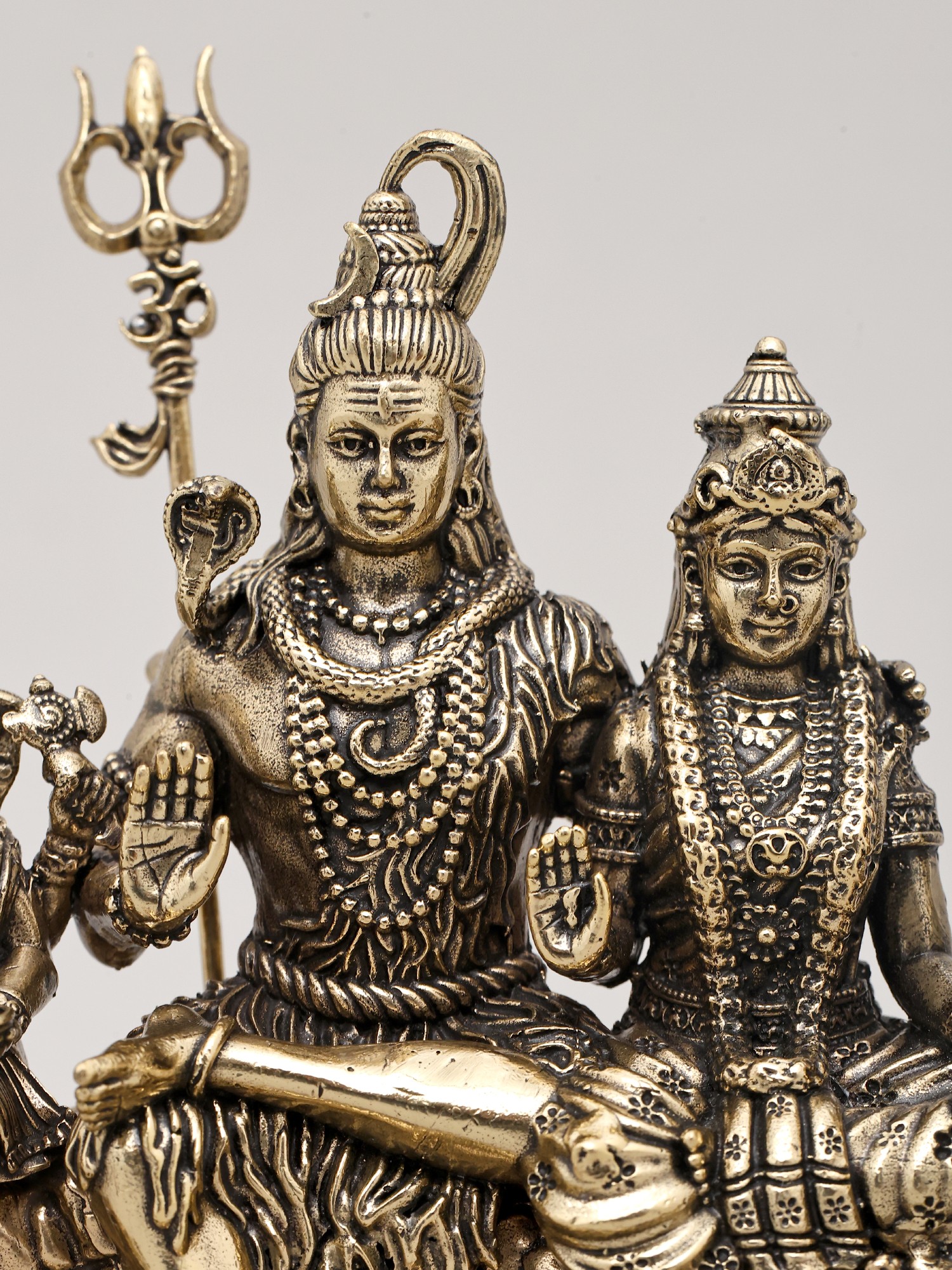 This exquisite brass statue captures the serene and powerful essence of Lord Shiva and his beloved consort, Goddess Parvati, alongside their sons, Lord Ganesha and Lord Kartikeya. Depicted seated together, they form a tableau of divine harmony, love, and familial bliss, embodying the ideal household in Hindu tradition. Lord Shiva, the destroyer and transformer, sits with calm authority, his Trishul, the trident symbolizing the three aspects of existence—creation, preservation, and destruction—held regally. Beside him, Goddess Parvati, the divine mother, radiates grace and gentleness, her presence a source of strength and compassion. ––––––––––