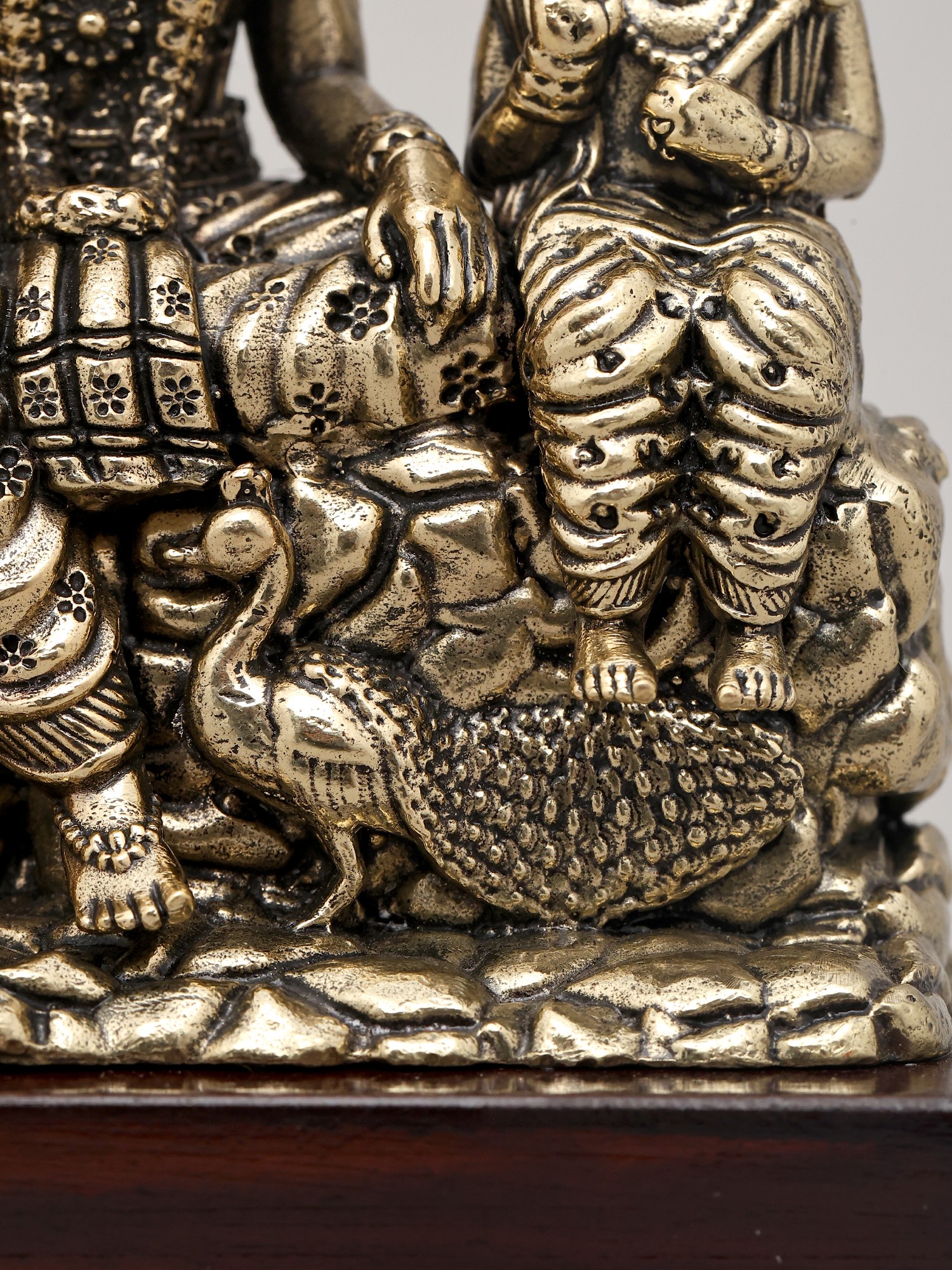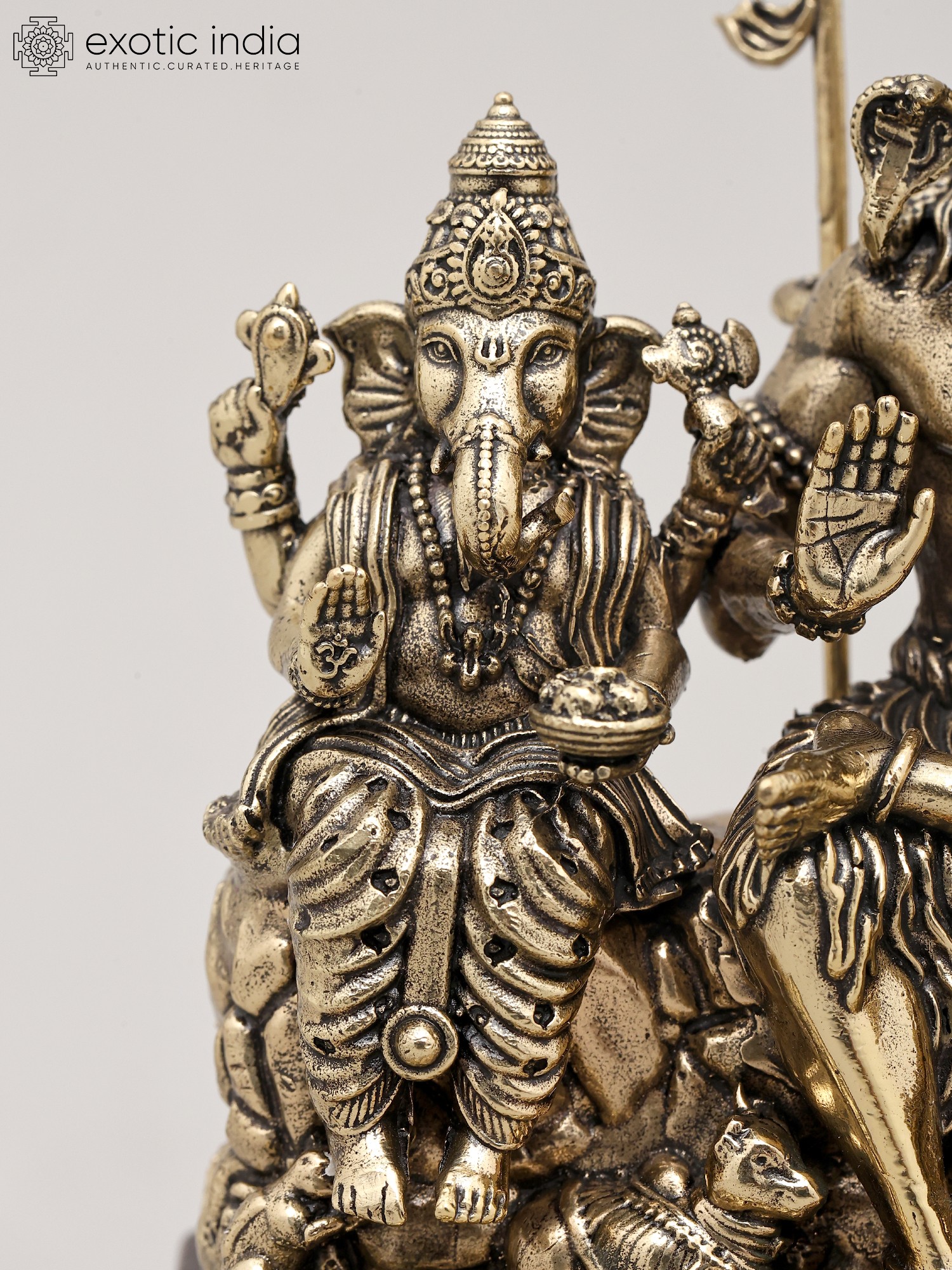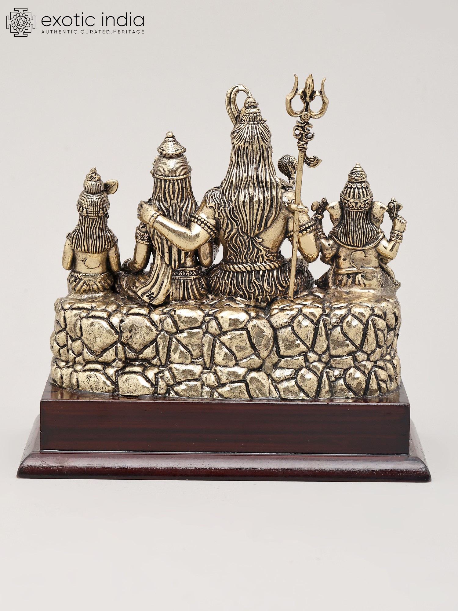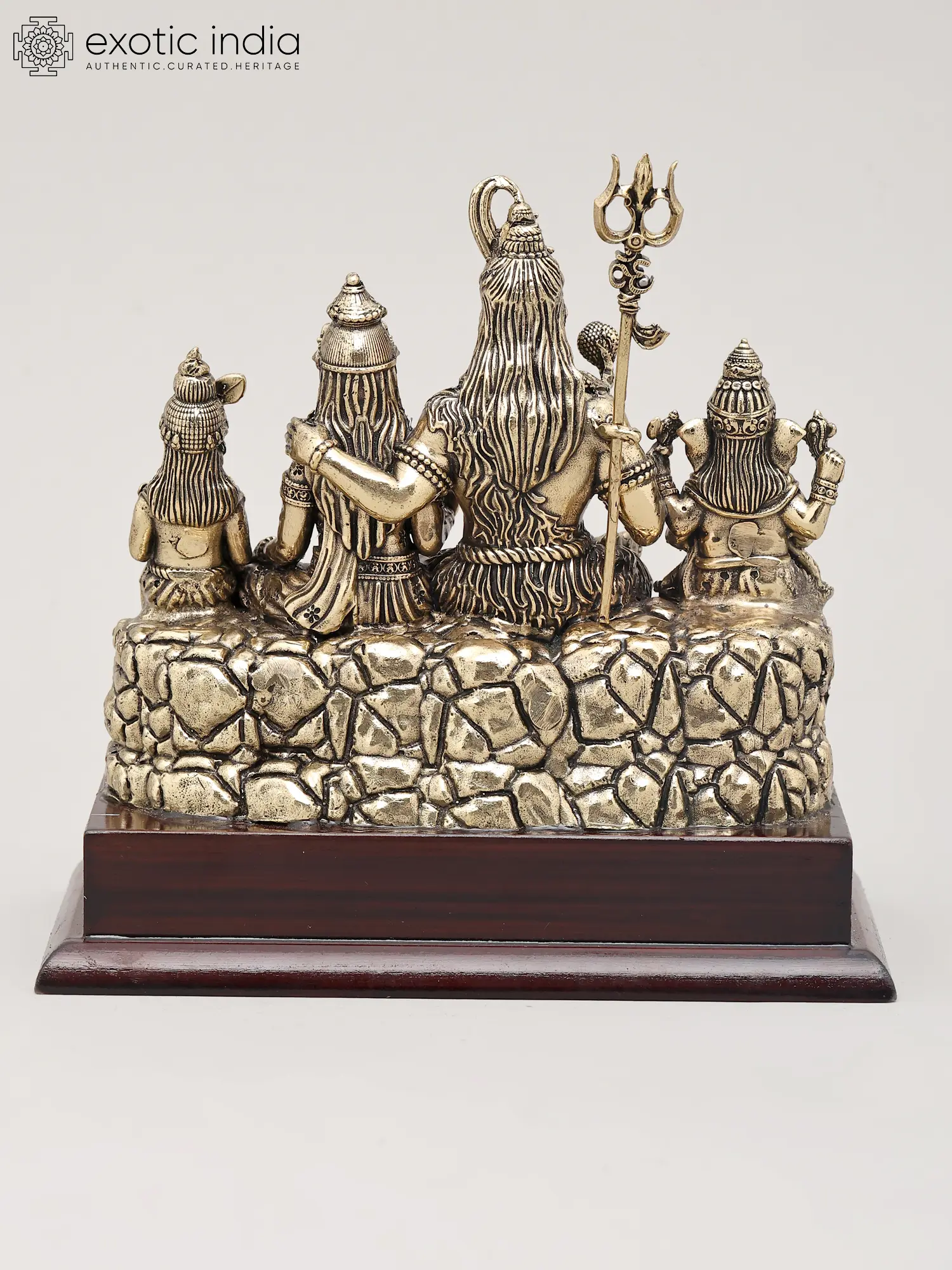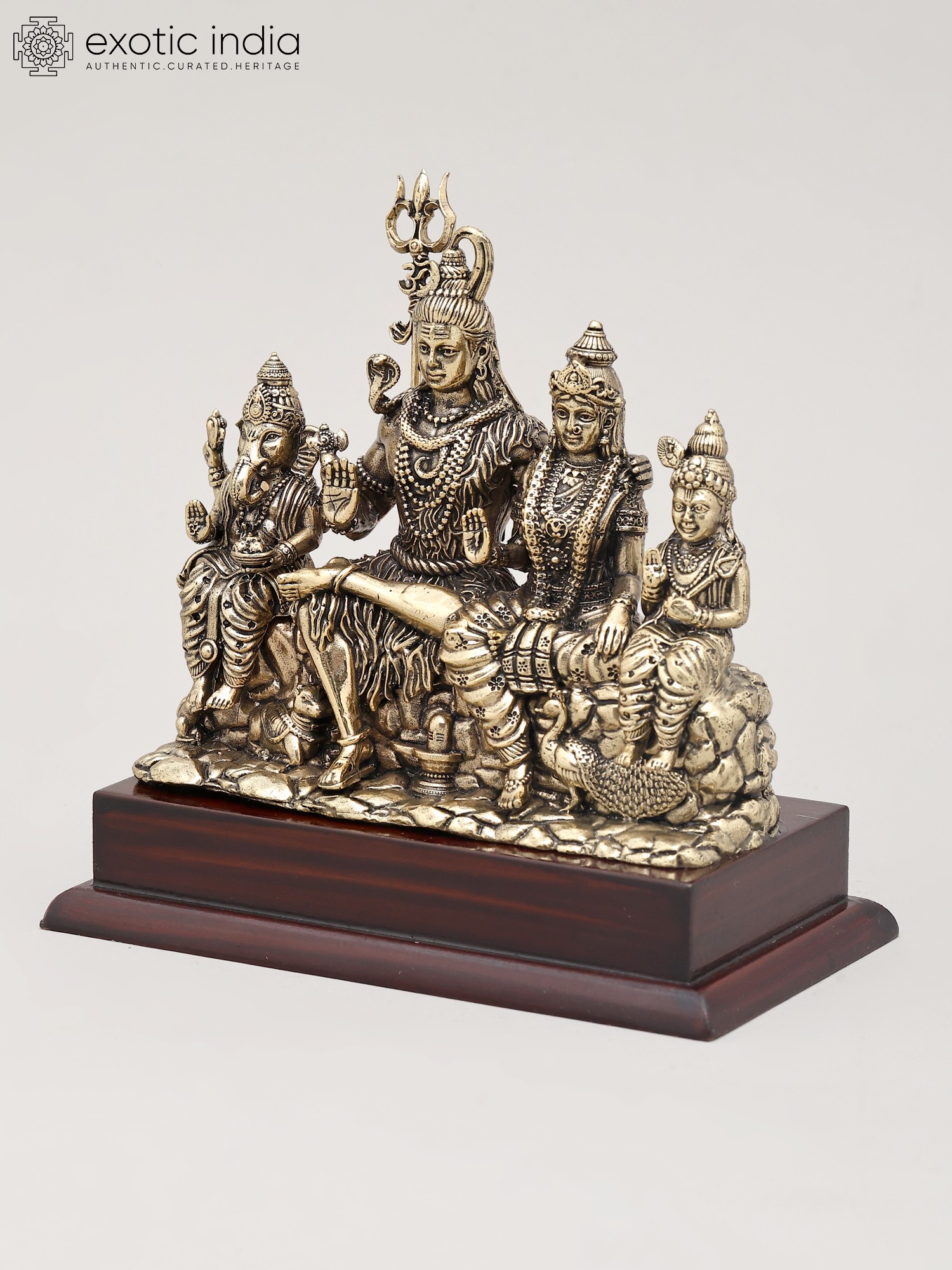 Crafted from fine brass, this statue showcases meticulous detailing and a superfine finish, a testament to the skilled artistry of Indian artisans. The rich patina of the brass lends a timeless quality, making it a striking decorative piece that radiates spiritual significance. The entire composition rests upon a sturdy and elegant wooden base, adding a touch of natural beauty and enhancing its overall aesthetic appeal. This sculpture is not merely an object of art; it is a conduit to invoking blessings of prosperity, wisdom, strength, and harmonious family life. It is said that invoking the divine family together can bring peace and balance to one's home and personal endeavors, much like the balance held within the cosmic order governed by Lord Shiva. This piece, with its profound symbolism and masterful execution, is an ideal addition to any sacred space or discerning collection, bringing the divine presence into your everyday life.