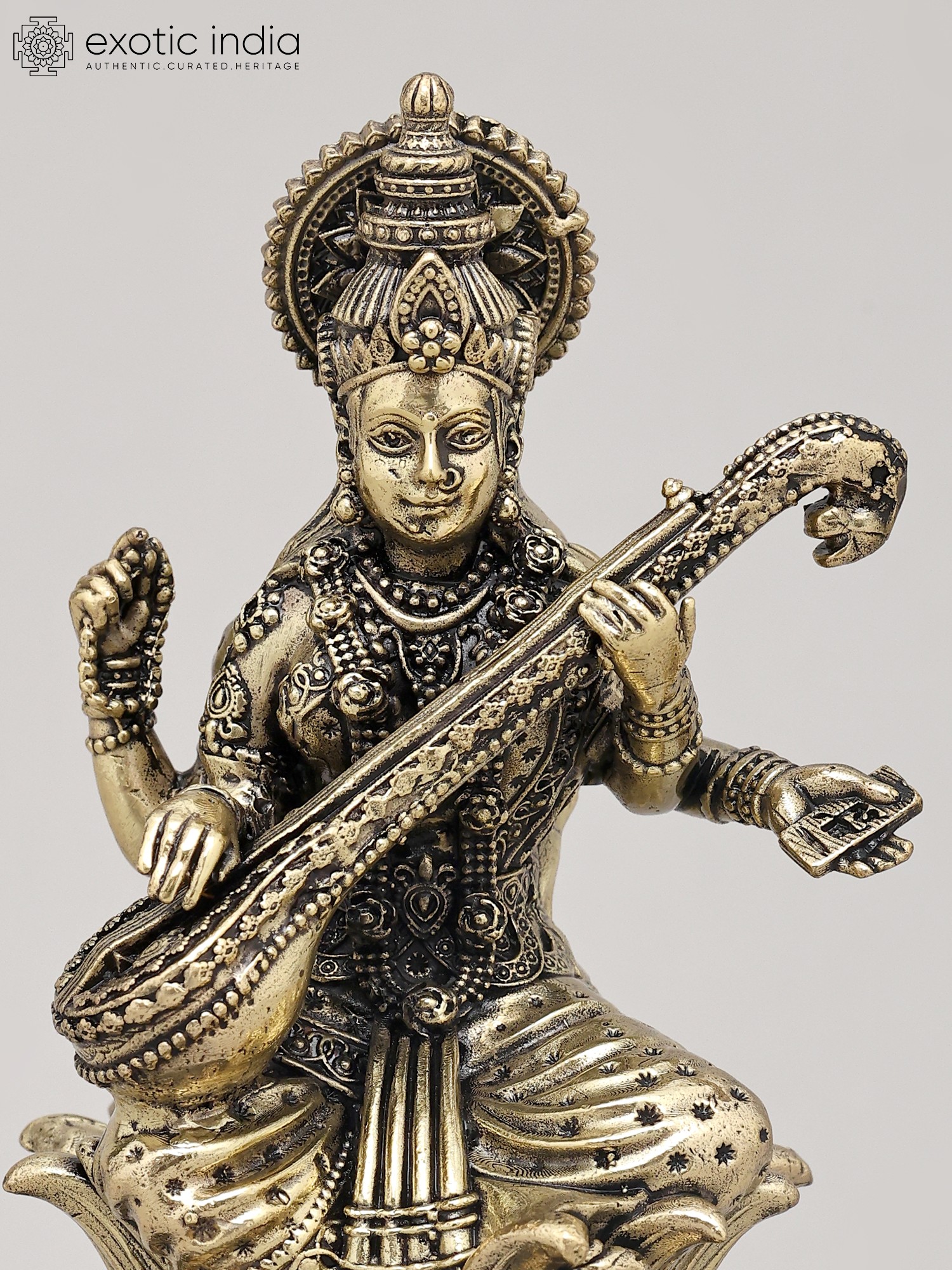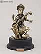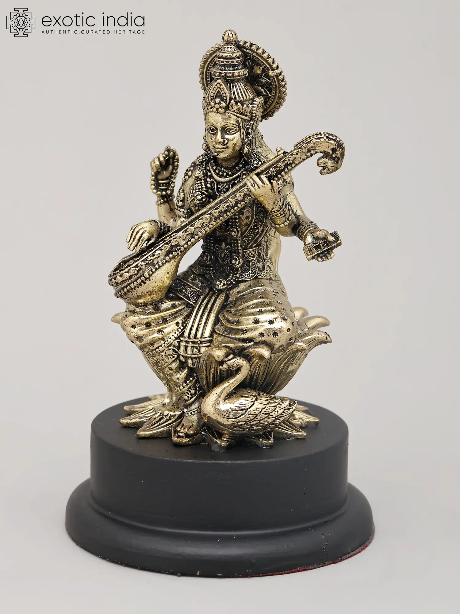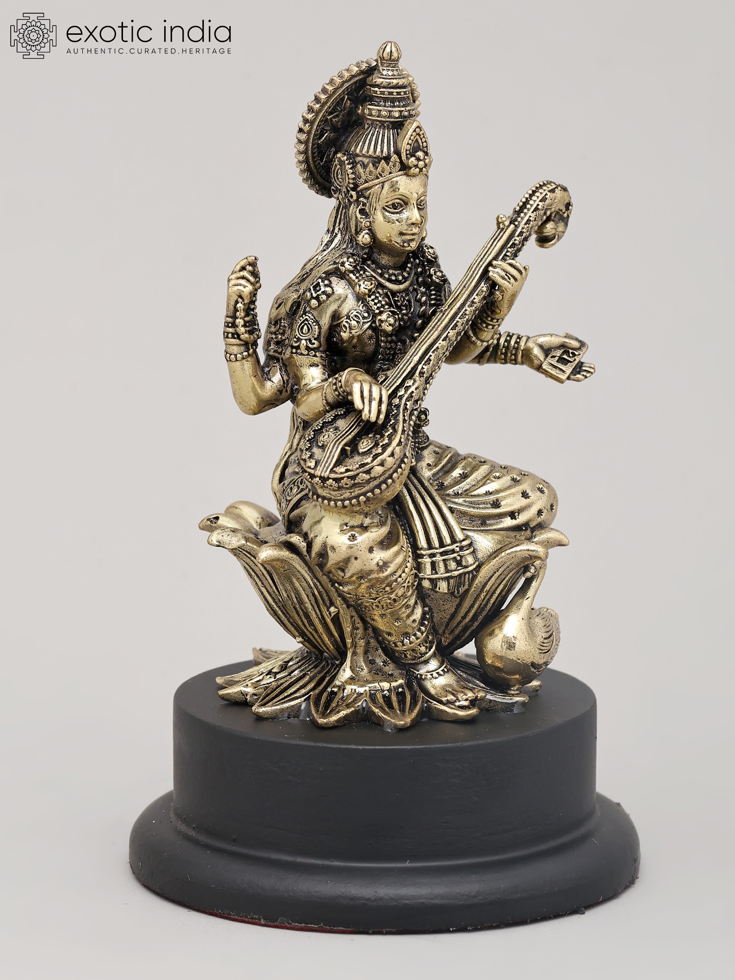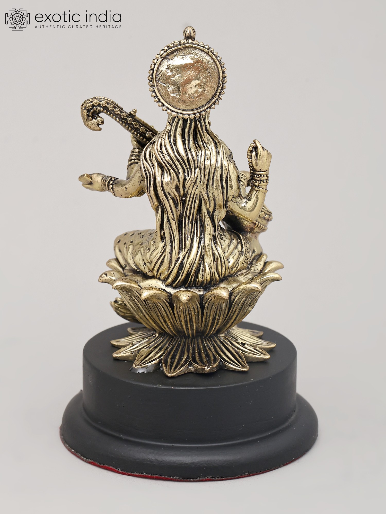 5" Small Superfine Idol of Goddess Saraswati Playing Sitar on Wood Base | Brass Statue