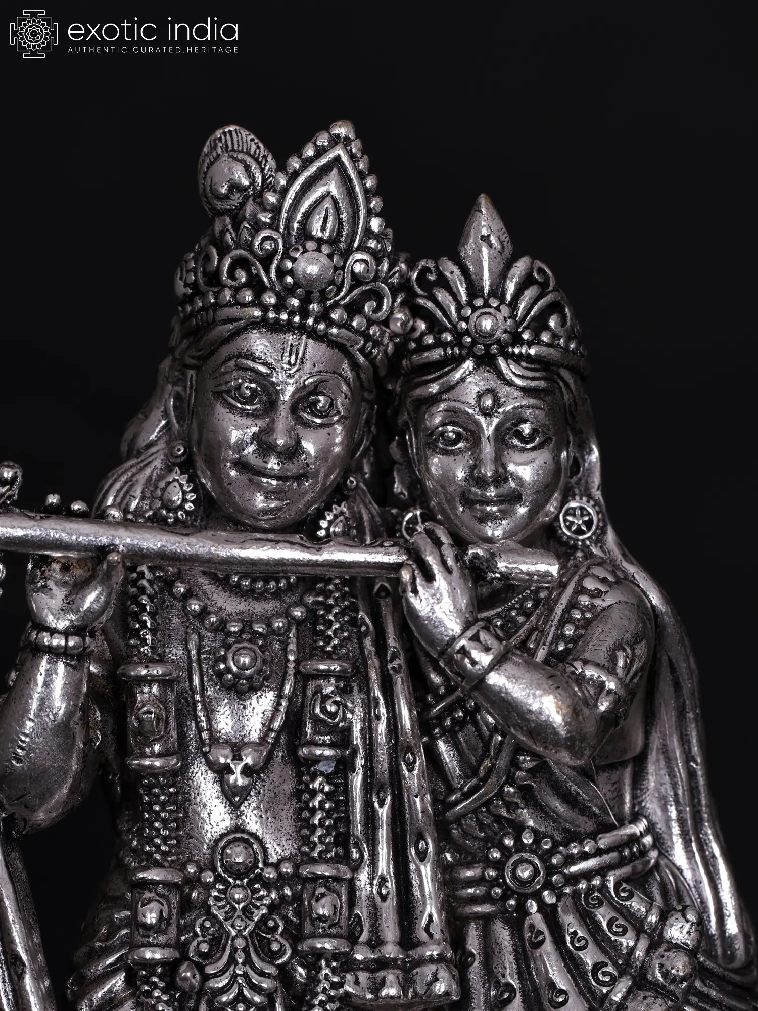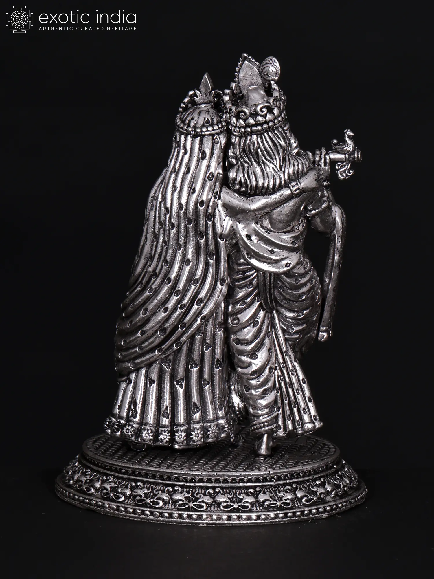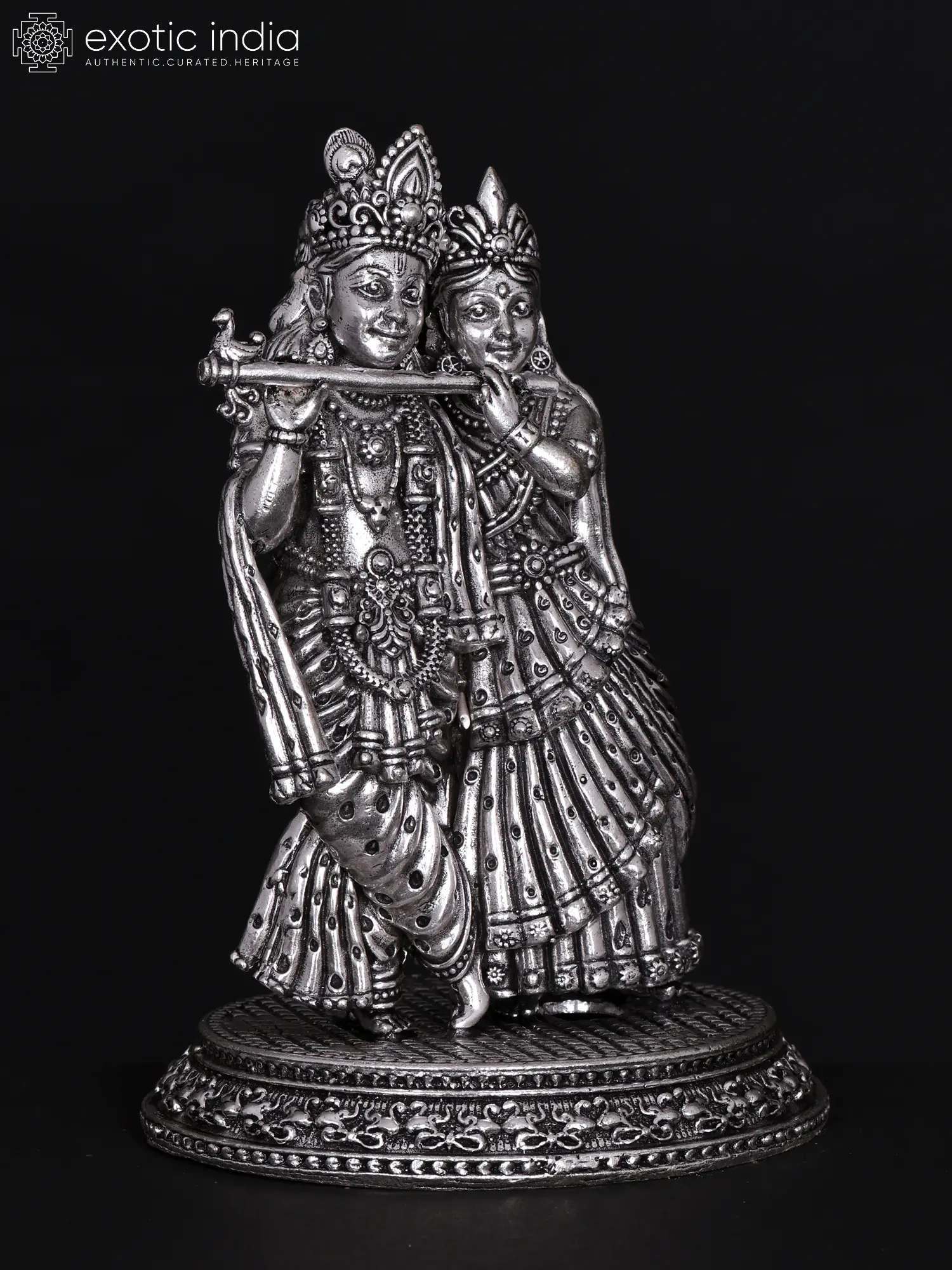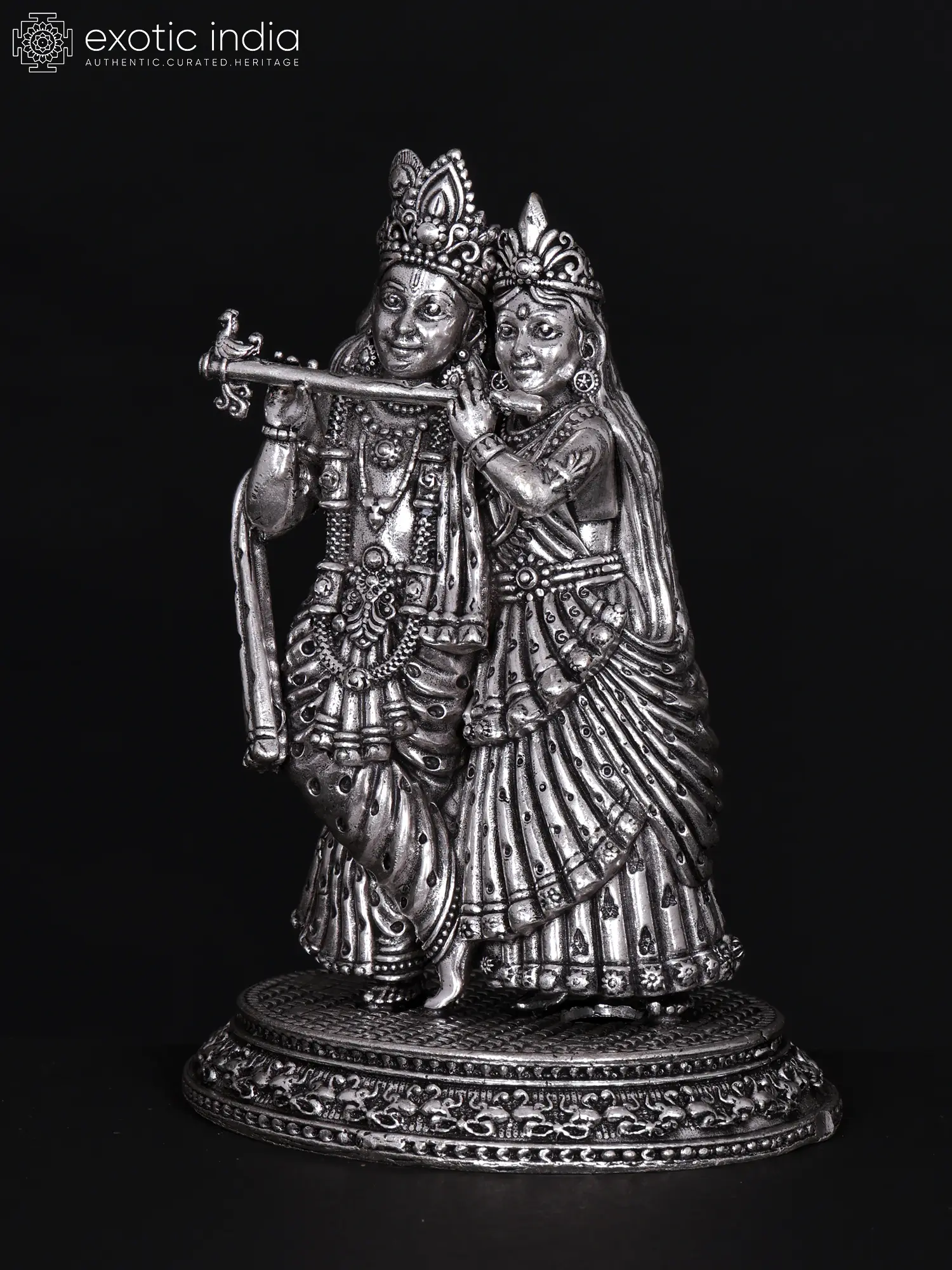 The benevolent smile of Radha-Krishna animates the icons with their divine presence, embellished further by the beautiful silver plating that gives the idol a sacred and rich aura.