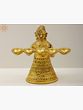The golden-colored brass sculpture of the tribal lady is seen holding the second right diya with her right hand, and the second left diya with her left hand making a steady equilibrium that can hold the five lamps firmly.
