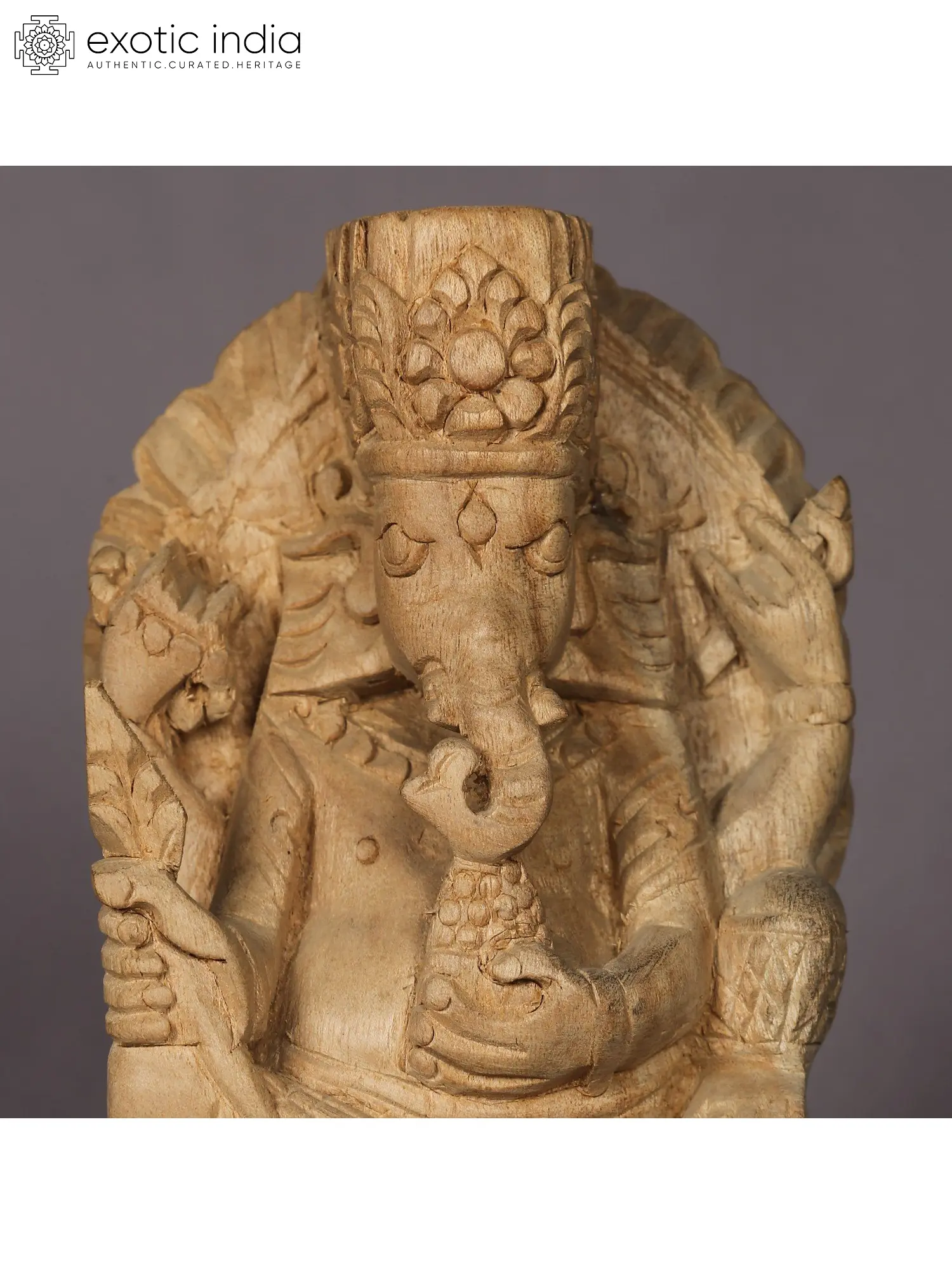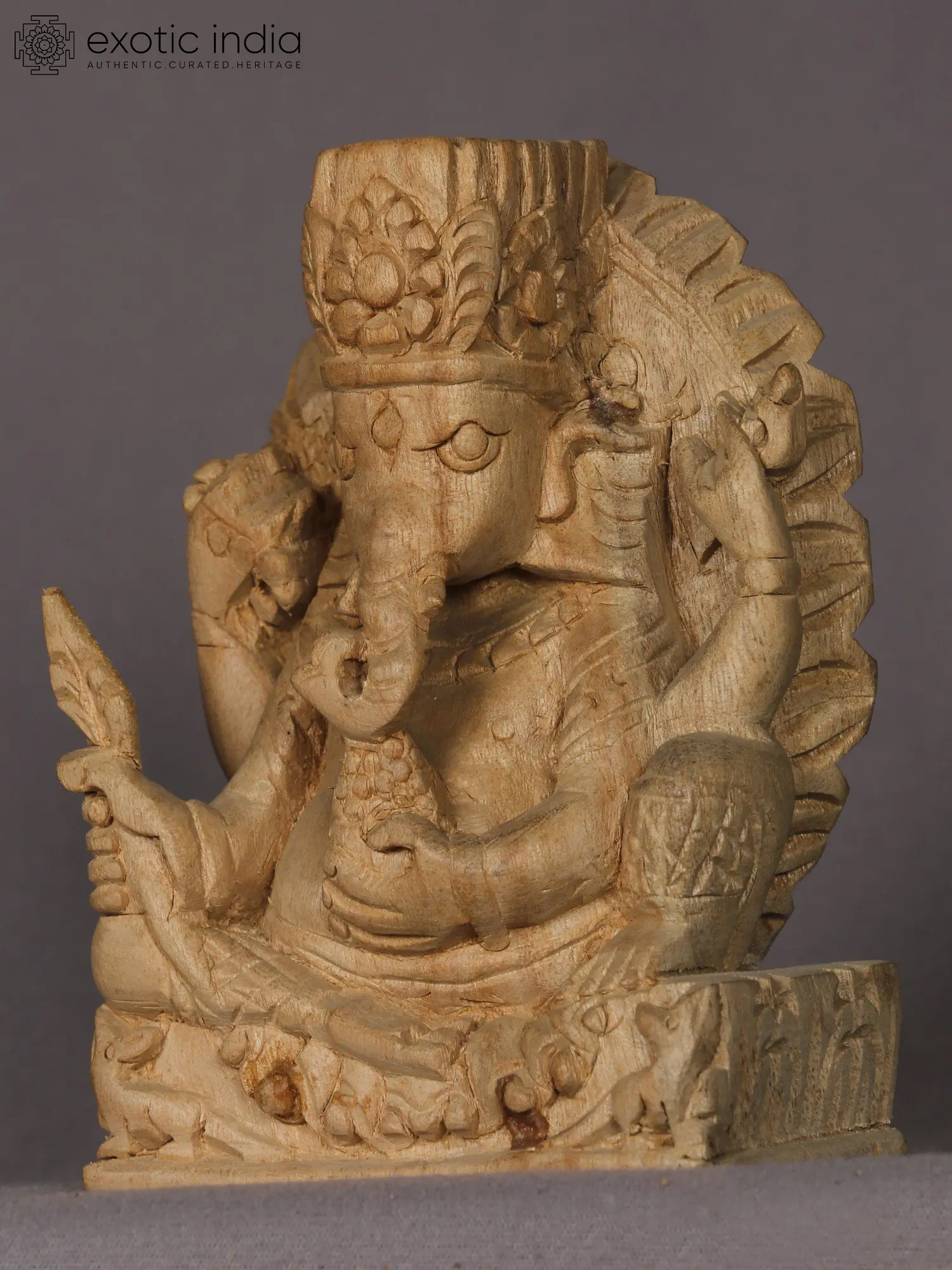 The Small Wooden Lord Ganesha figurine encapsulates the revered Hindu deity in a compact form. Handcrafted with intricate detail, Ganesha is depicted in a sitting posture, radiating wisdom and benevolence. The wooden texture adds warmth to the piece. Ganesha's arms hold symbolic attributes: a modak (sweet) representing rewards, an ax to cut attachments and damru to represent the rhythmic pulse of creation and the cyclical nature of existence. His elephant head embodies intelligence and his potbelly signifies prosperity. This miniature rendition captures the essence of Ganesha's auspicious presence, making it a cherished symbol of good fortune and protection.