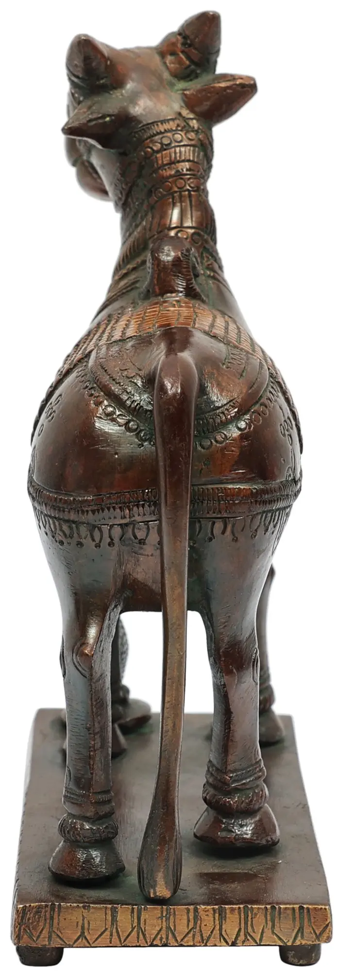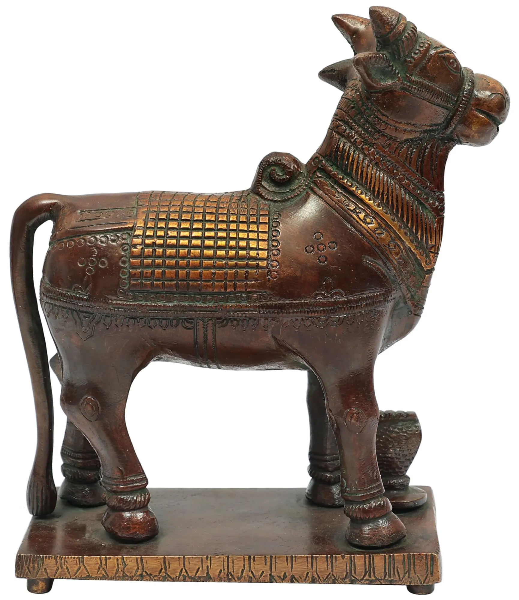 Also “Nandikeshvara” or “Nandideva”, Nandi is the bull Vahana (mount) of “Lord Shiva”. As Lord Shiva’s loyal mount and guardian, Nandi represents unwavering devotion, strength, and purity. Pilgrims often touch or whisper their prayers to Nandi before seeking Lord Shiva’s blessings. It is believed that worshipping Nandi deepens spiritual growth, inviting blessings, and guiding individuals on the path of righteousness. Crafted in brass, this spectacular artwork embodies an aura of serenity and spiritual energy.