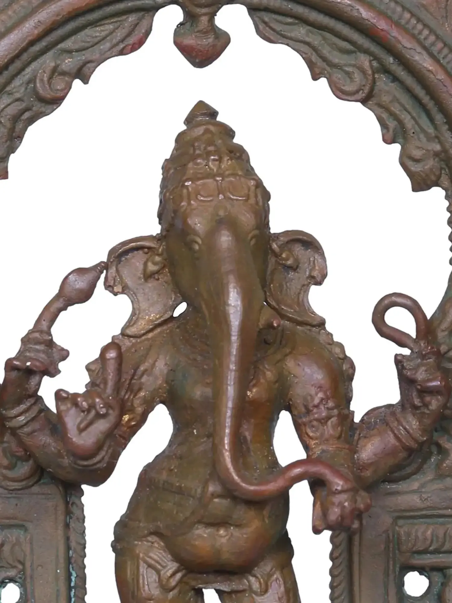Standing in a Tribhanga, Ganesha who leads all the ganas of Shiva is venerated for his insight and benign disposition. Vinayaka here, as Chaturbhuja holds an Ankusha, Pasa and his broken tusk, in the left hand he holds Modaka, and his trunk, in temptation going towards it. His big belly contains the entire cosmos and the high pedestal with majestic Prabhavali establishes his Royal status. Diced in Panchaloha bronze, this idol derives inspiration from the great Chola art.