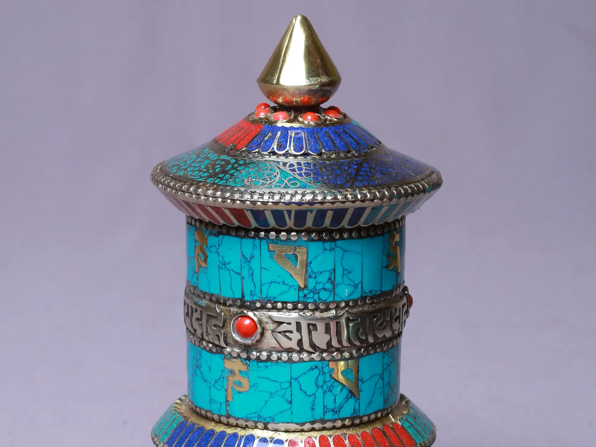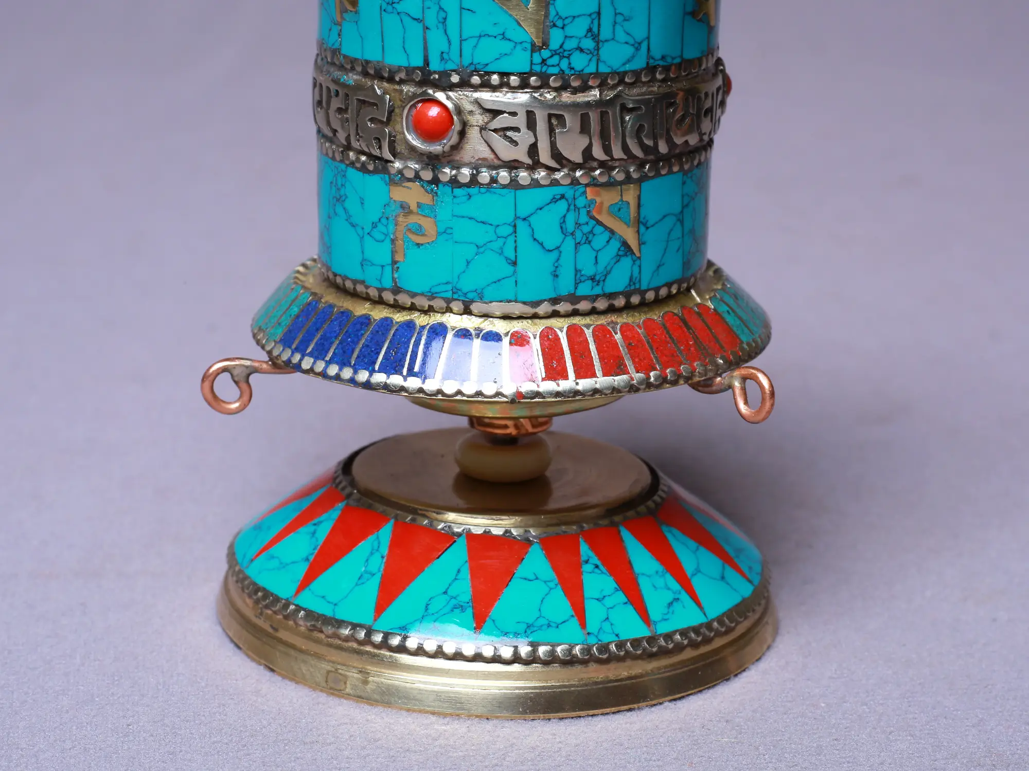 In Tibetan Buddhism, the prayer wheel itself is a symbolic representation of the Dharmachakra, the Wheel of Dharma, which symbolizes the teachings of the Buddha. The spinning motion represents the ceaseless cycle of life, death, and rebirth, while the prayers within aim to break free from this cycle and achieve enlightenment. The vibrant colors of the stones also hold profound meaning. Turquoise, often associated with the sky and protection, is believed to bring good fortune and ward off negative energies. Coral, with its fiery hue, represents compassion and vitality. Lapis Lazuli, often linked to royalty and spirituality, symbolizes wisdom and inner peace. The incorporation of these elements creates a miniature universe within the prayer wheel, reflecting the interconnectedness of all things. Spinning the wheel is a meditative practice, bringing mindfulness and focus to the act of prayer, allowing you to connect with the deeper meaning behind the mantras.