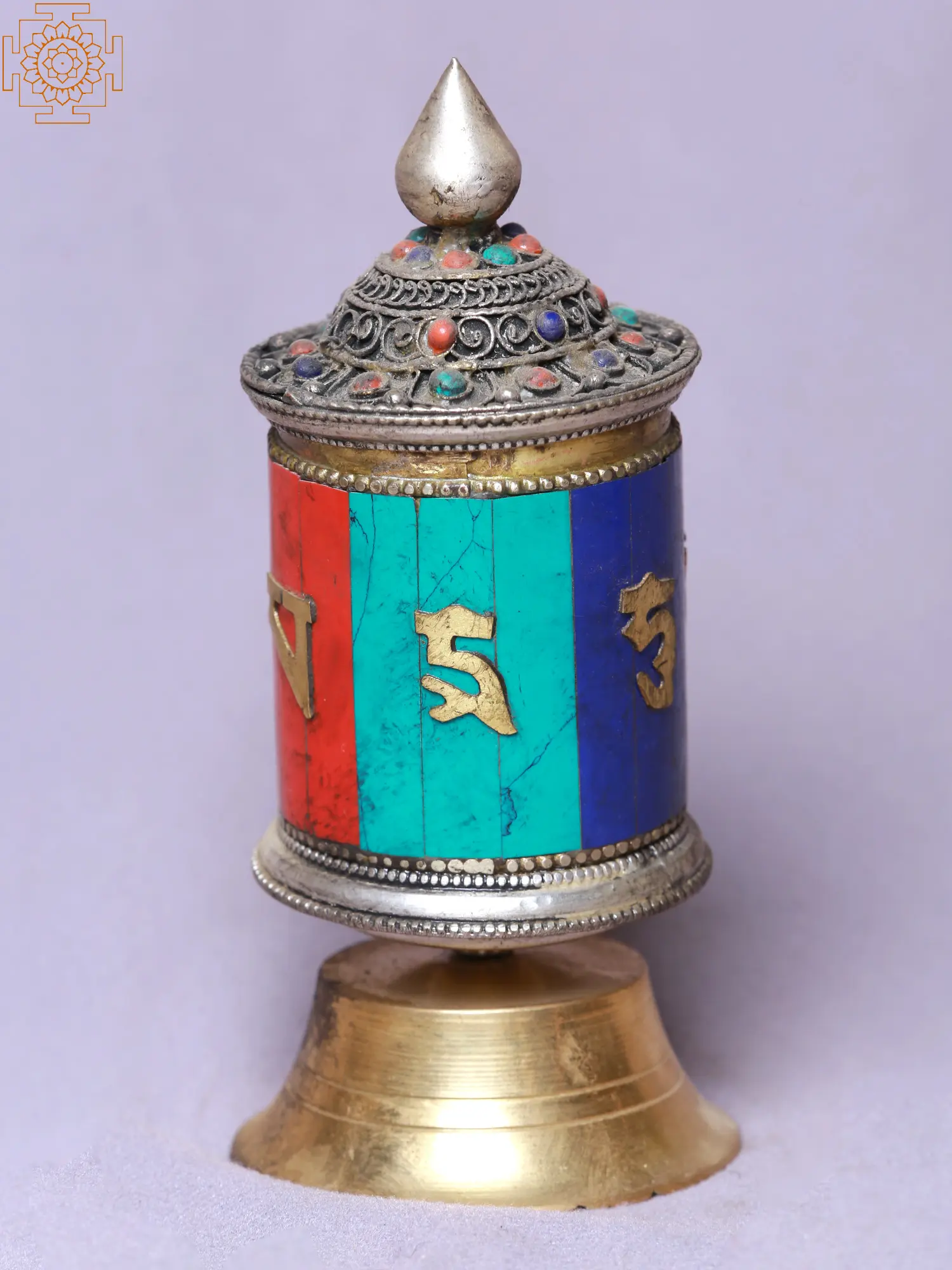 The cylindrical body of the prayer wheel is a vibrant mosaic of inlaid stones – deep blues, striking reds, and calming turquoise hues, each chosen for their inherent spiritual significance. Blue is often associated with the vastness of the sky and the tranquility of the ocean, symbolizing wisdom and purity. Red resonates with energy, vitality, and compassion, while turquoise embodies healing, protection, and good fortune. These colorful segments are interspersed with the sacred Sanskrit mantra "Om Mani Padme Hum," inscribed in a rich, golden hue. This mantra, central to Tibetan Buddhism, is a powerful invocation of compassion, wisdom, and the spiritual journey towards enlightenment. The dedication to these sacred syllables transforms the act of spinning the wheel into a profound meditative practice.