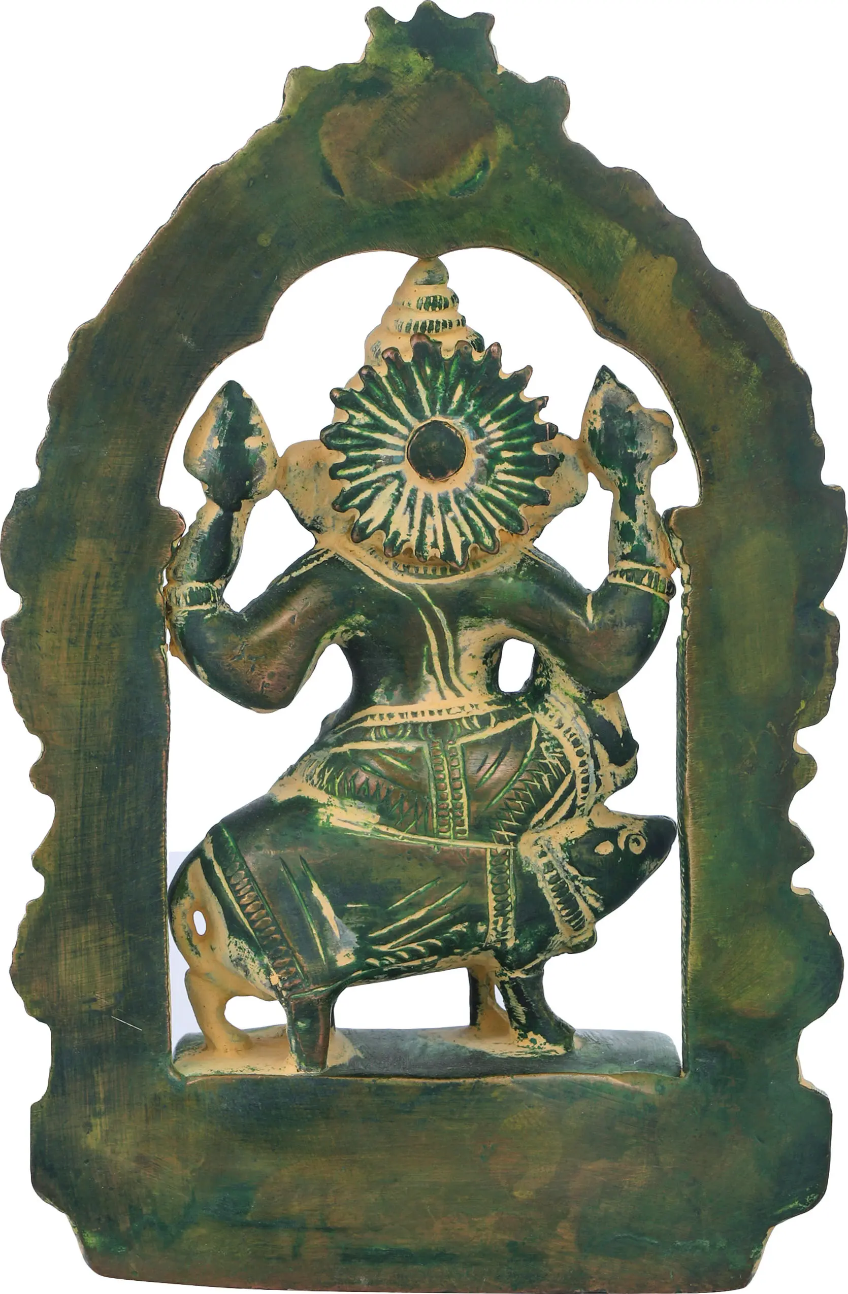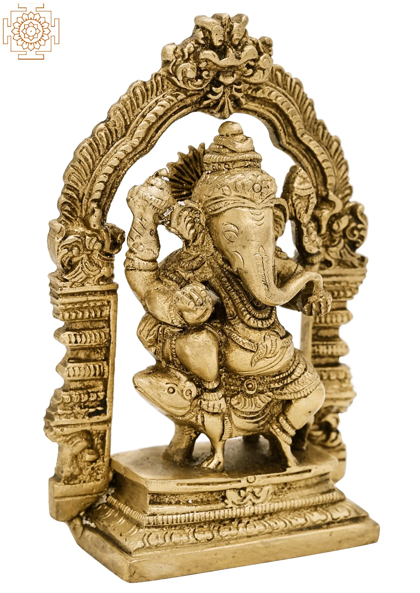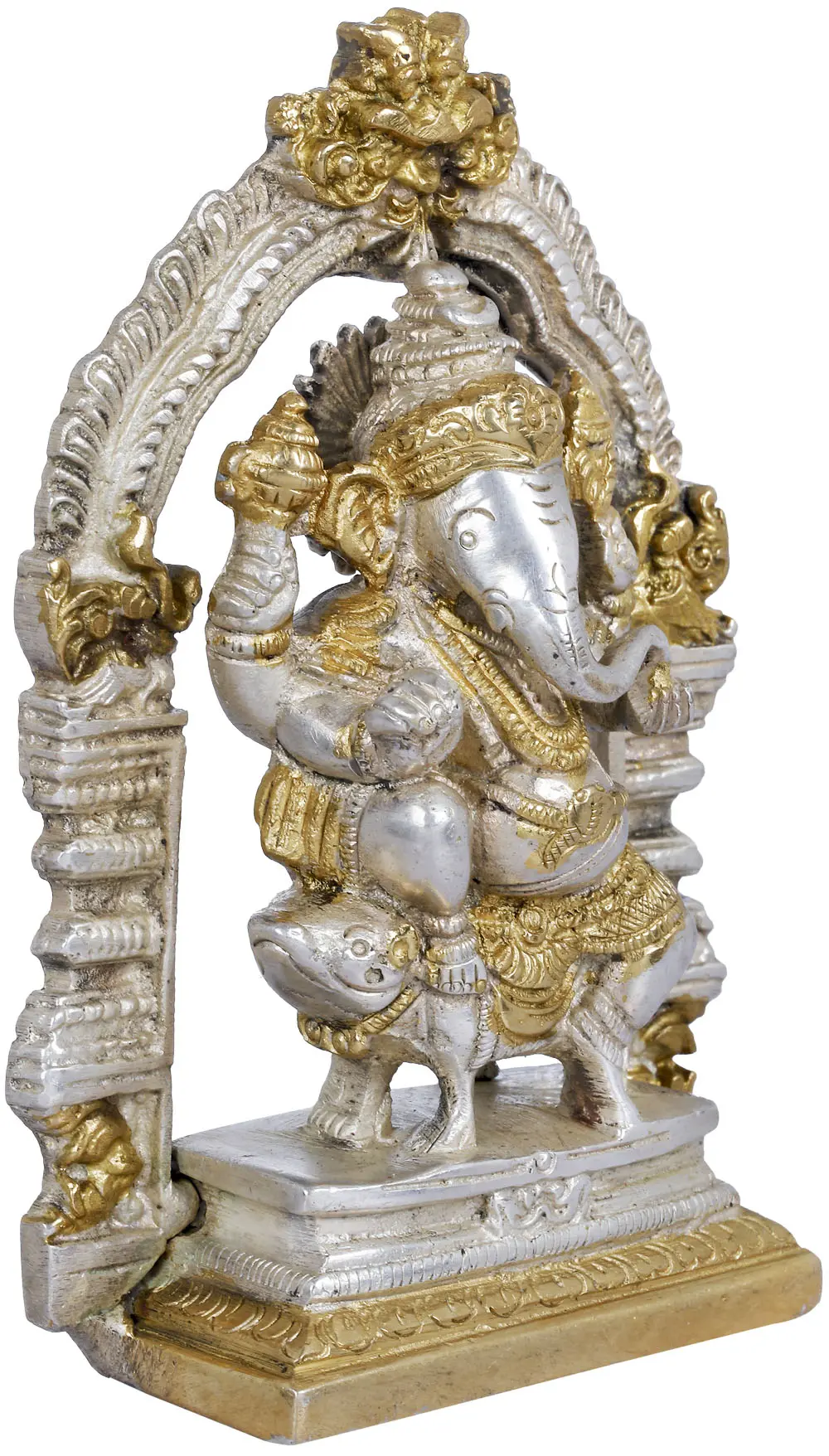 In this sacred brass portrayal, Lord Ganesha sits gracefully upon Mushaka, embodying divine wisdom and intellect. He is carrying a goad and a noose, symbolizing his power to lead seekers on the righteous path. The broken tusk is a tribute to his humility and sacrifice in recording the Mahabharata. Encircled by the Kirtimukha throne, Ganesha’s presence exudes protection and blessings. The serpent around his belly is associated with divine energy (Kundalini), signifies Ego, which Ganesha subdues, highlighting his wisdom in controlling one’s desires and emotions. This divine temple Ganesha is a cherished emblem of spirituality and artistry and serves as a powerful reminder of seeking blessings and guidance on life’s journey.