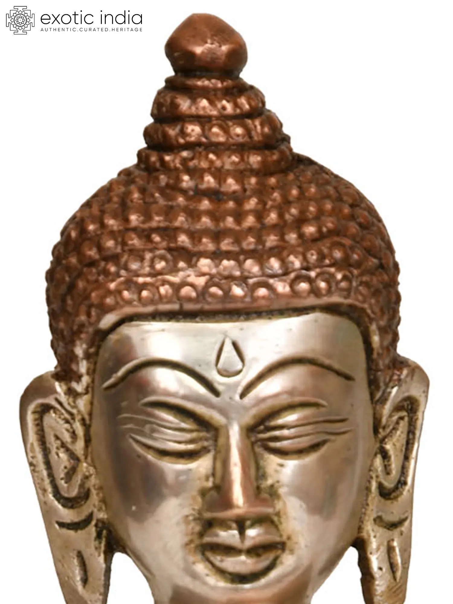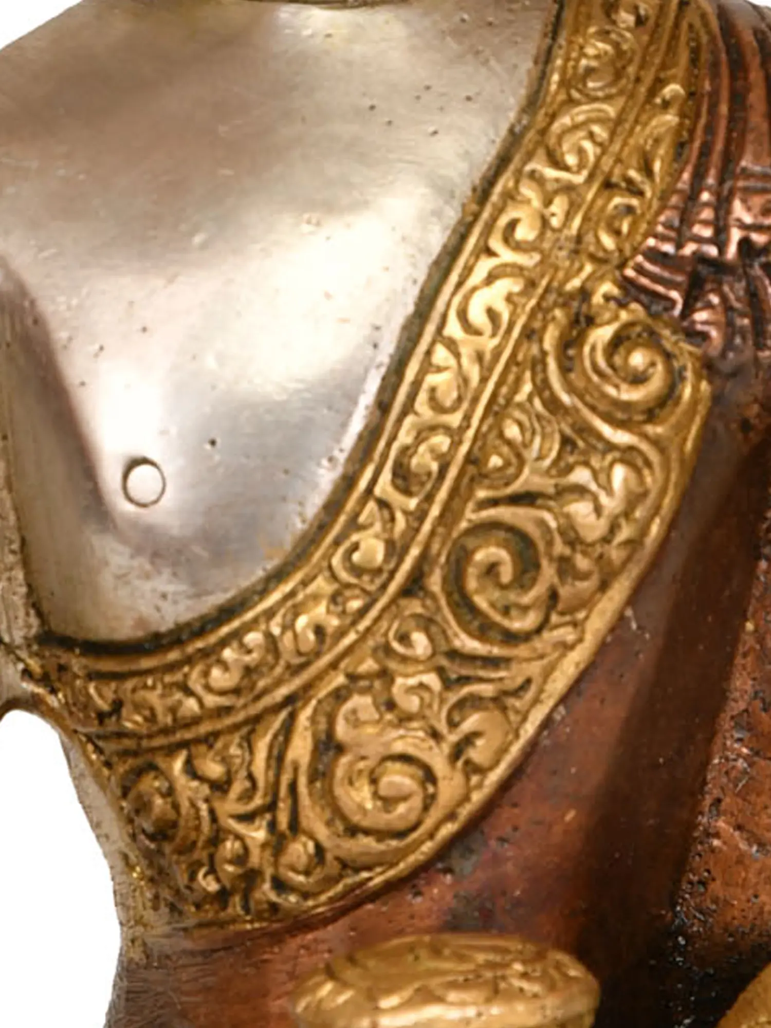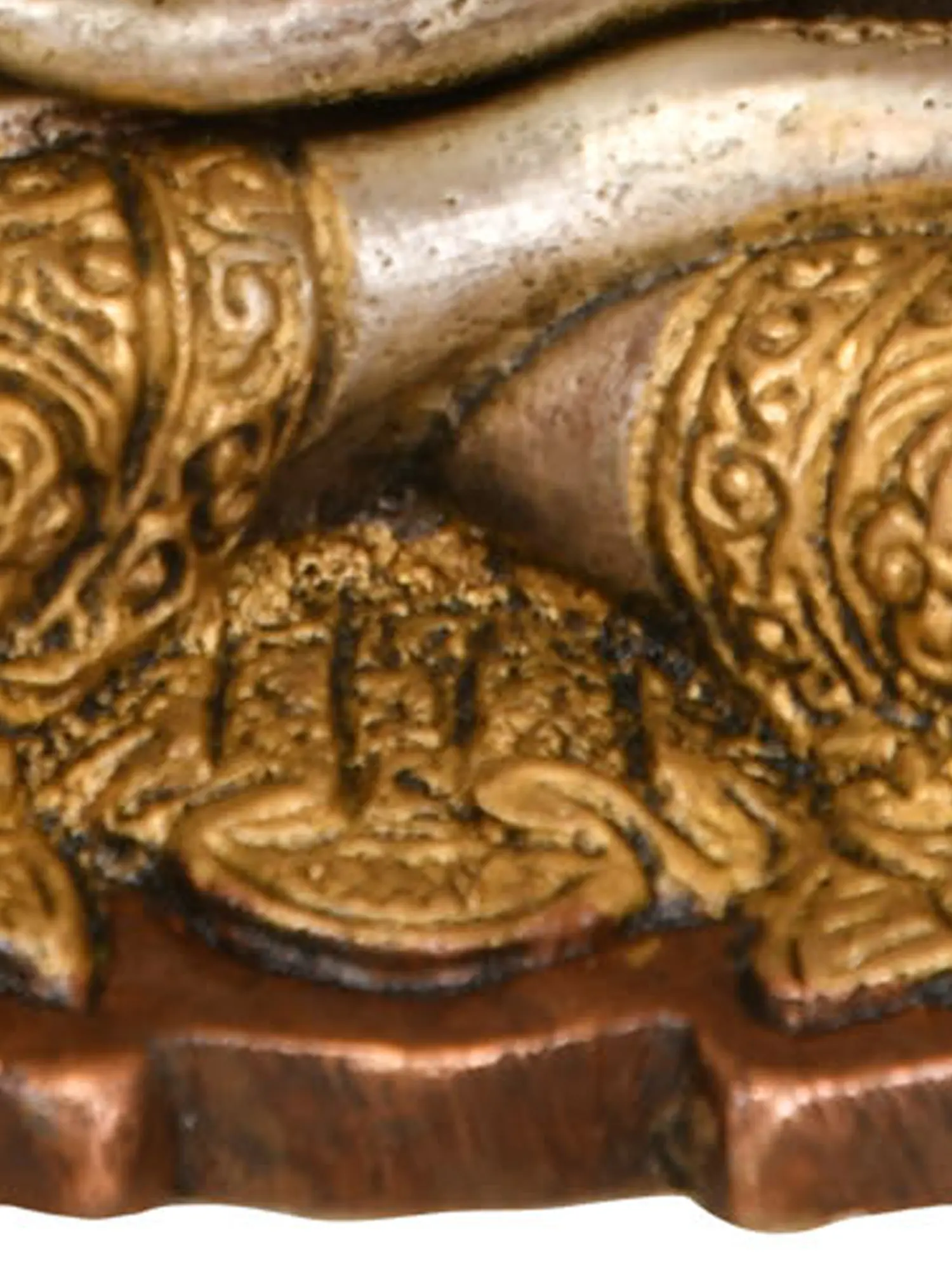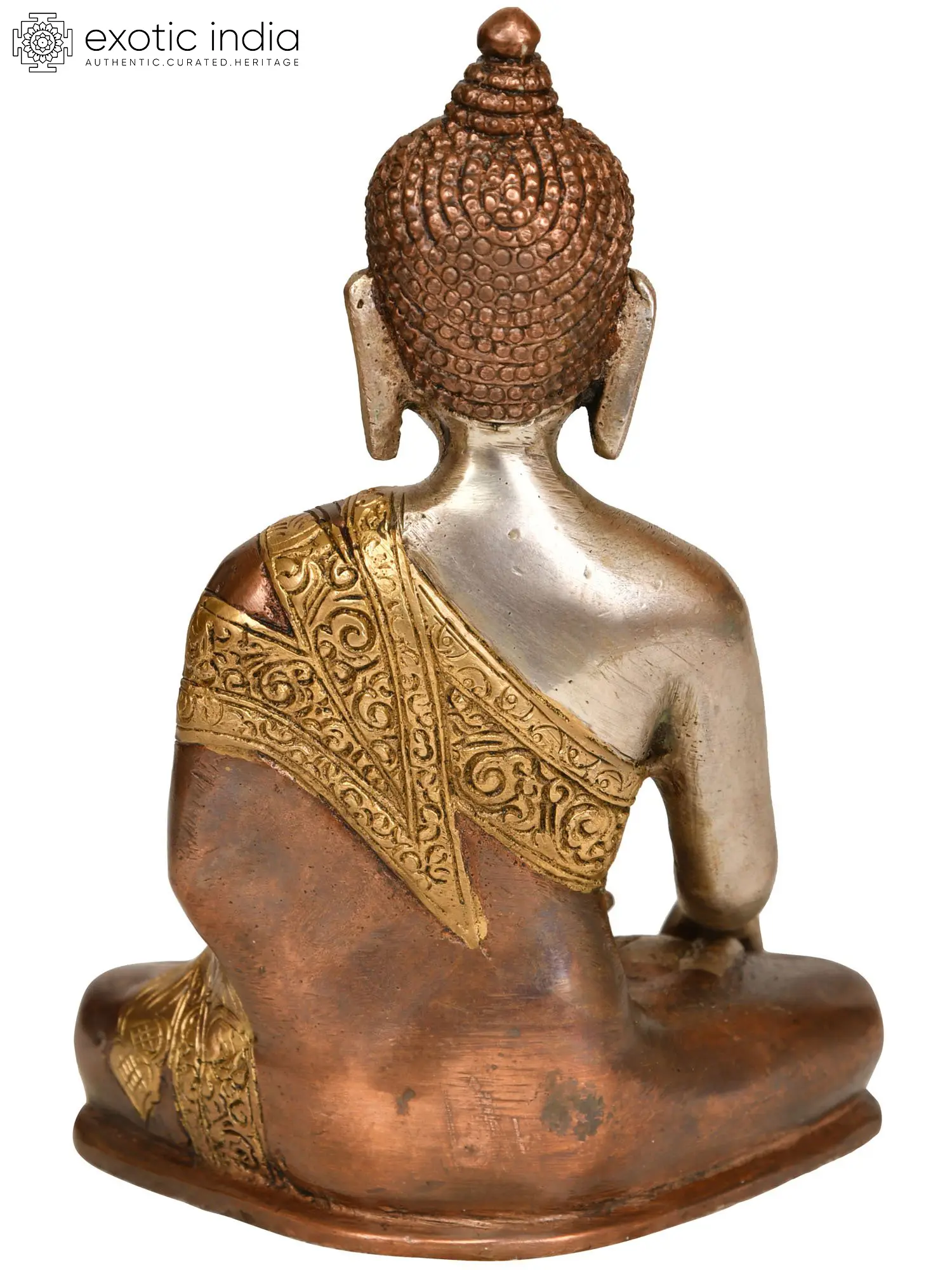 Handcrafted with meticulous attention to detail in India, this statue is a testament to the enduring skill of traditional artisans. The use of brass, a metal revered for its durability and lustrous sheen, ensures that this piece will grace your space for generations to come. The artist has masterfully rendered the serene countenance of the Buddha, his eyes cast downwards in deep contemplation, radiating an aura of peace and tranquility. The intricate detailing of his monastic robe, embellished with ornate patterns, further enhances the aesthetic appeal of the sculpture. The contrasting metallic finishes create a visually striking effect, highlighting the divine presence of the enlightened one.