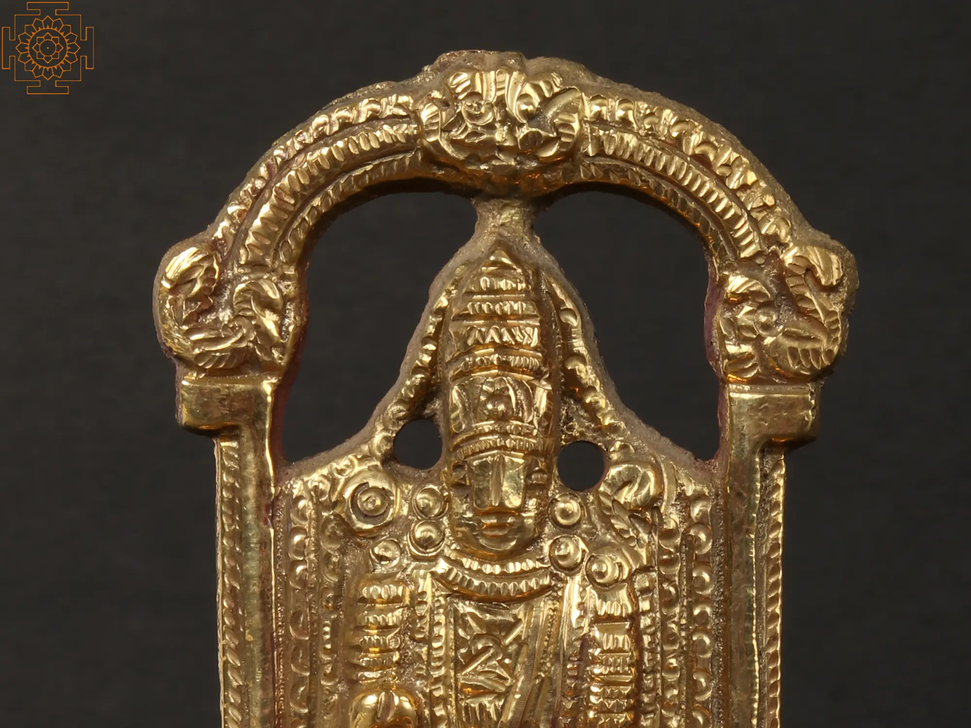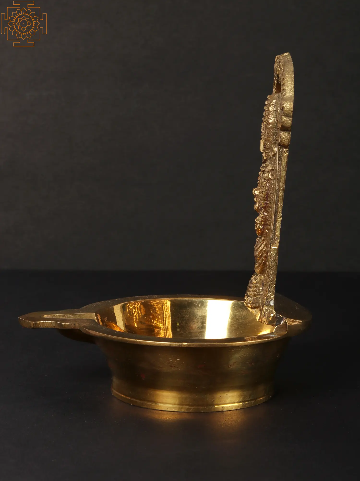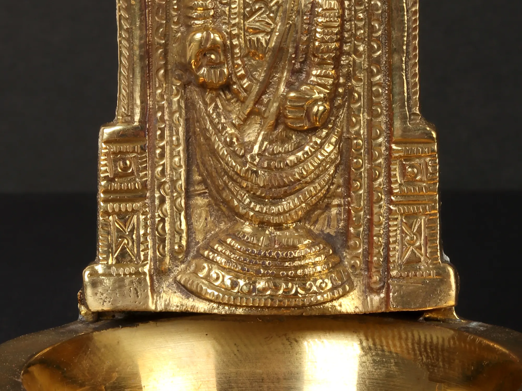 This brass lamp with the image of Lord Balaji on the crown is a typical Mada Vilakku or Wall Niche Lamp. The structure of the lamp traditionally consists of one broad and deep oil basin with a crown or backbone consisting of images of Gods and Goddesses. Here Lord Balaji’s image is shown blessing his devotees. The basic idea behind this lamp is to provide the devottes with the blessings of Lord Balaji assisted with the warmth of the lamp. It is advisable to light the lamp during sunrise and sunset to get blessed by Lord Balaji.