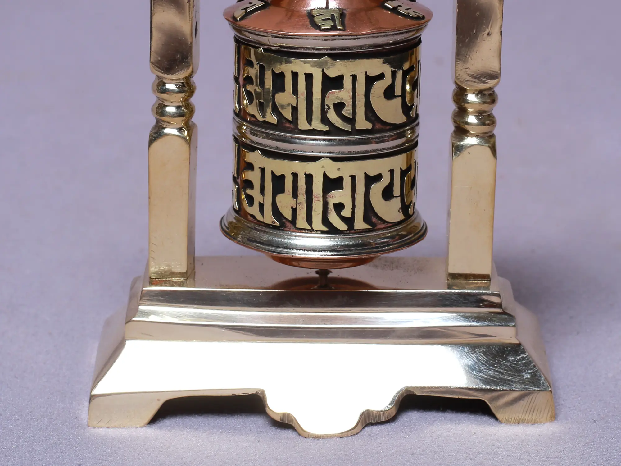 Handcrafted by skilled artisans in Nepal, this prayer wheel showcases the rich heritage of Tibetan Buddhist art. The use of copper for the inner cylinder highlights the metal's purifying and conductive properties in spiritual practices. The surrounding brass structure offers stability and a gleaming aesthetic, reflecting the light and the auspicious intentions of the user. The craftsmanship is evident in the precision of the engraving and the harmonious balance of the design, making it a truly special piece for any altar, meditation space, or home.