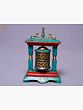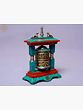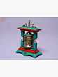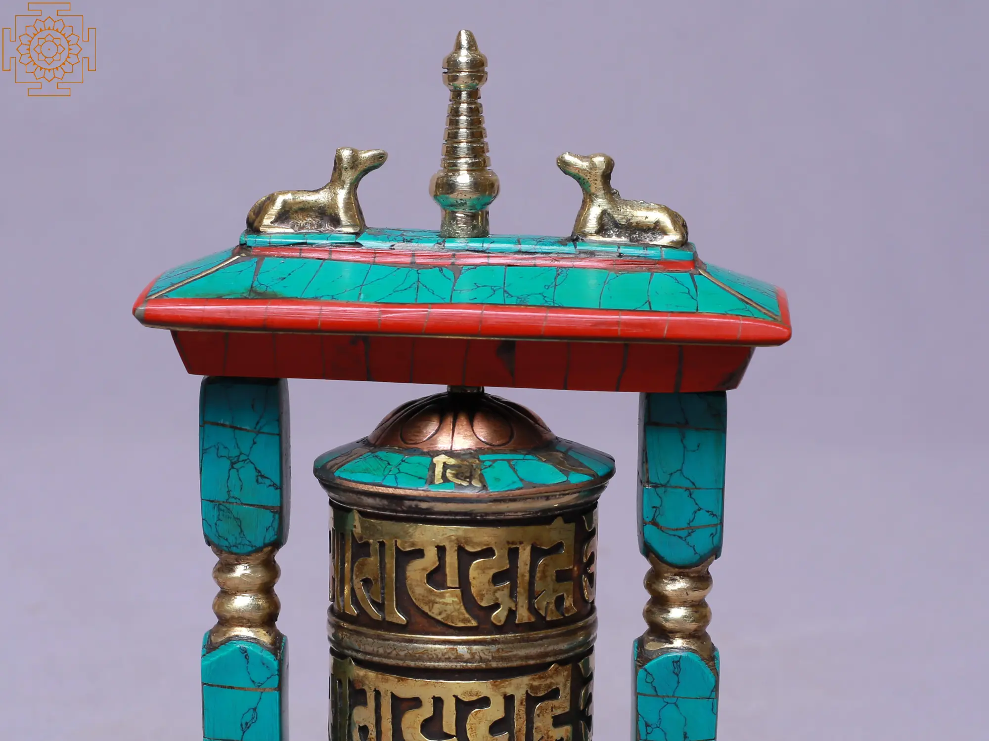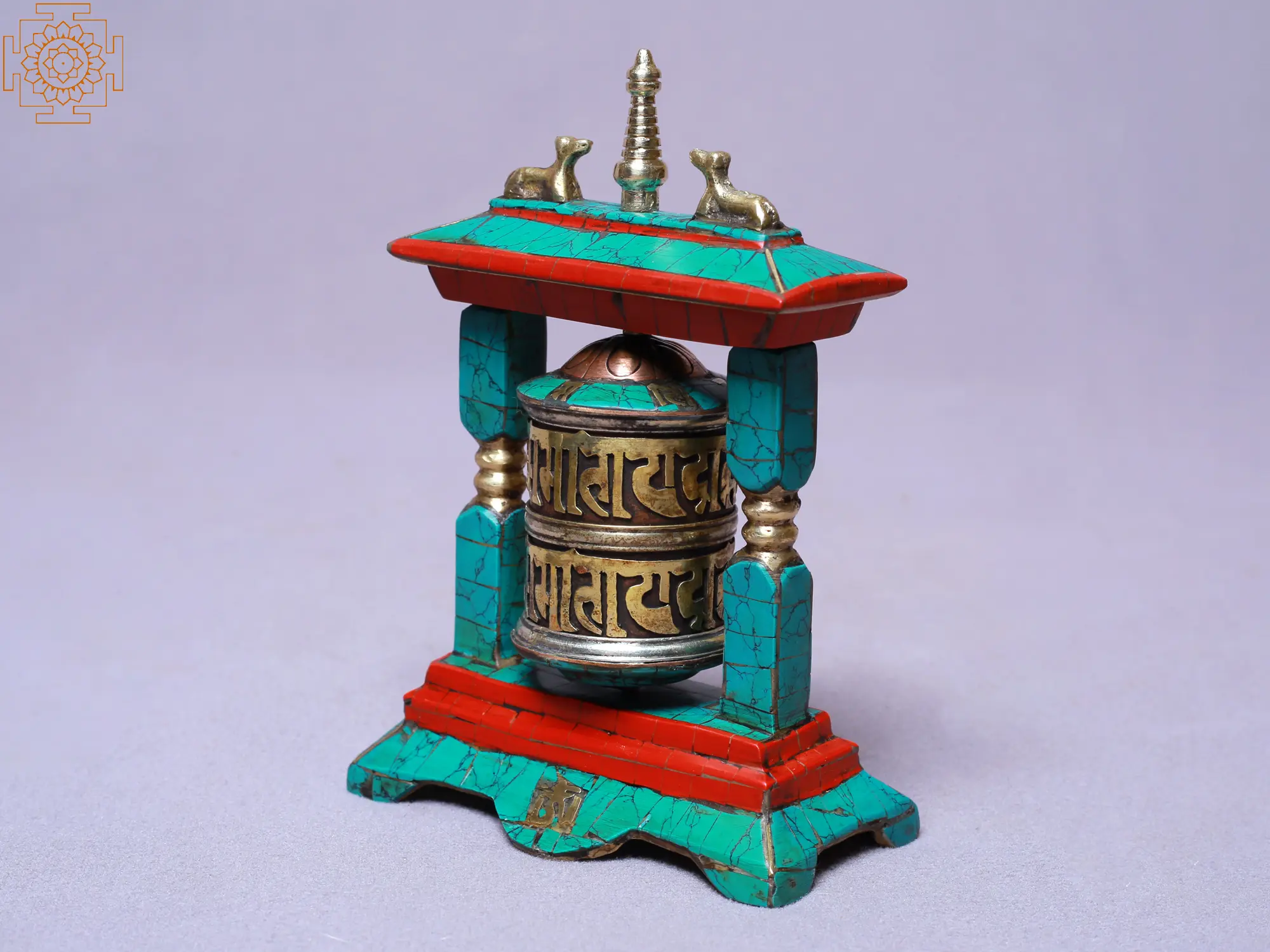 The design of this prayer wheel is rich with cultural and symbolic meaning. The two guardian lions that adorn the upper roof are powerful symbols in Buddhist iconography, representing strength, protection, and the warding off of negative forces. They stand watch, mirroring the vigilant nature of deities and protector spirits found in Tibetan art. The tiered spire atop the structure evokes the stupa, a sacred monument that embodies the Buddha's enlightened mind and serves as a focal point for devotion and meditation. The turquoise inlay, reminiscent of the sky and the vastness of the universe, is associated with healing, wisdom, and protection, while the red accents symbolize life, energy, and passion.