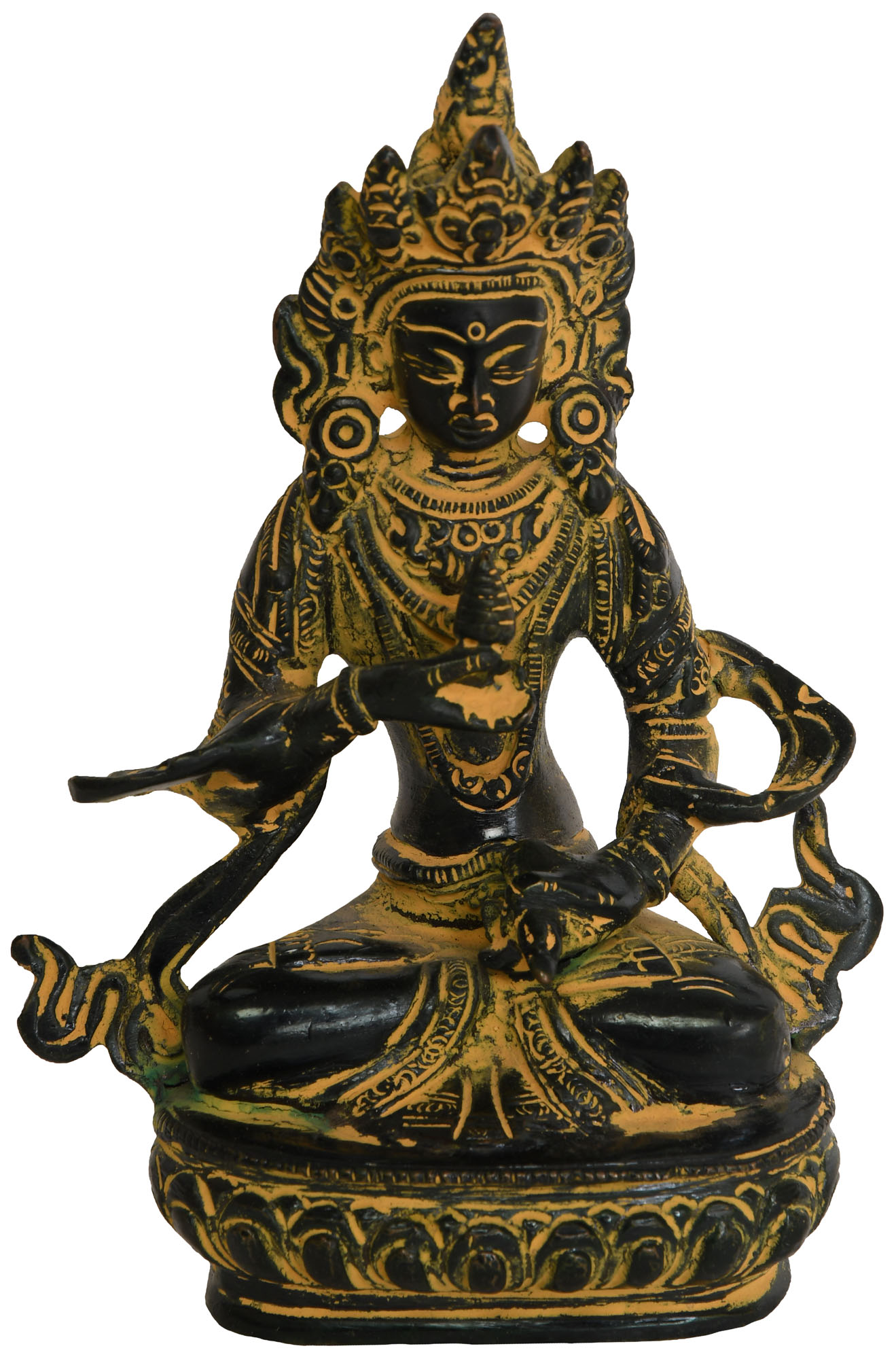 In Tibetan Buddhism, Vajrasattva is a prominent deity who personifies purity and spiritual cleansing. Vajrasattva holds a vajra (thunderbolt) in his right hand, representing the unshakable nature of enlightenment, while his left-hand cradles a bell, symbolizing the wisdom that resonates throughout the universe. Adorned with precious jewels and ornaments, he embodies the richness of spiritual treasures. His serene expression and meditative posture reflect inner peace and the attainment of enlightenment. Vajrasattva’s visual representation signifies the profound purification of the mind, purging impurities, and liberating beings from suffering through compassion and wisdom. Made with meticulous care, this brass sculpture invites you to experience the transformative power of compassion and wisdom.