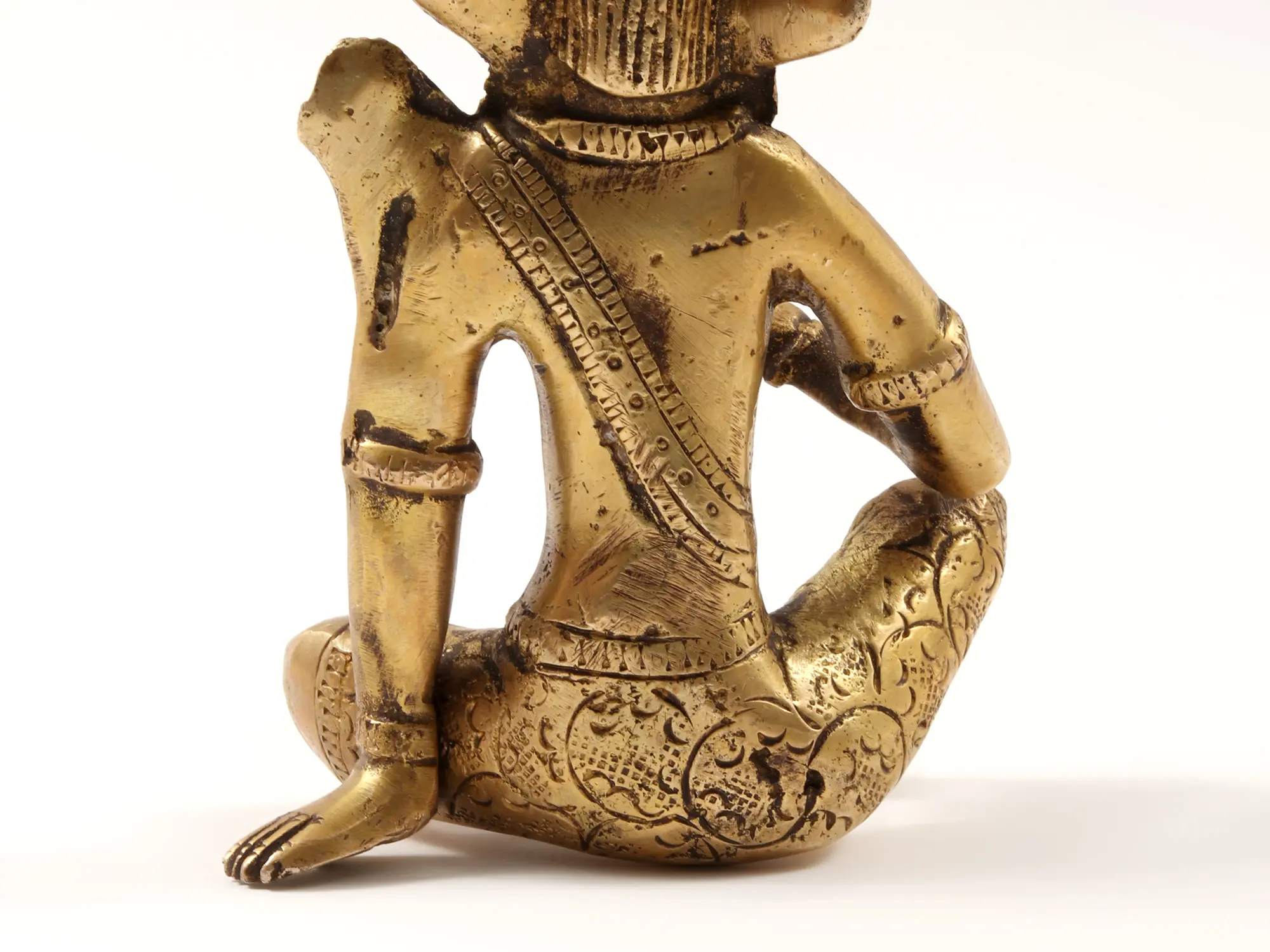 This brass statue here depicts the Vedic God Indra, the ruler of the heavens and controller of natural forces. With his vajra (thunderbolt) in hand, he embodies the power of transformation and renewal. The deity's presence sends a message to the worshippers that life is filled with wondrous mysteries, waiting to be explored and understood. Just as Indra commands the forces of nature, devotees often find themselves strong enough to tap into their inner strength and wisdom, navigating the ever-changing tides of life with resilience and the wonder of a curious heart.