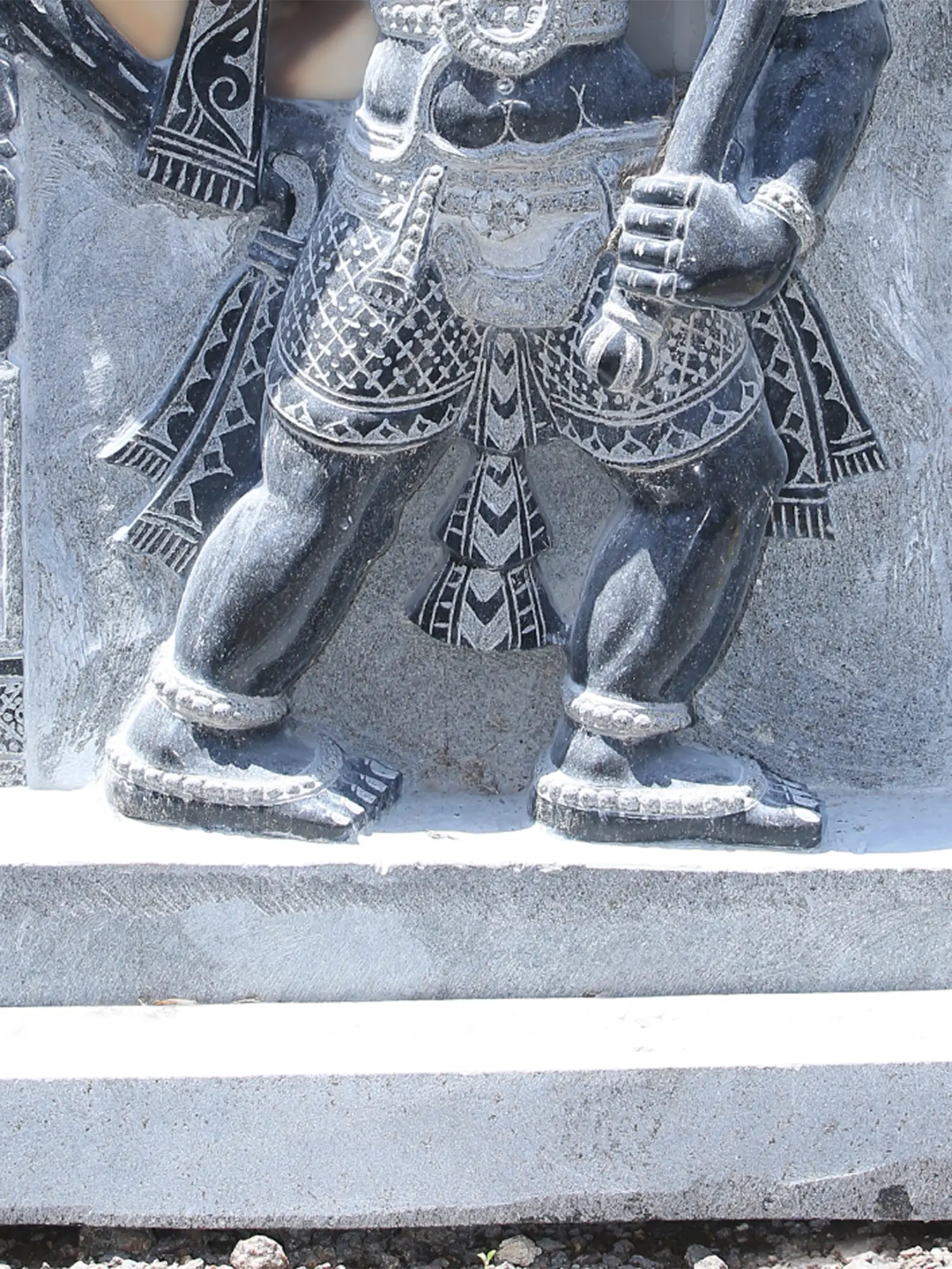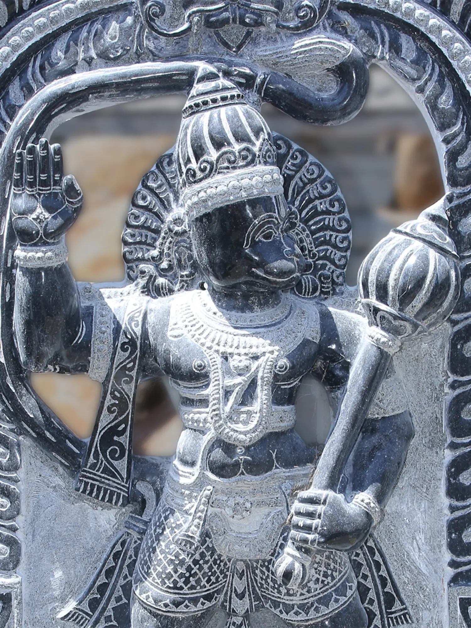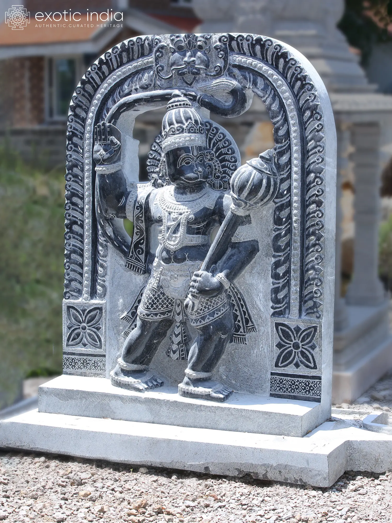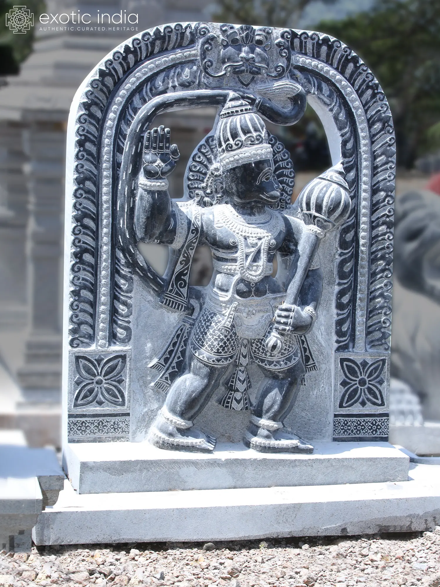 The statue of Lord Hanuman blessing Mudra with mace, meticulously sculpted from black granite stone, radiates strength, devotion, and protection.