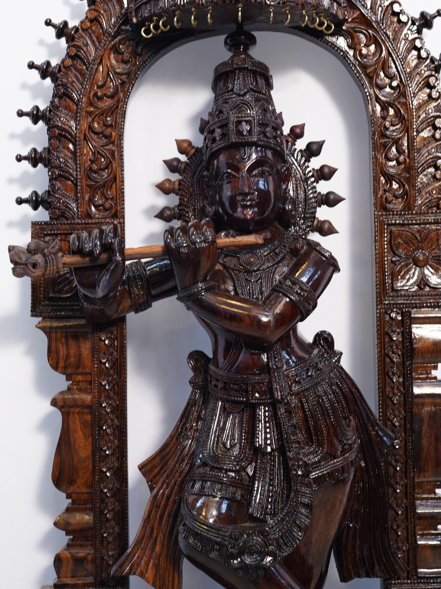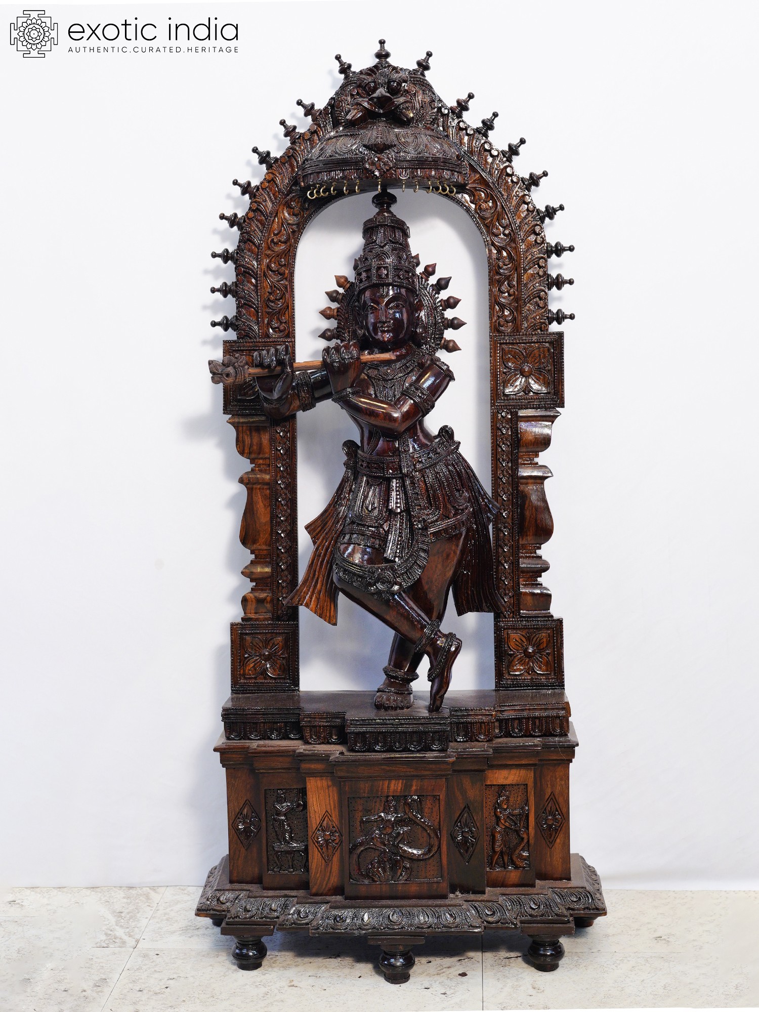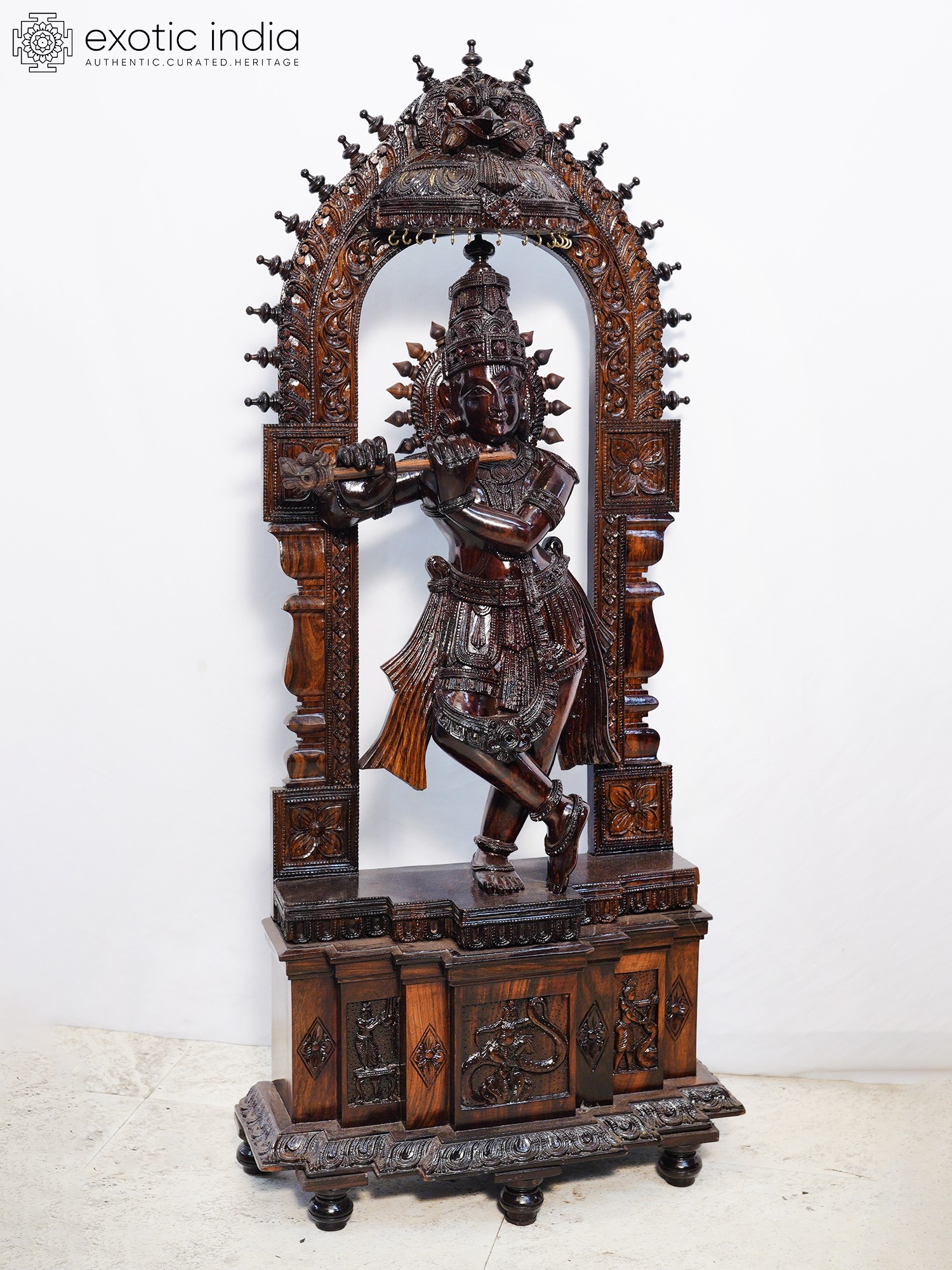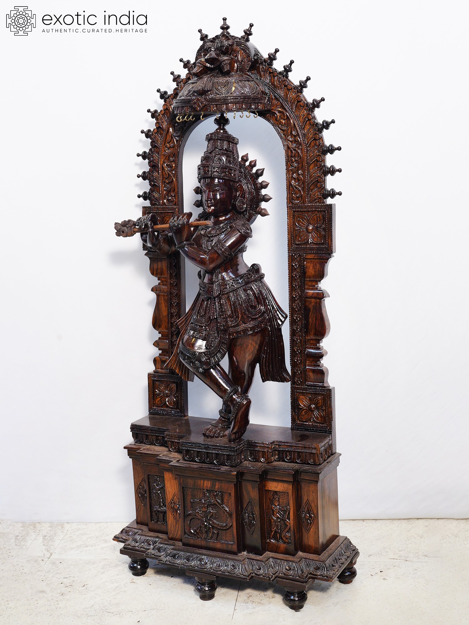 31" Large Fluting Lord Krishna Standing on Kirtimukha Throne | Wood Carved Statue