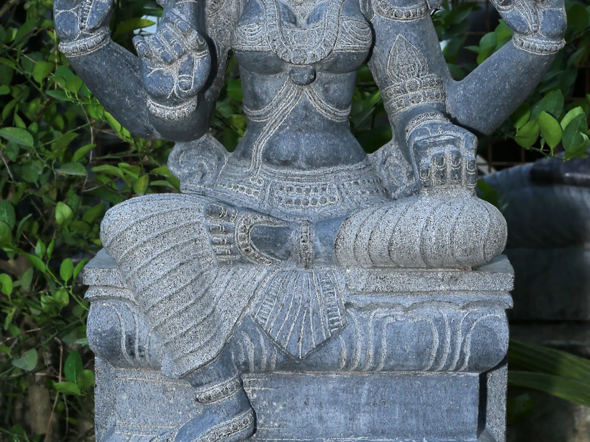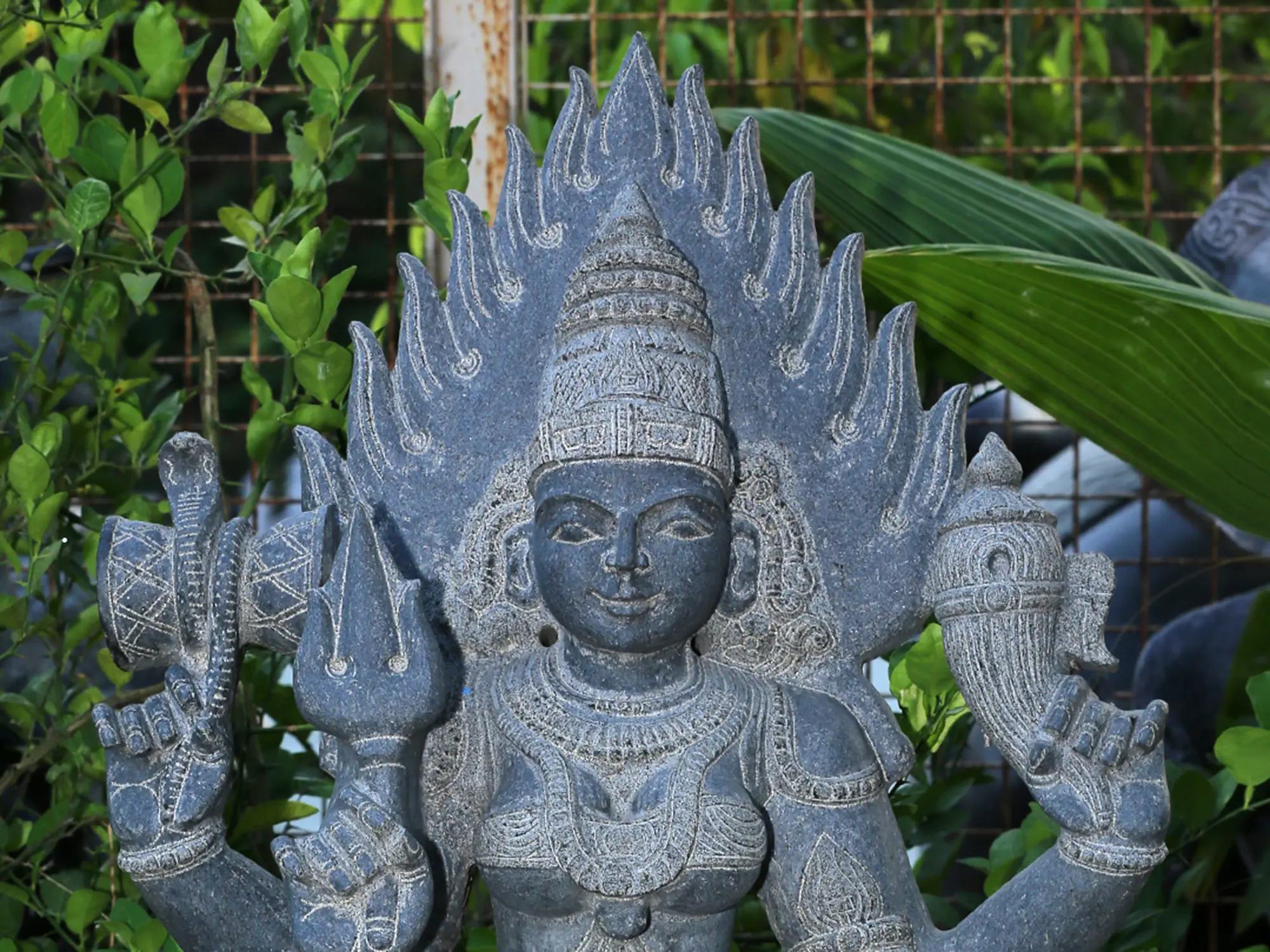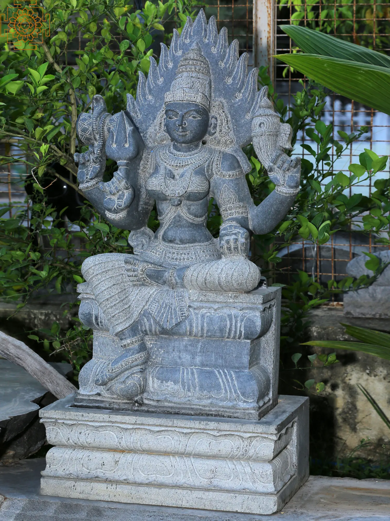 A representation of power and defence, this large Goddess Mariamman statue is made of superior hard granite stone. It is expertly crafted with careful attention and shipped by sea overseas. It radiates heavenly energy and inspires awe and devotion. It infuses your environment with harmony, healing, and heavenly grace.
