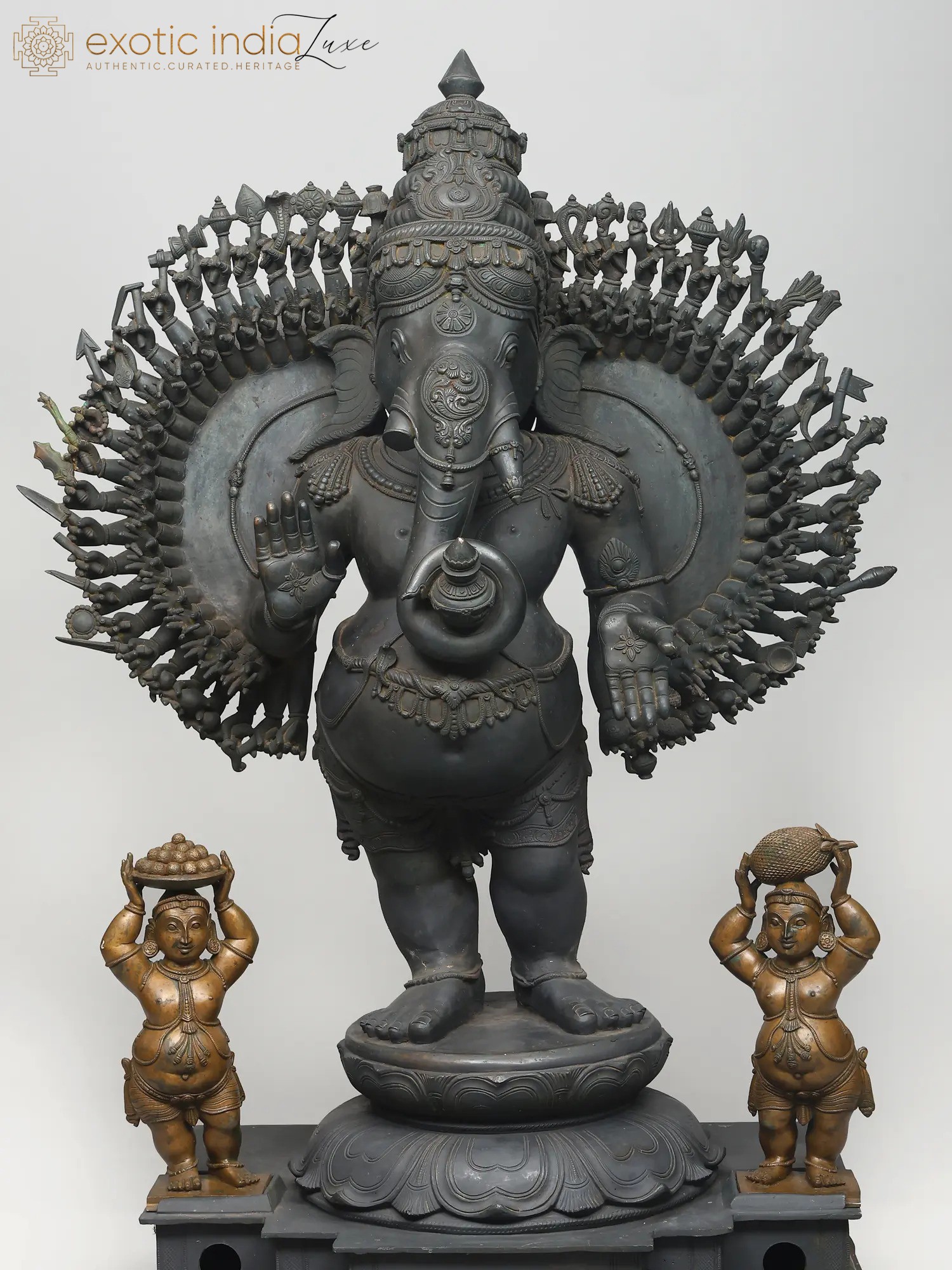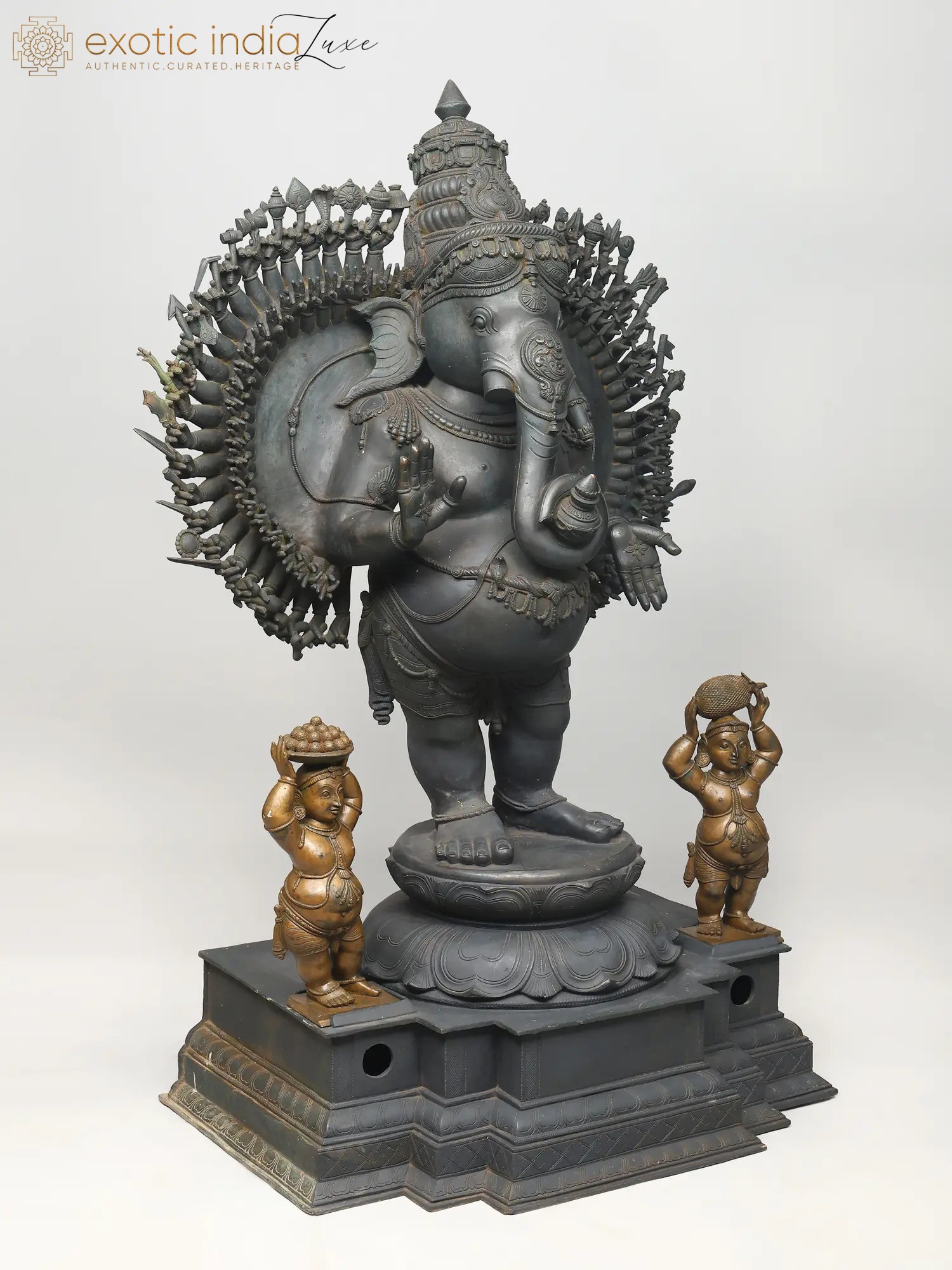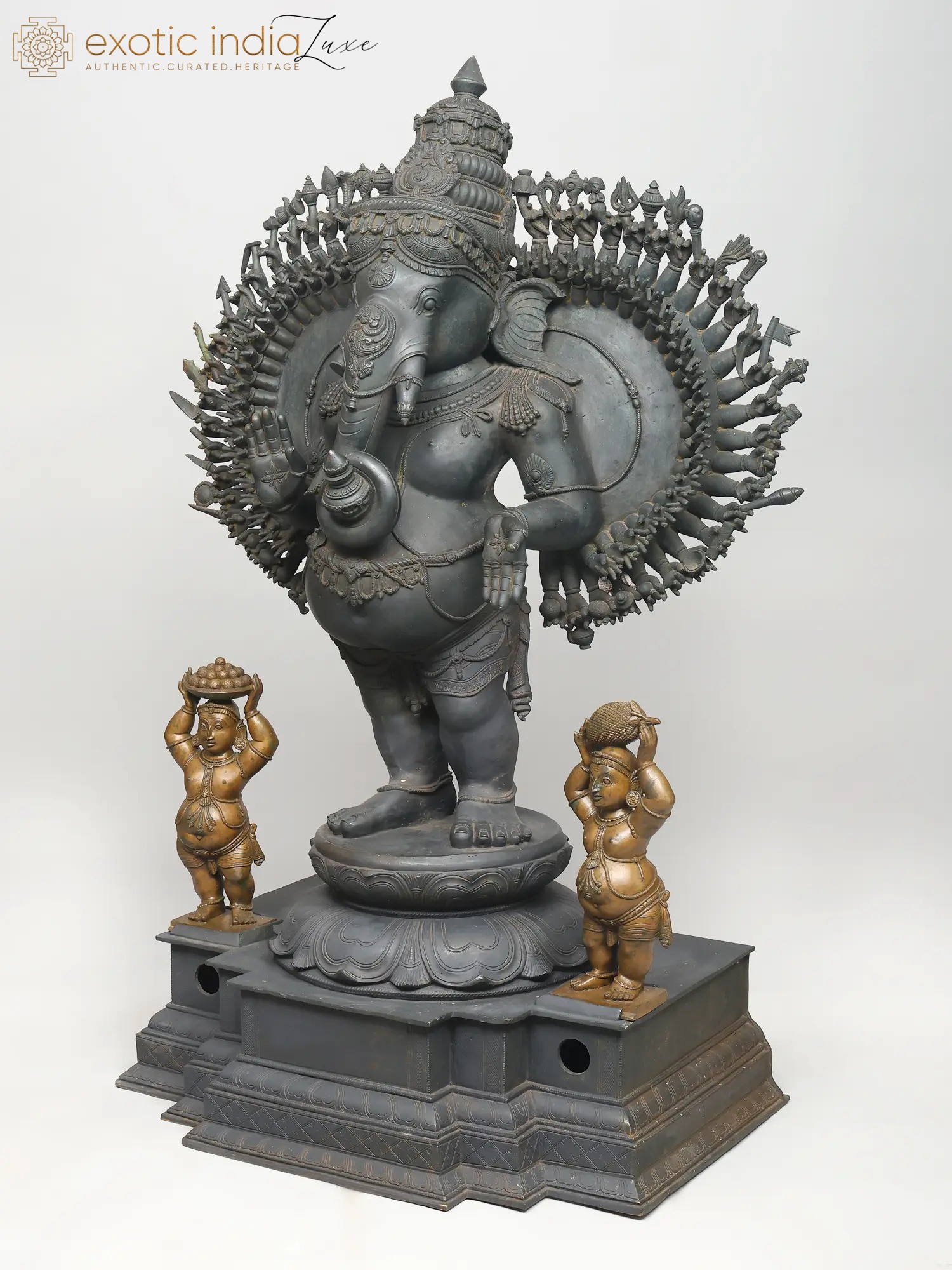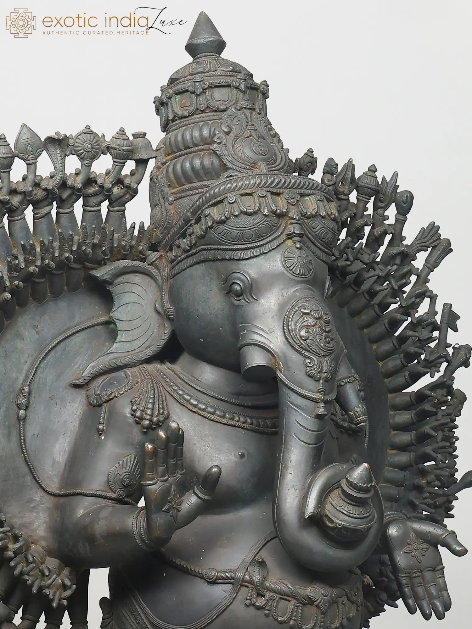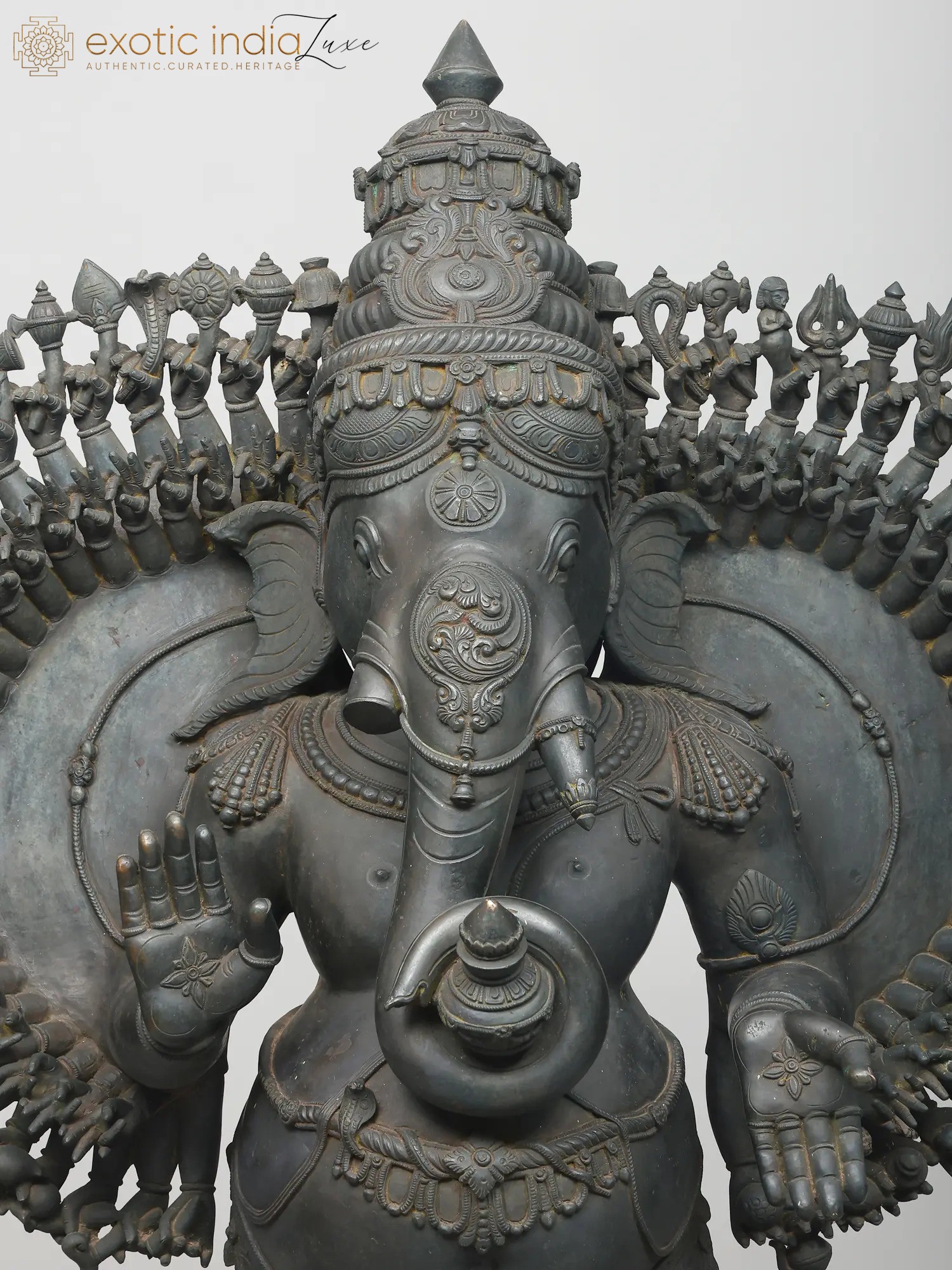 Ganesha’s two prominent forehands are in the two gestures of ‘abhaya’ and ‘varada’ – the right hand dispels fear from the hearts of the devout and the left-hand grants boons to the righteous. Two distinct groups of hands can be ascertained behind Ganesha. The inside circle of hands does not carry any attribute, but their gesture of being in the ‘kartarimukha’ – that which holds an attribute between the index and the middle figure – acknowledges their symbolic idea. The outer rim of hands carries his attributes, and these include the goad, mace, trident, lotus, noose, flag, sword, musical drum, war discus, conch, bow and arrow, others.