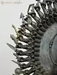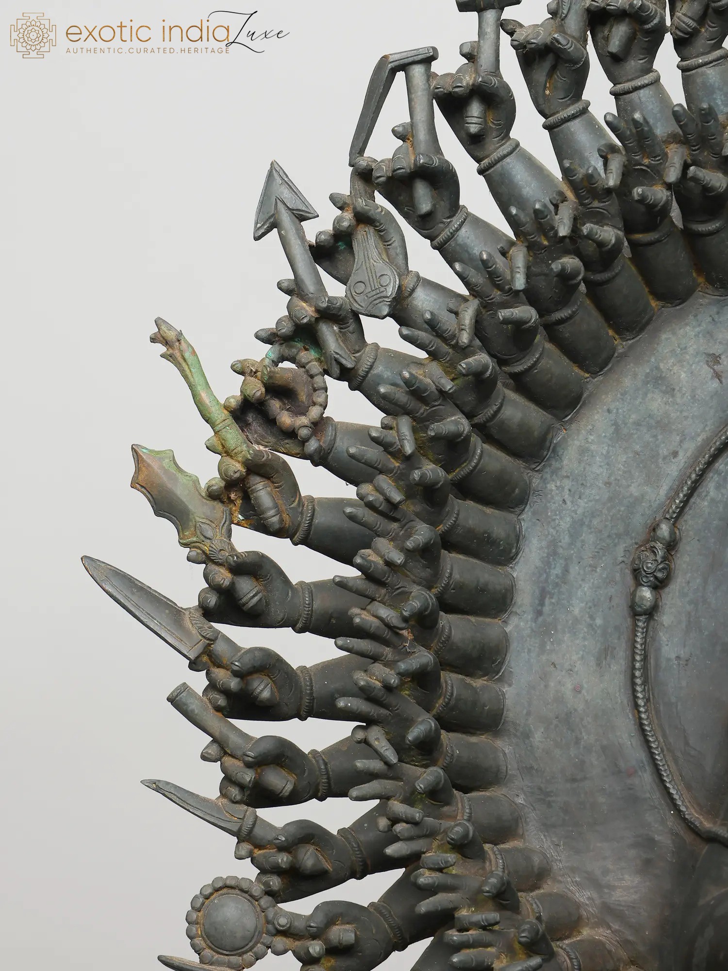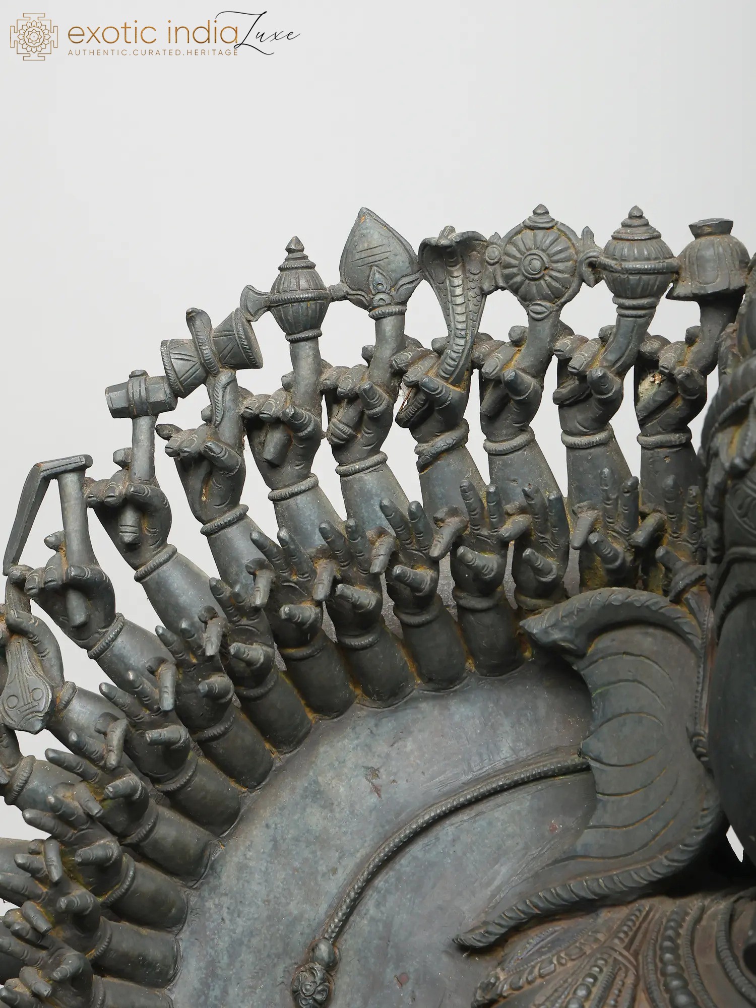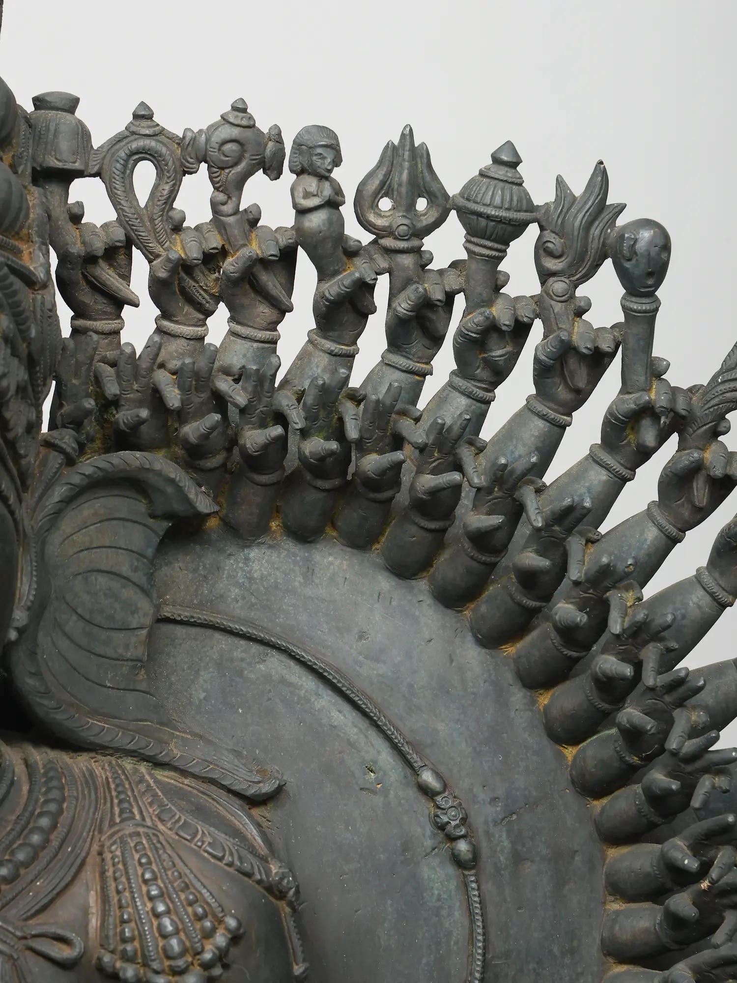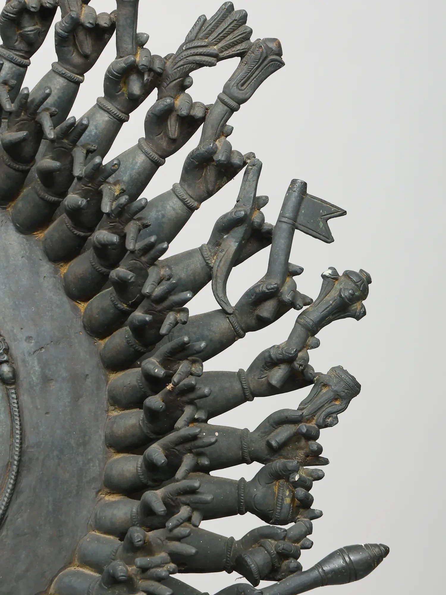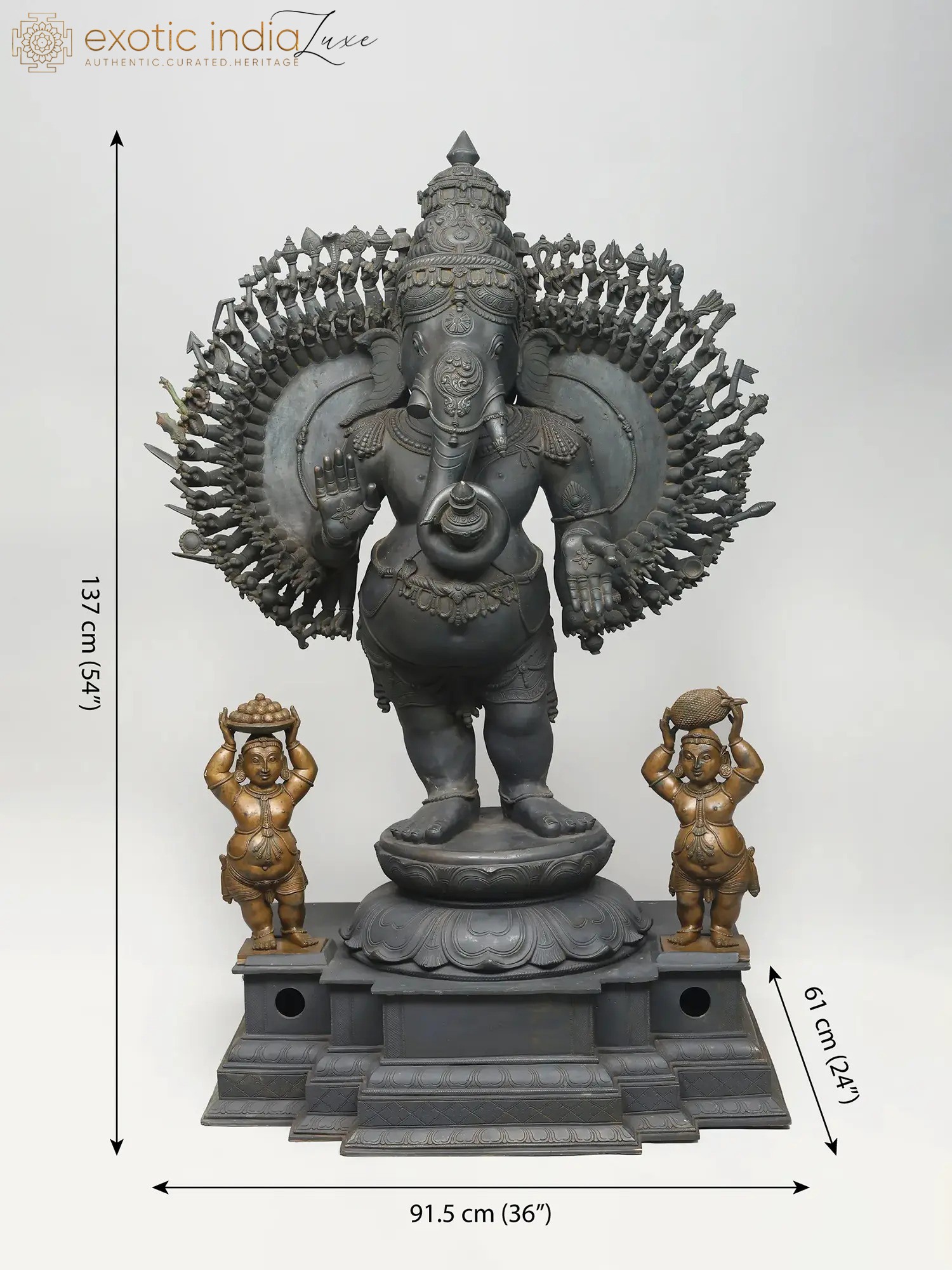 Ganesha’s two prominent forehands are in the two gestures of ‘abhaya’ and ‘varada’ – the right hand dispels fear from the hearts of the devout and the left-hand grants boons to the righteous. Two distinct groups of hands can be ascertained behind Ganesha. The inside circle of hands does not carry any attribute, but their gesture of being in the ‘kartarimukha’ – that which holds an attribute between the index and the middle figure – acknowledges their symbolic idea. The outer rim of hands carries his attributes, and these include the goad, mace, trident, lotus, noose, flag, sword, musical drum, war discus, conch, bow and arrow, others.