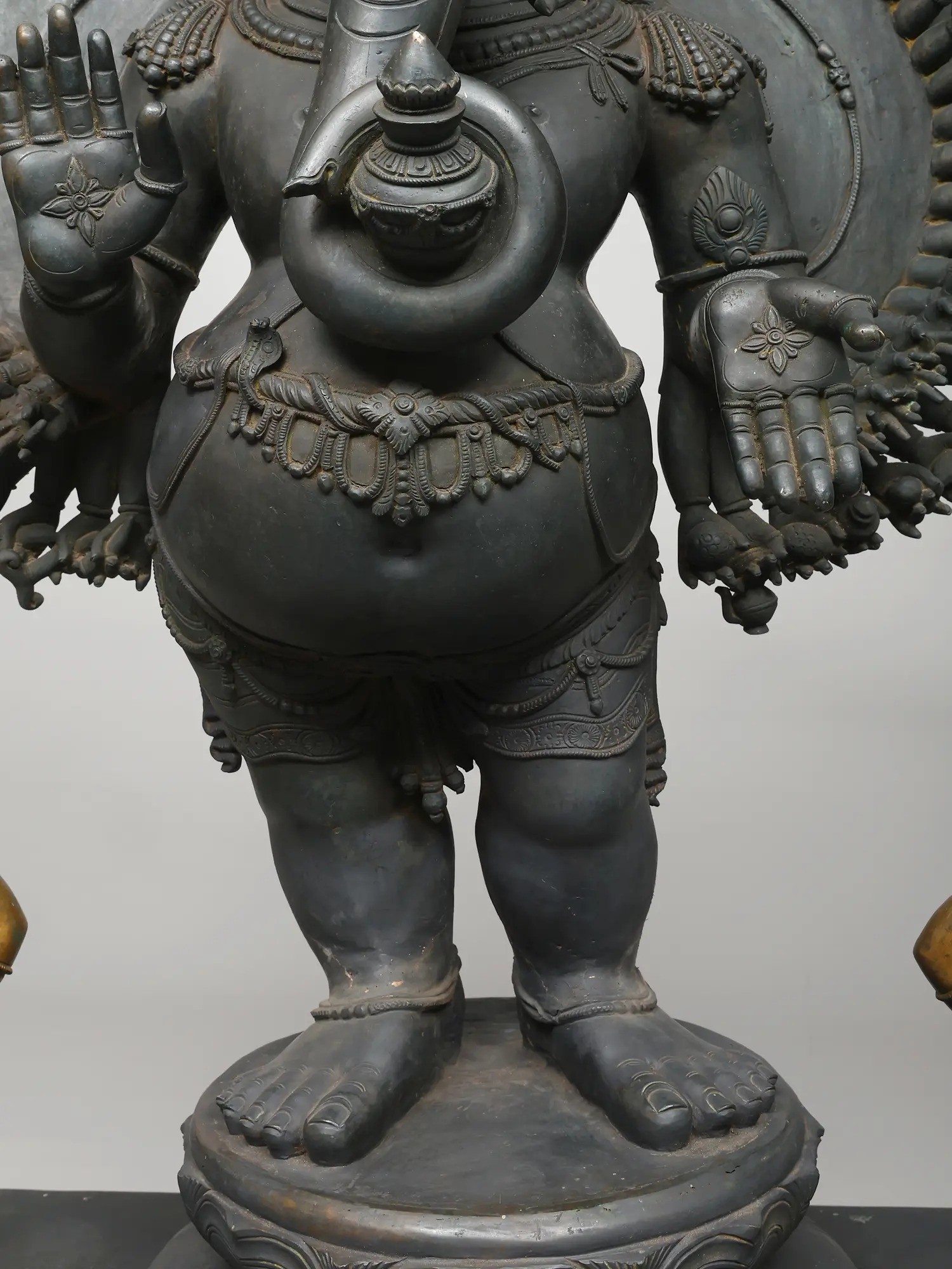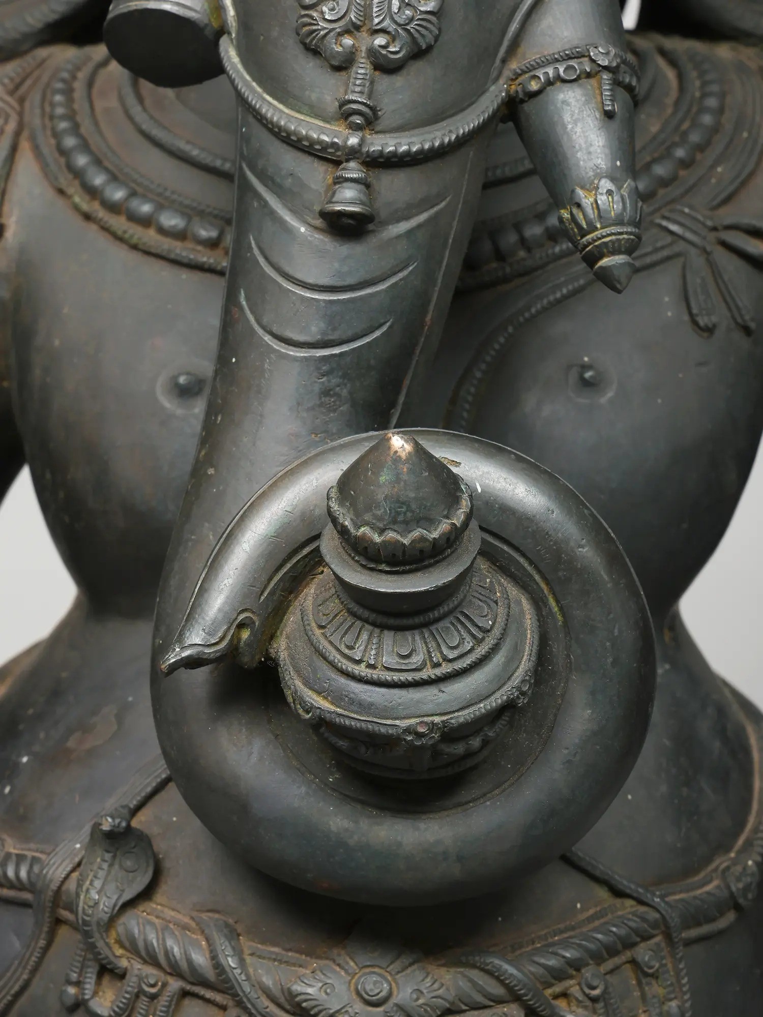 The central figure of the divine zoo-anthropomorphic, elephant-headed god exquisitely staggers belief and minutely presents every single attribute associated to Ganesha. Standing on a double-lotus pedestal, he adorns an elaborate, multi-tiered ‘mukuta’ along with distinct jewellery and tassels spread over his shoulders, belly, and feet. A large ‘prabhamandala’ is attached to the back of the ‘mukuta,’ symbolising his divine halo. A diaphanous ‘dhoti’ covers his thighs. Ganesha’s iconic trunk is curled around a jar of ‘amrita’ or elixir, the sweet nectar of the gods that was procured during the ‘samudra manthan’ – the great churning of the ocean. Moreover, the fact that Ganesha’s trunk is curled to the left is also symbolic, for that represents the blissful and peaceful qualities of the Moon and signifies material gains and prosperity. Another element of the trunk is the absence of one of his tooth/tusks – an episode from when he purposely broke it to use as a writing instrument for completing the manuscript of the Mahabharata that sage Vyasa was narrating (the ‘Ekdanta’ aspect of Ganesha has various legends associated with it).