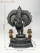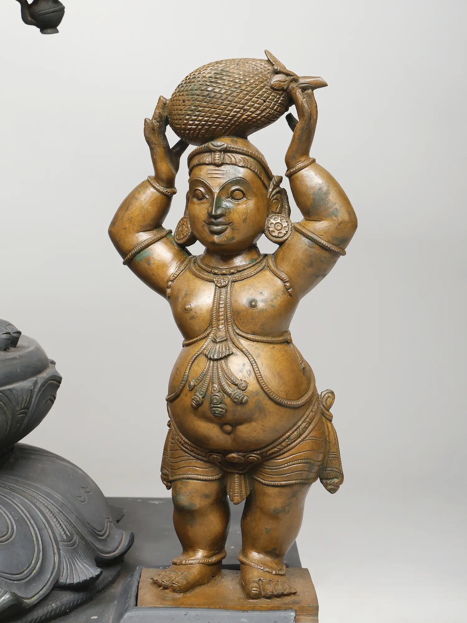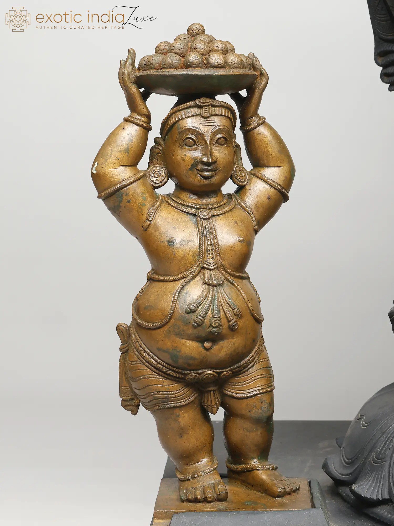 The totality of this sculptural masterpiece is a triad of three figures standing proud on an elaborately raised pedestal. The two flanking pot-bellied figures carry a basket of twenty-one ‘modak,’ a sweet famously favoured by Ganesha as ‘Modarpriya,’ and a large mango. The mango alludes to the instance when Sage Narada mischievously offered a single mango between Ganesha and Kartikeya and challenged that whoever would circle the world three times and come first would get to enjoy the fruit. While Kartikeya quickly hopped on his ‘vahana,’ the peacock, Ganesha respectfully took three rounds of Shiva and Parvati, proclaiming them to be his world, and ultimately won the fruit.