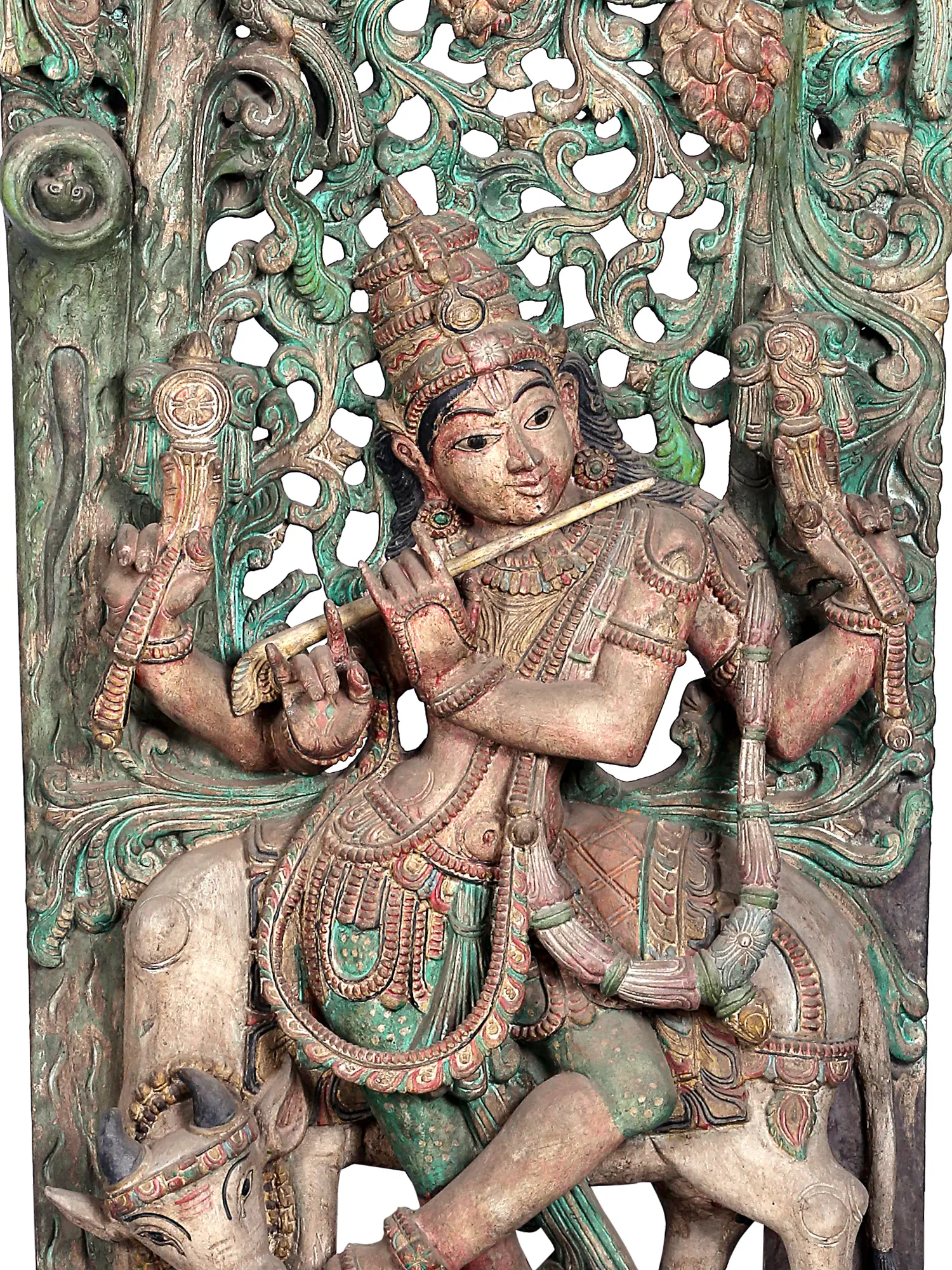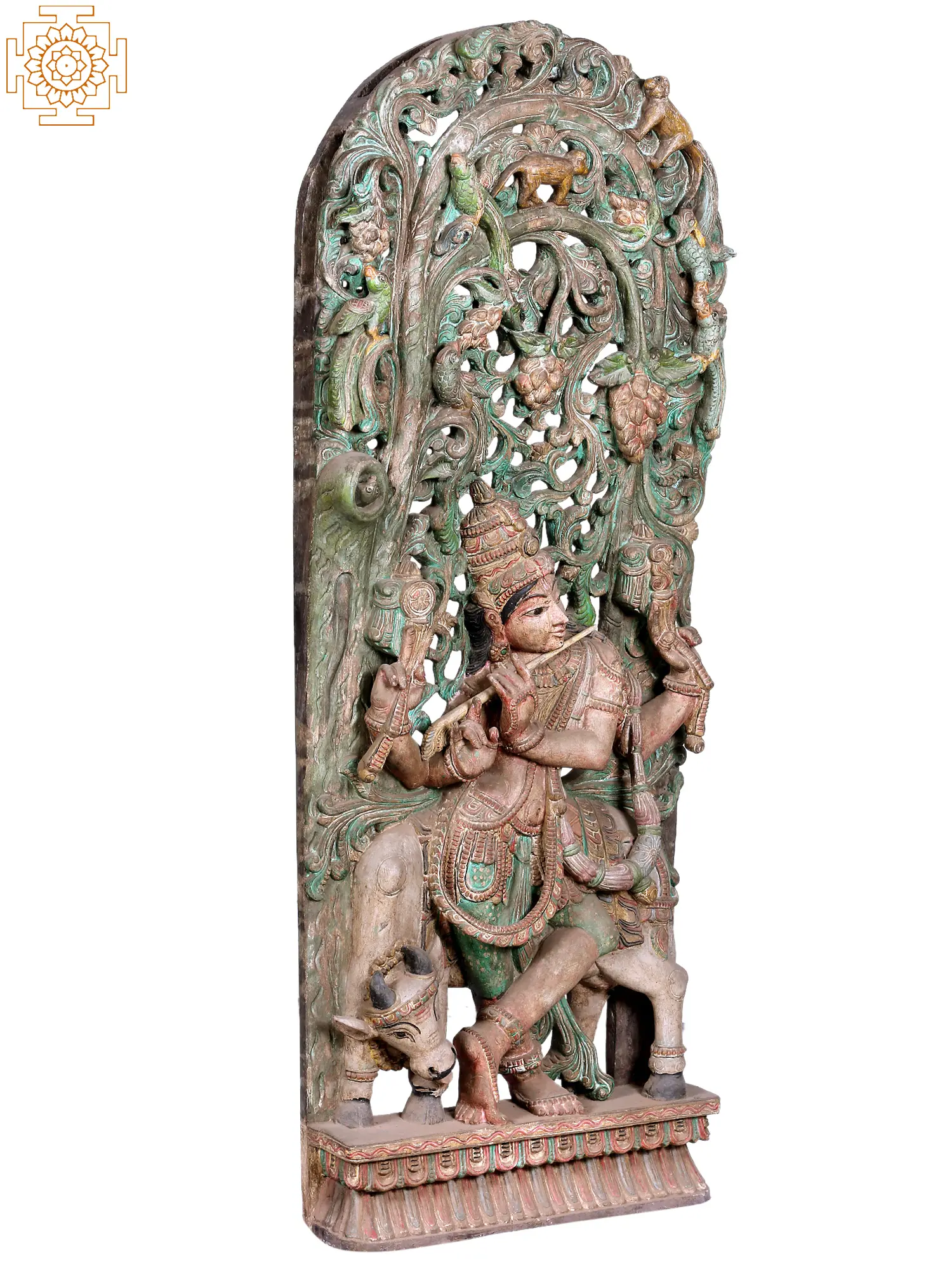 Lord Krishna is the eighth incarnation of Lord Vishnu and he is the god of protection, compassion, tenderness and love. The sculpture of Lord Kirshna has four arms, each of which holds a flute, a conch, and a discus. He is seen standing in a mesmerising position with one leg over the other playing the flute with a cow behind him. His facial expression and flute-playing motion create the impression that he is also engrossed in the music’s enchanted power, which gives his face an ethereal light. His bottom garment is a short dhoti, and he is heavily ornamented with a Vaijantimala (long floral garment), anklets, a crown in the traditional Orissan style, heavy necklaces, bracelets, and earrings. The divine presence of Lord Krishna draws followers into the realm of transcendental delight and spiritual enlightenment by inspiring love, devotion, and eternal bliss.