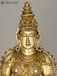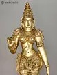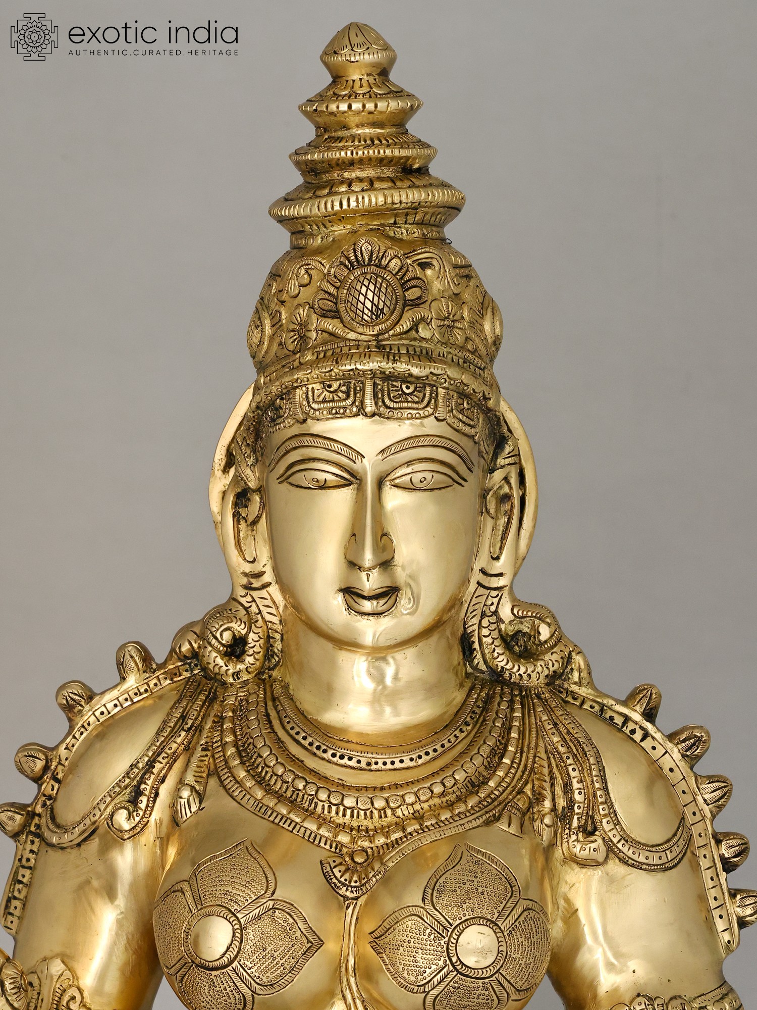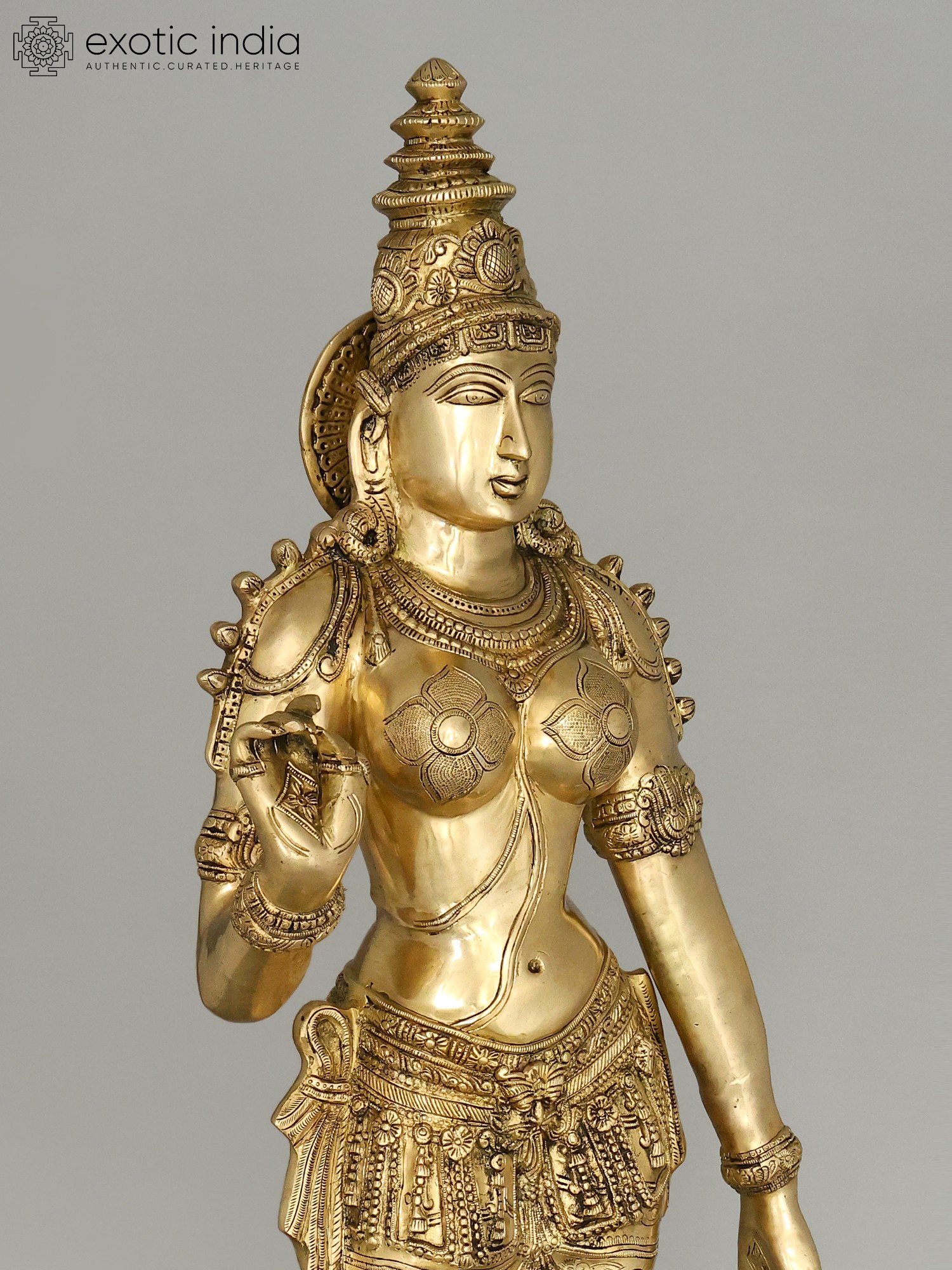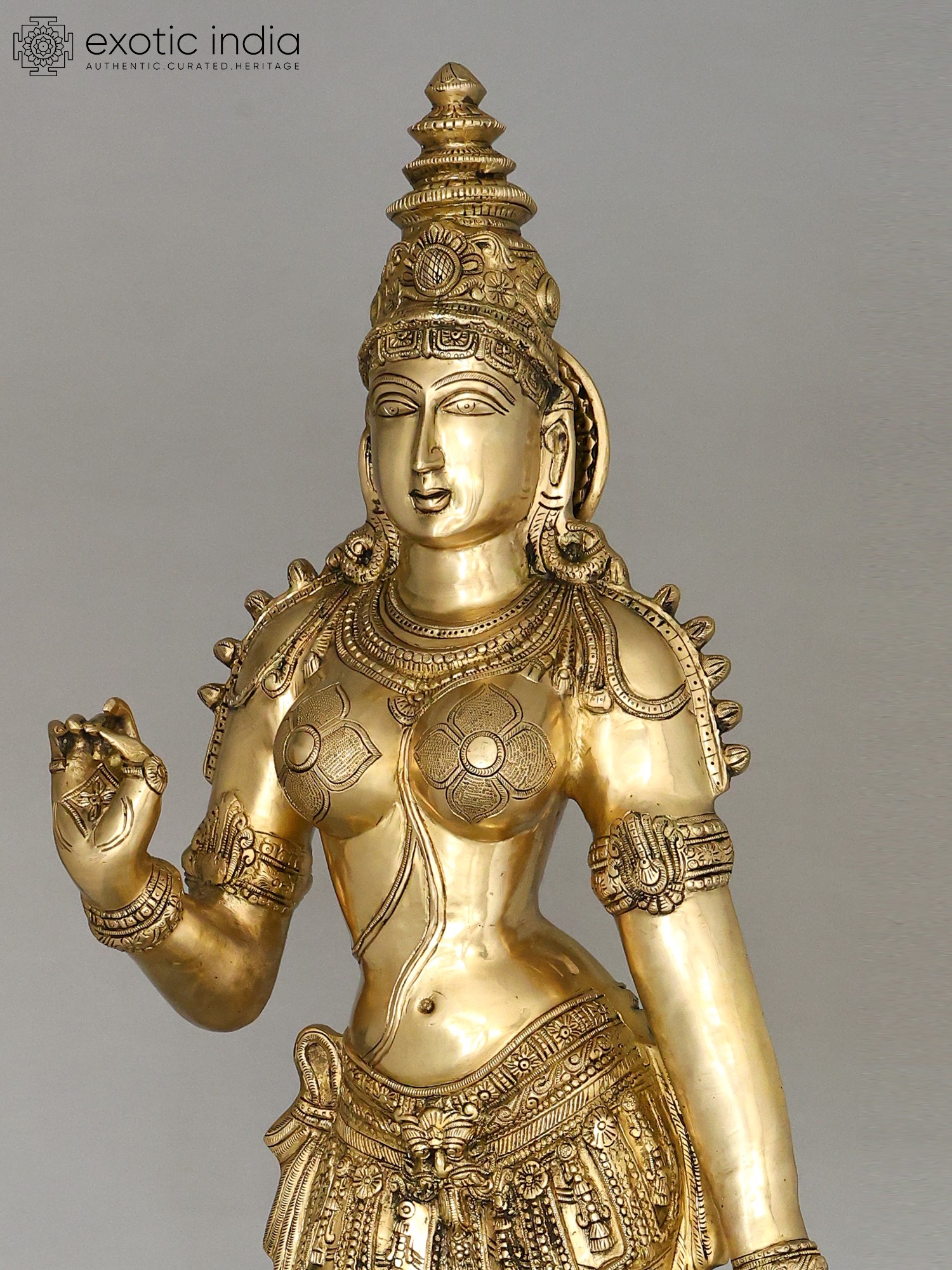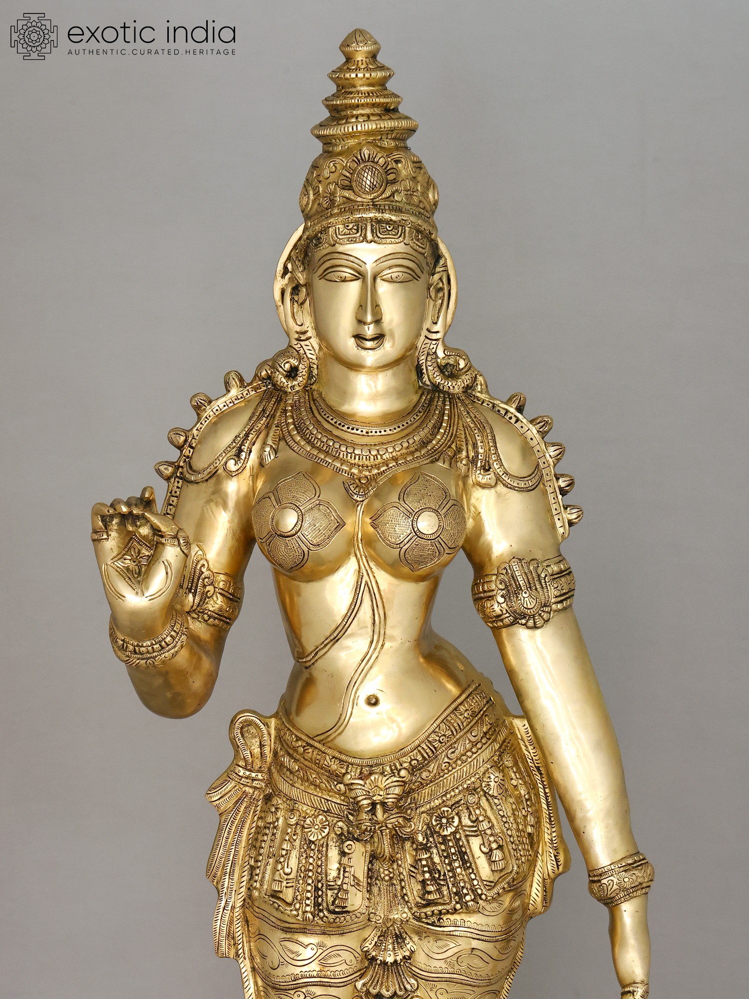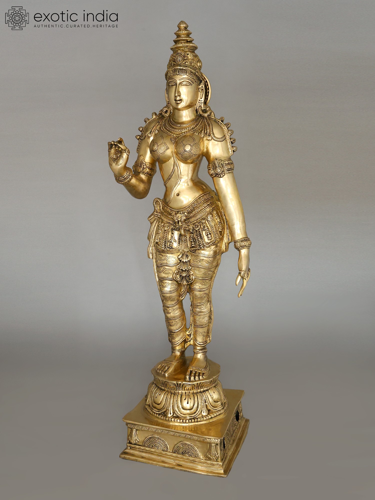 The workmanship overflows with not only skill but also great personal devotion. A hallmark of each work of art that goes into our collection, She is composed in the best proportions of the feminine form. The templetop crown that towers above Her head highlights Her stature, the lotus engraved on it a symbol of Her maternal compassion. Her lines sculpted on to Her countenance convey a composure of invincible calm and piety. Streams of gold and jewels grace Her shoulders, arms, and torso, and a richly embroidered silk dhoti is draped onto Her from the navel downwards. Her right arm seemingly holds a lotus. This murti will single-handedly add a world of stability to your space.