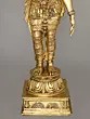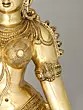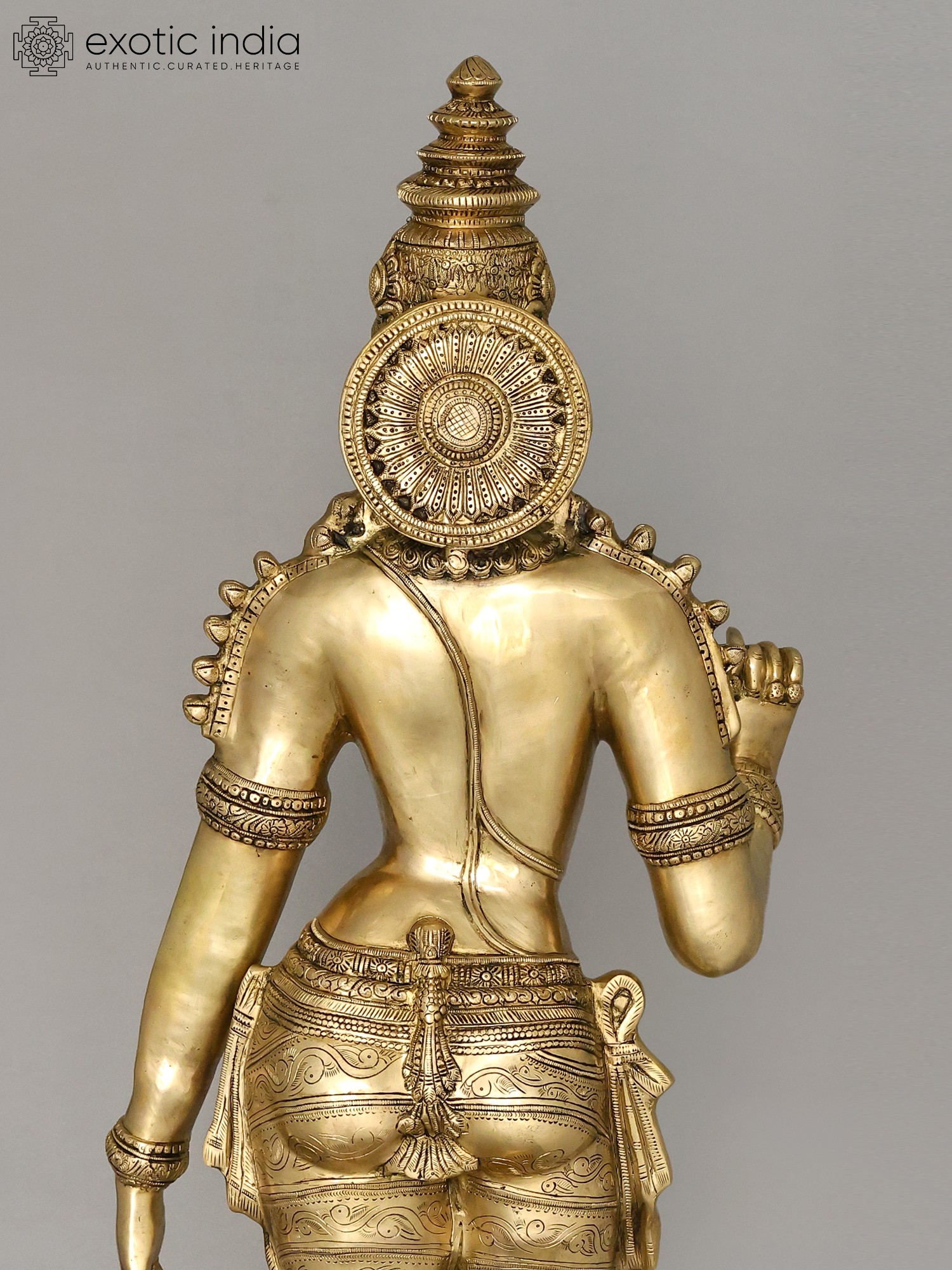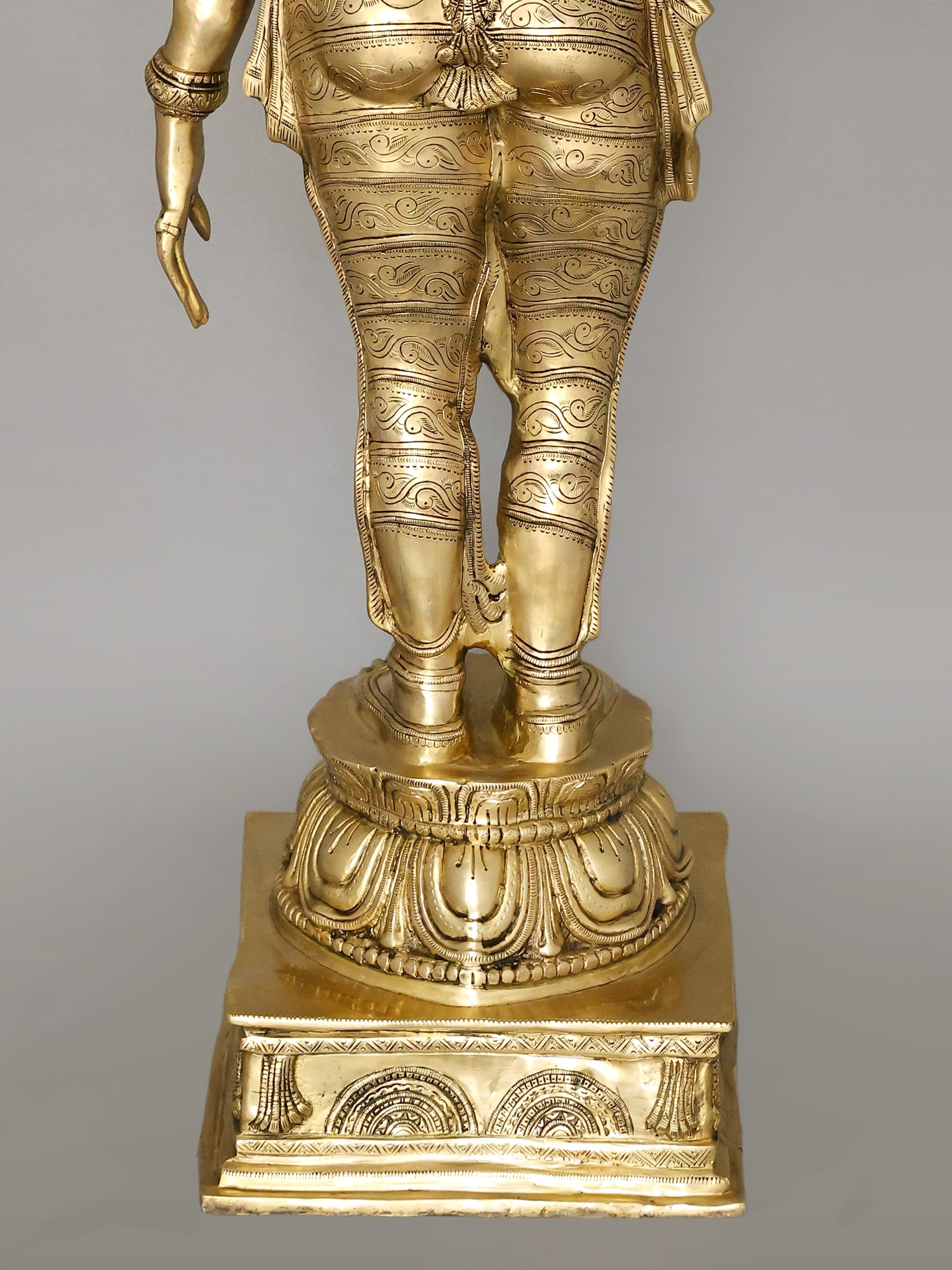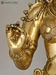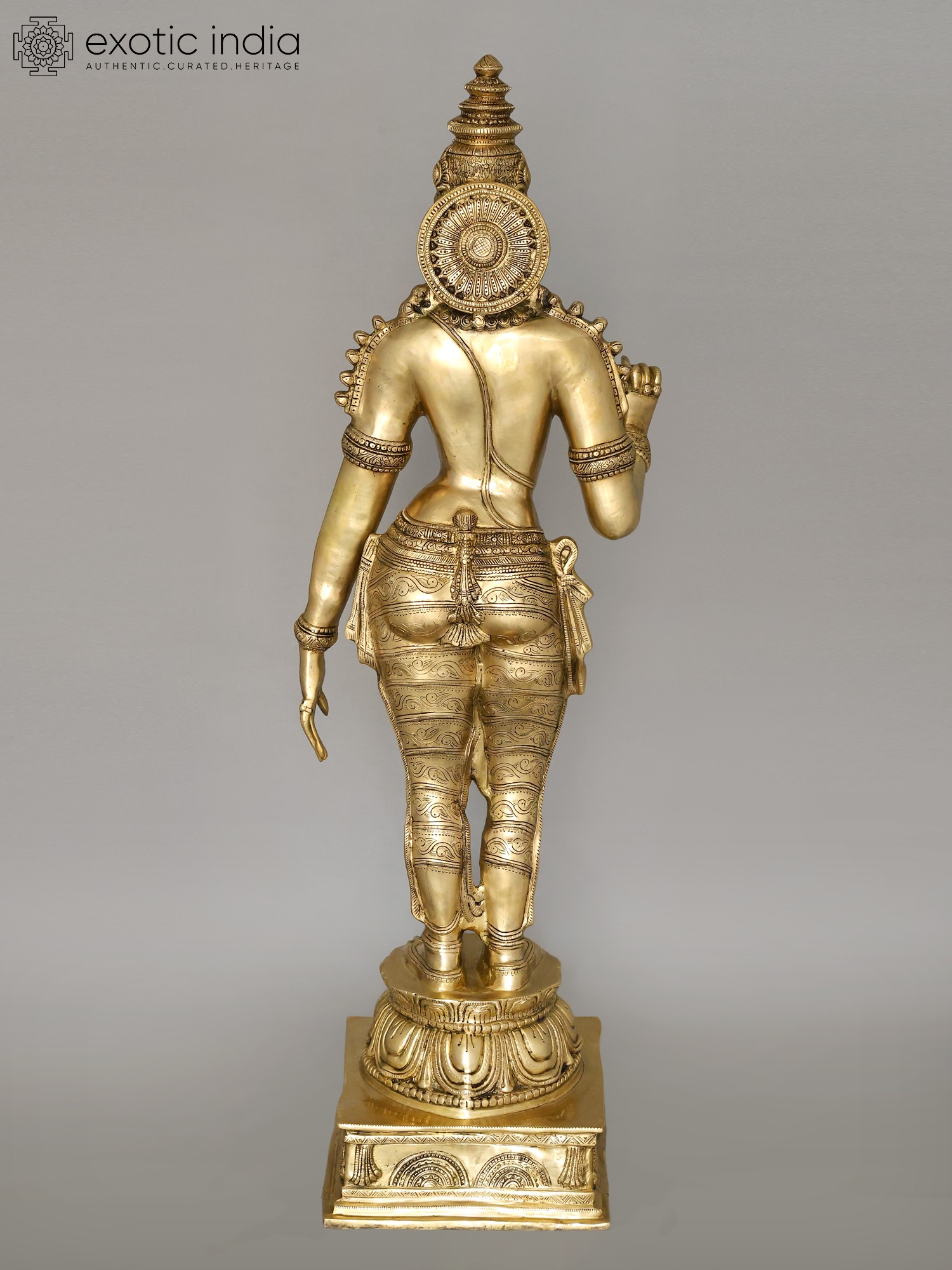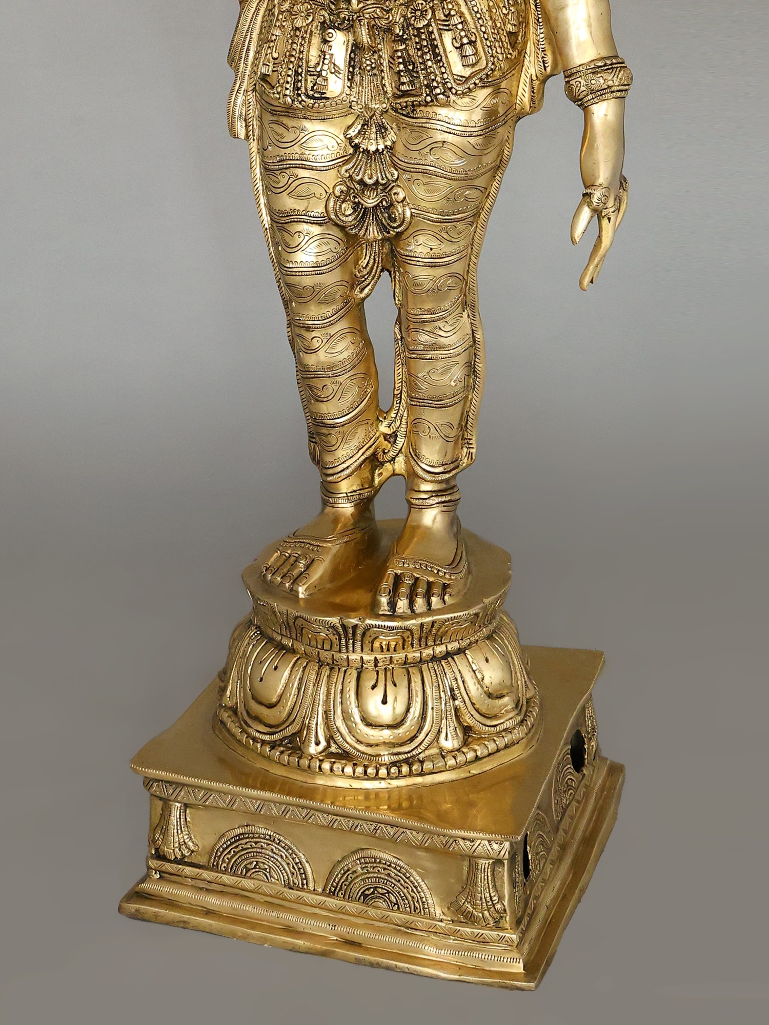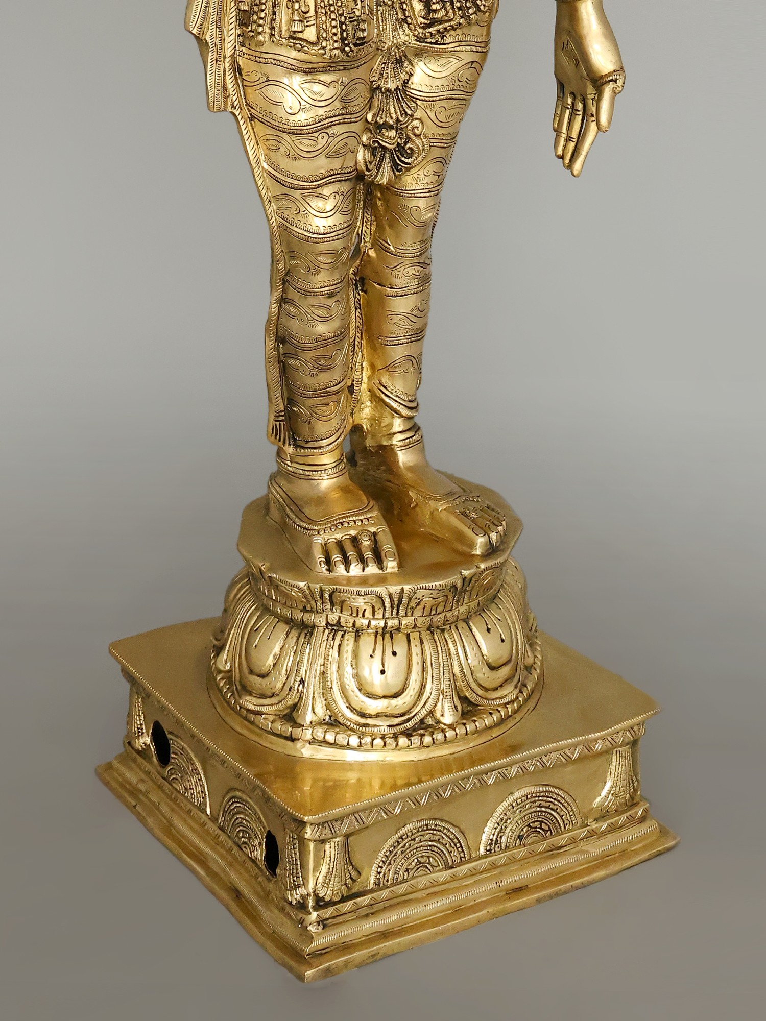 The workmanship overflows with not only skill but also great personal devotion. A hallmark of each work of art that goes into our collection, She is composed in the best proportions of the feminine form. The templetop crown that towers above Her head highlights Her stature, the lotus engraved on it a symbol of Her maternal compassion. Her lines sculpted on to Her countenance convey a composure of invincible calm and piety. Streams of gold and jewels grace Her shoulders, arms, and torso, and a richly embroidered silk dhoti is draped onto Her from the navel downwards. Her right arm seemingly holds a lotus. This murti will single-handedly add a world of stability to your space.
