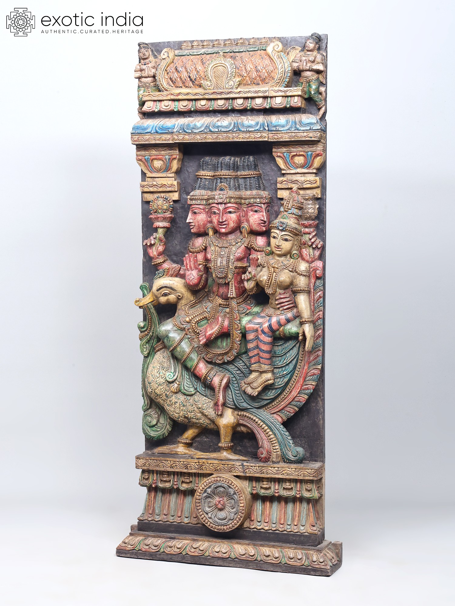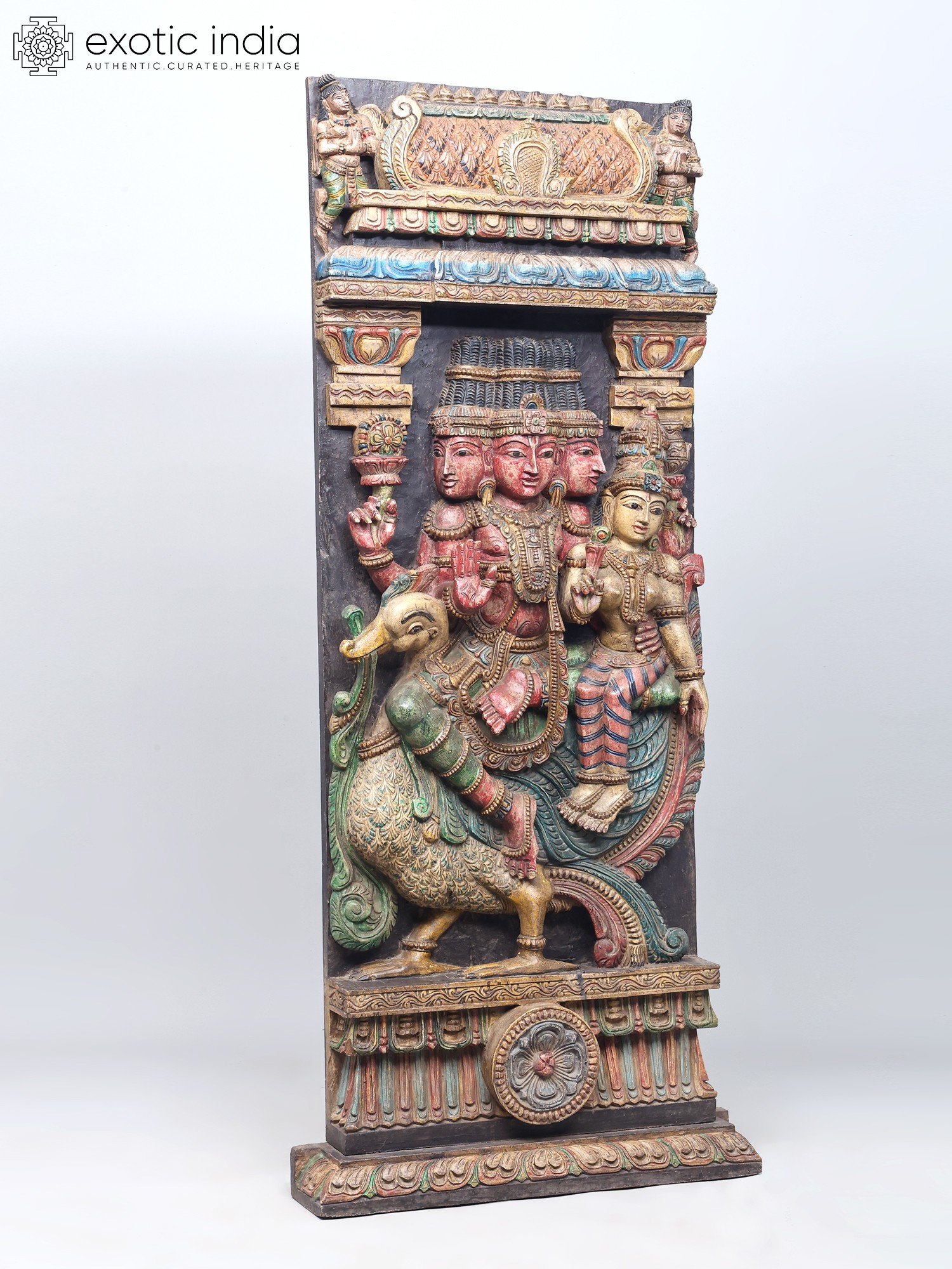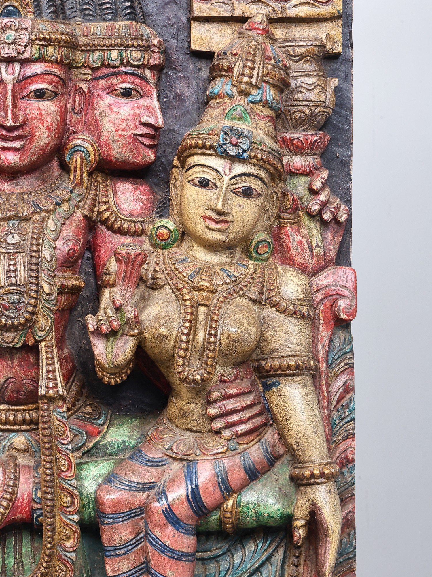 This magnificent wooden carving portrays a celestial tableau, featuring the creator god, Brahma, seated alongside the goddess of wealth and fortune, Lakshmi. The intricate craftsmanship captures the essence of these revered deities, their forms imbued with grace and spiritual significance. Brahma, with his four heads, represents the four Vedas, the four directions, and the four stages of life, symbolizing his omnipresent knowledge and his role as the progenitor of the universe. His presence here signifies the foundational power of creation and the cosmic order.