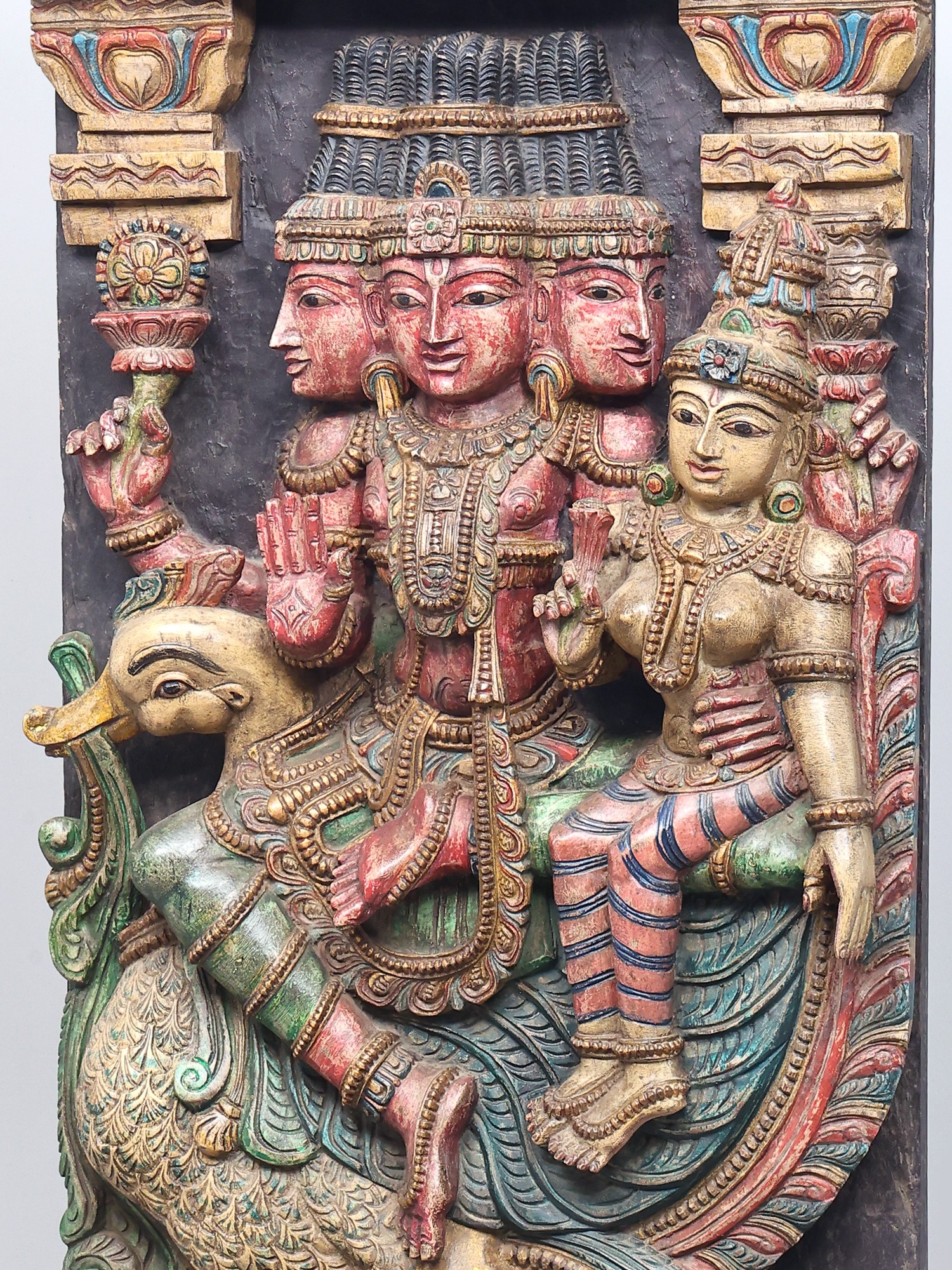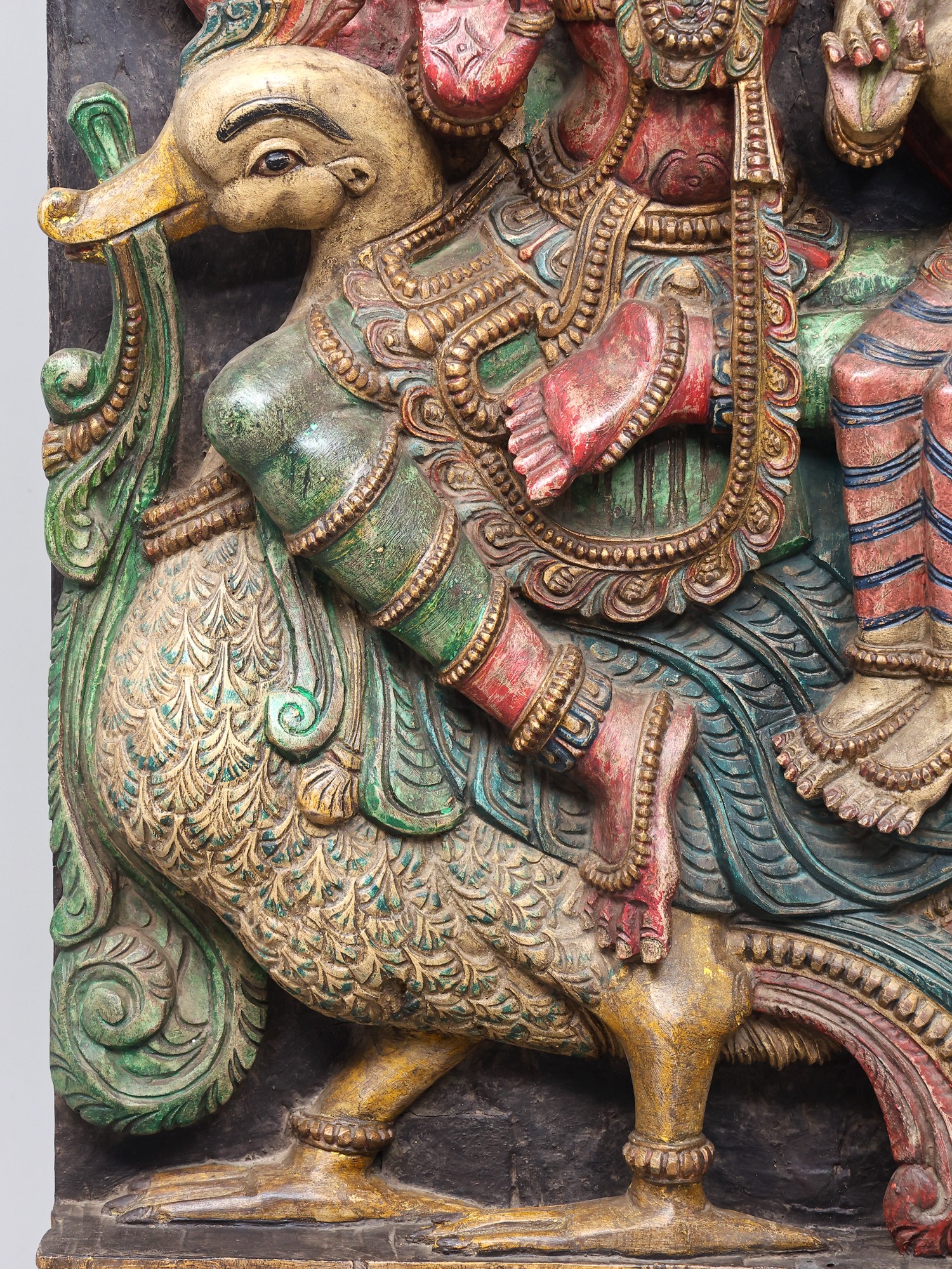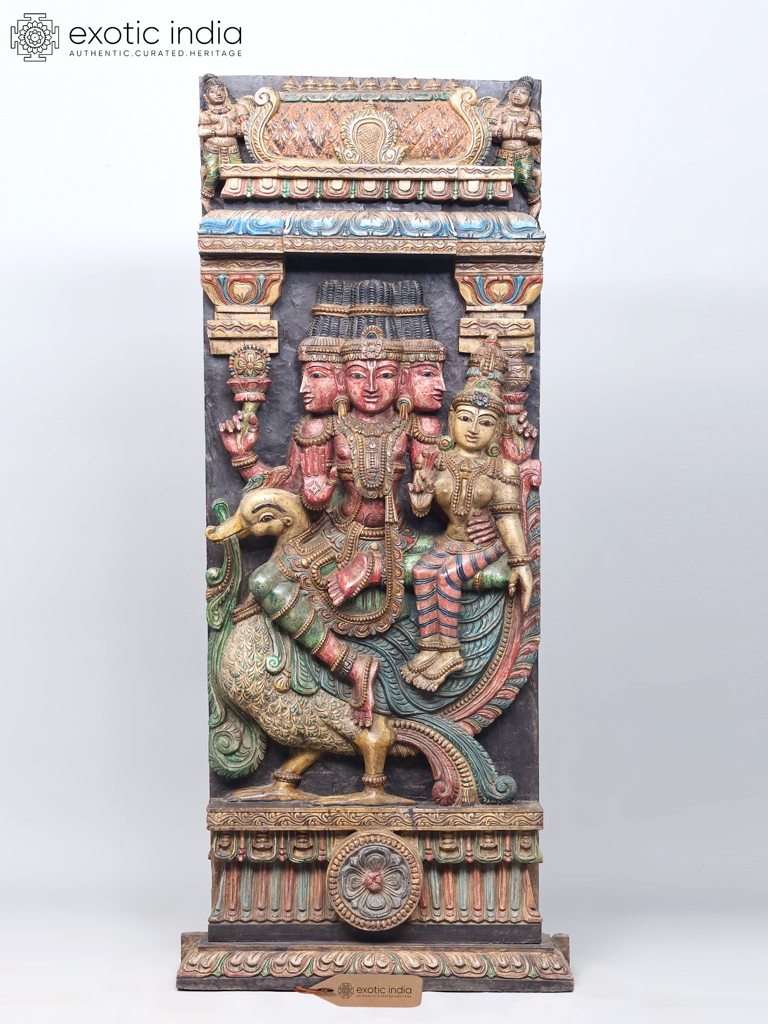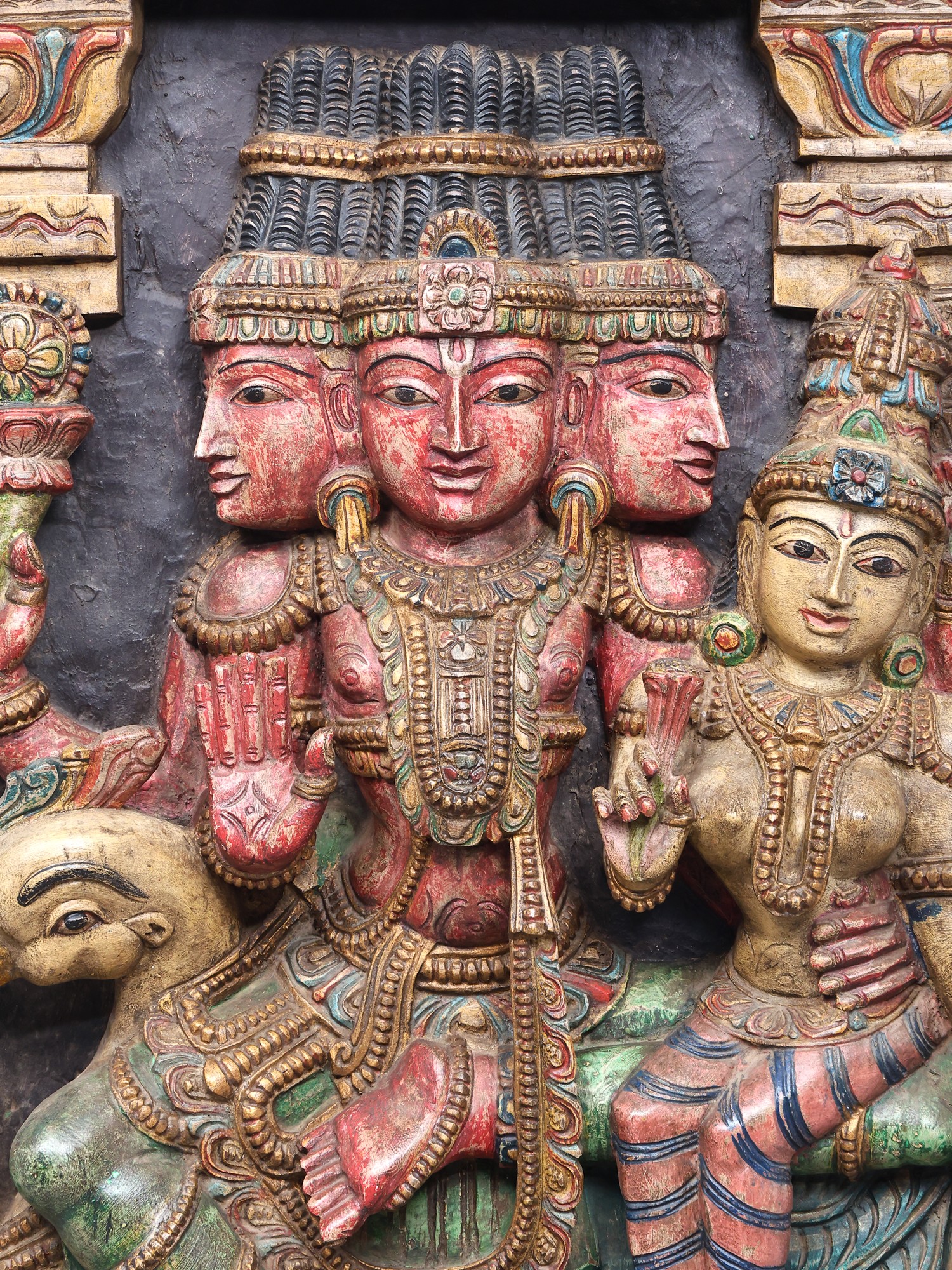 This magnificent wooden carving portrays a celestial tableau, featuring the creator god, Brahma, seated alongside the goddess of wealth and fortune, Lakshmi. The intricate craftsmanship captures the essence of these revered deities, their forms imbued with grace and spiritual significance. Brahma, with his four heads, represents the four Vedas, the four directions, and the four stages of life, symbolizing his omnipresent knowledge and his role as the progenitor of the universe. His presence here signifies the foundational power of creation and the cosmic order.
