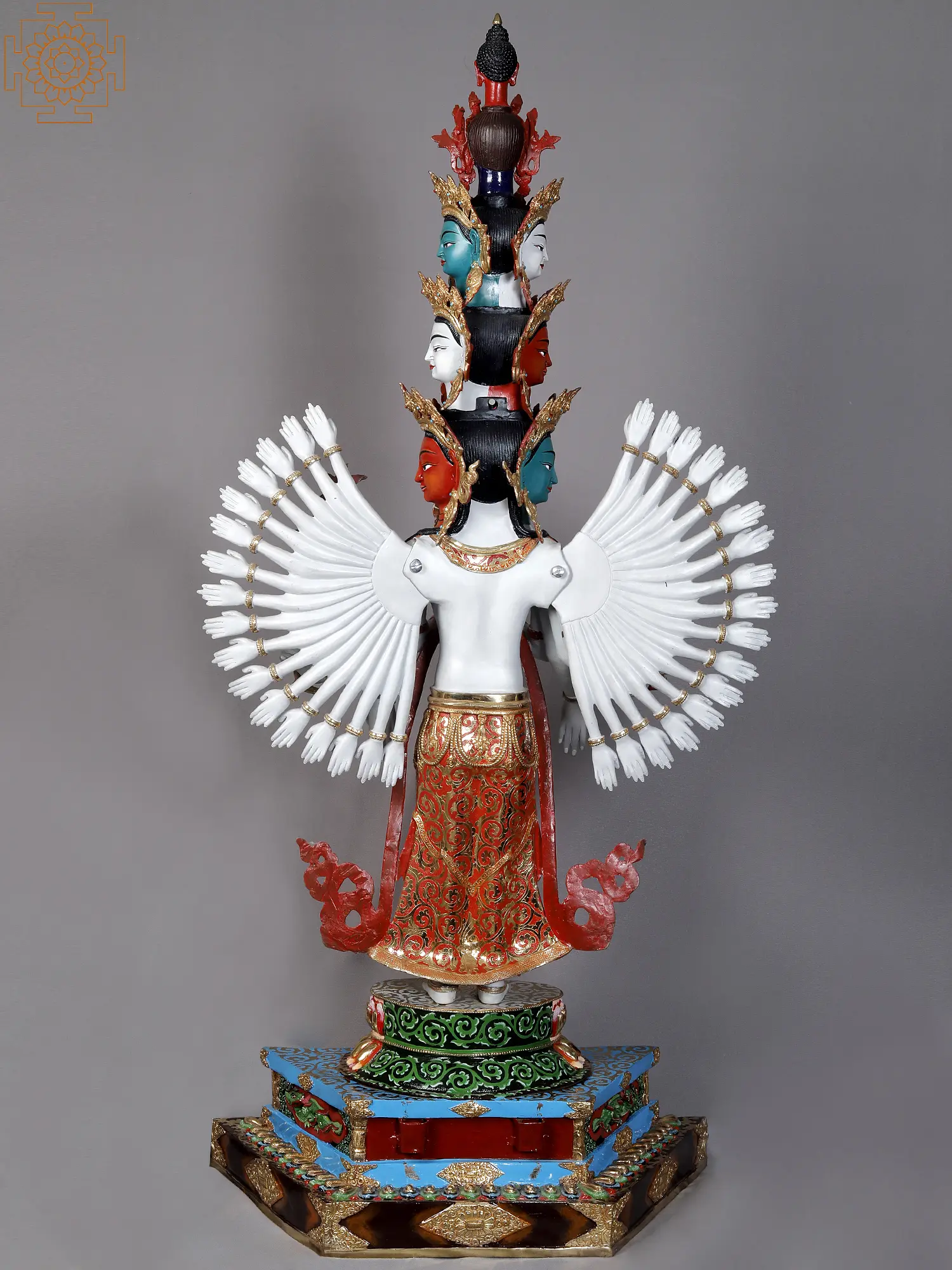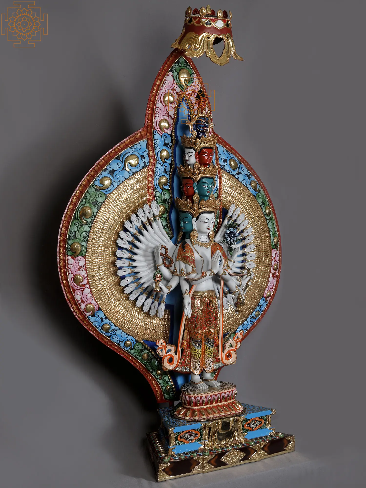 From the expressions of Lokeshvara to the delineation of his hands and the antelope skin on his shoulder, each element has a defined finish, which is highlighted with expressive tints. The minutiae of the pedestal and the aureole are bewildering for the eyes, making this Nepalese statue a spiritual masterpiece.