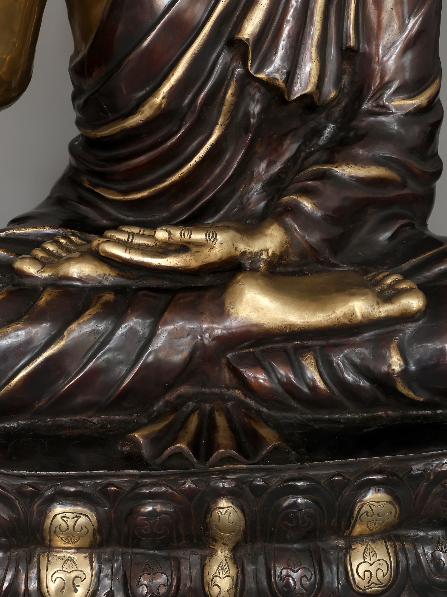 The large double lotus pedestal is sculpted realistically having spiritual Buddhist symbols, vajrakila, kartika and trishula carved on it. He wears a symmetric pleated robe draped perfectly on his body; his hairs coiled evenly accentuate his overall look.
