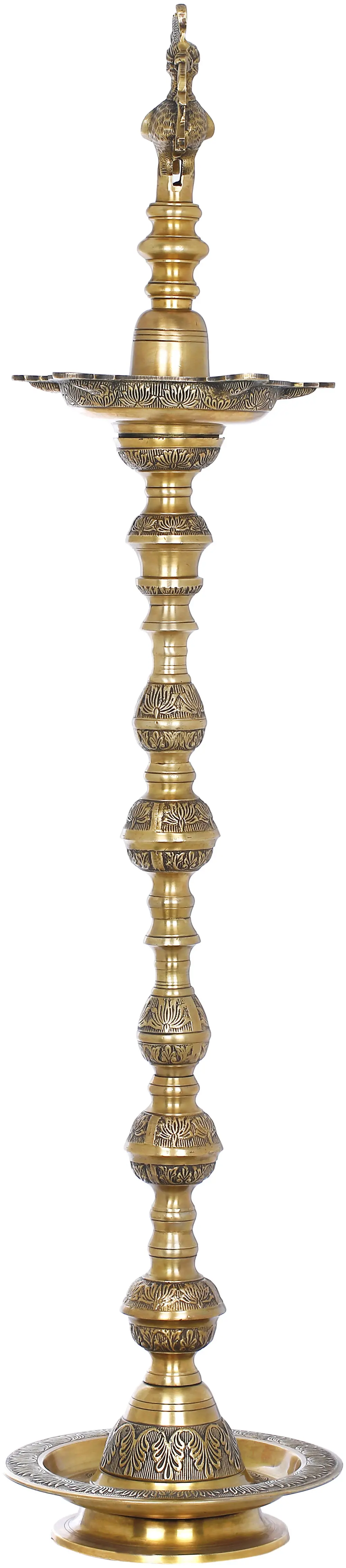 At the apex of this striking lamp resides a beautifully rendered peacock, a creature deeply interwoven with the spiritual and cultural fabric of India. In Hindu mythology, the peacock is the divine mount of Lord Kartikeya, the god of war, and a symbol of beauty, grace, and immortality. Its iridescent plumage is said to represent the divine all-seeing eye, warding off evil and bestowing good fortune. The presence of the peacock atop this lamp imbues it with a powerful protective energy and a connection to higher realms, making it an ideal addition to your puja room or any area dedicated to spiritual practice and contemplation.