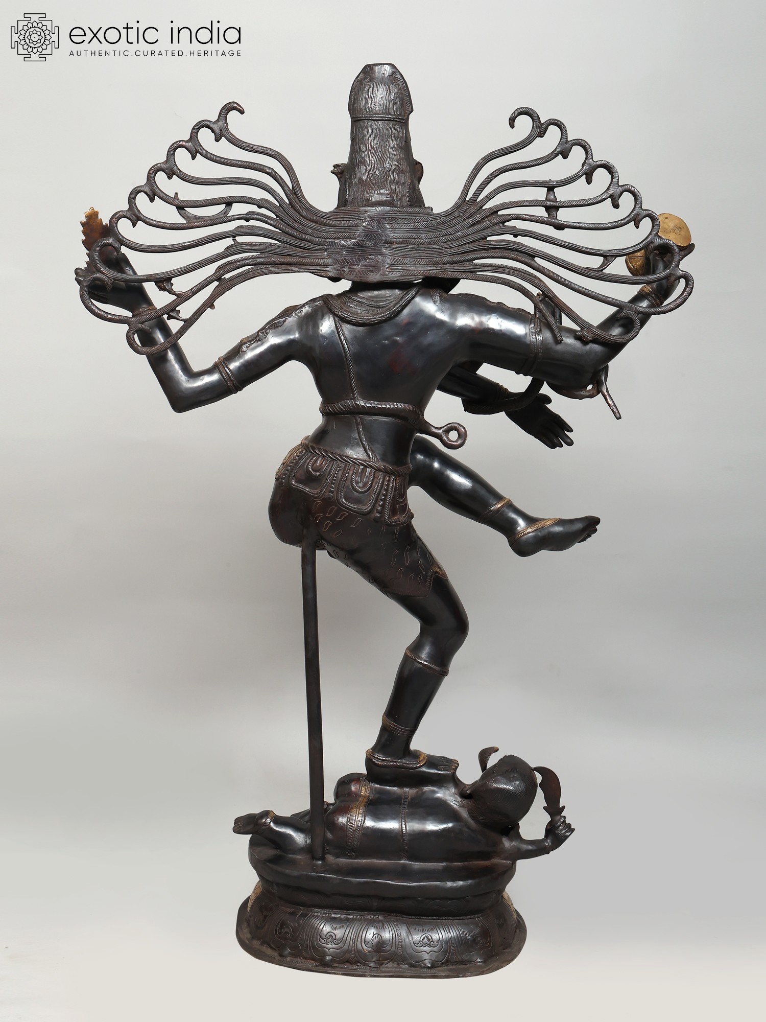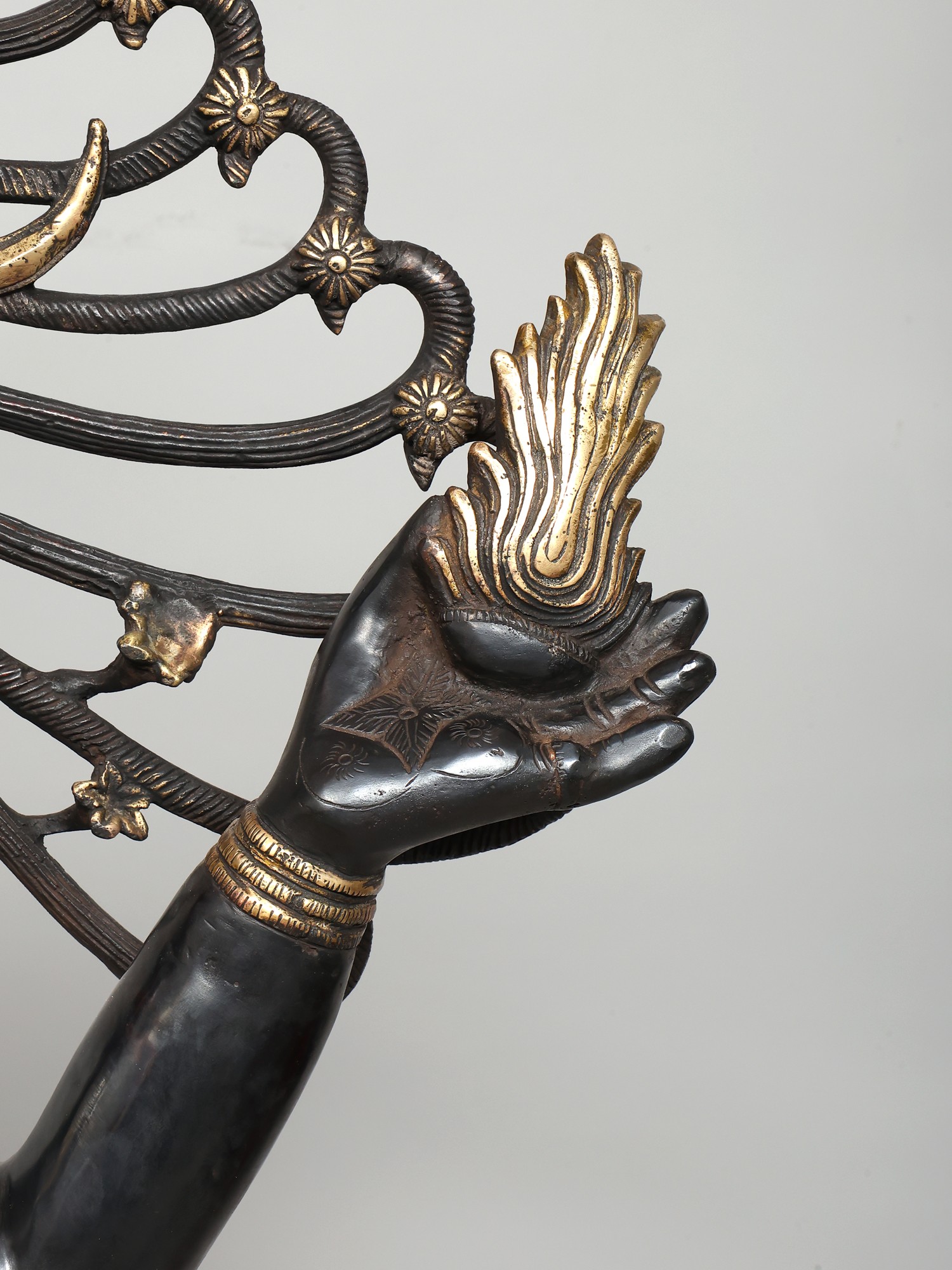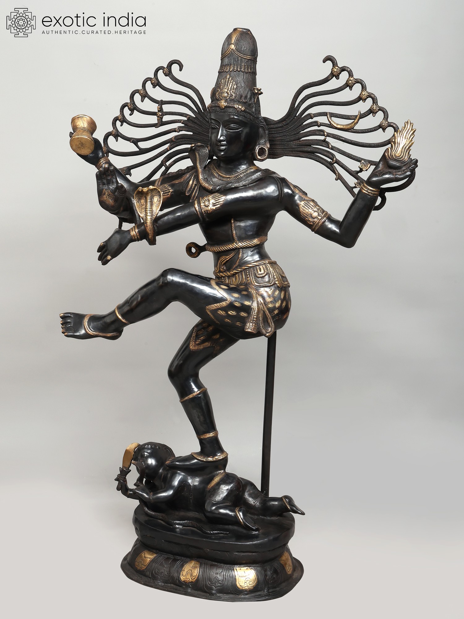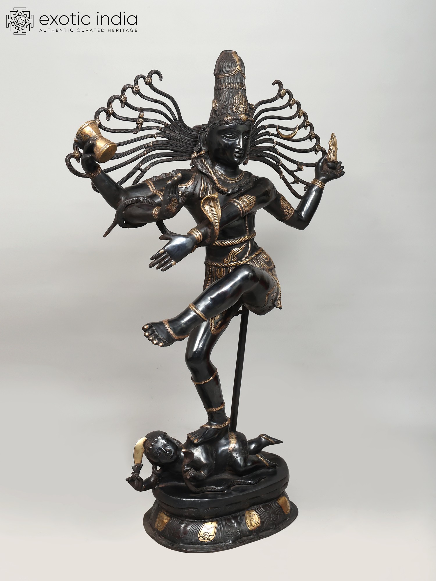 In the cosmic dance of creation and destruction, Nataraja Shiva reigns, eternally in motion. This handmade brass statue depicts Shiva, the Lord of the Dance, captivating the universe with his celestial Tandava. The flames surrounding him symbolize the cyclical nature of existence, while his powerful gestures represent the cosmic rhythm. As he dances, he liberates souls from illusion and ignorance, guiding them toward enlightenment. This masterpiece works like a reflection of life's changes and embraces the flow of time. The spirit of Nataraja Shiva ignites your soul and encourages you to dance fearlessly through the ever-changing symphony of life.
