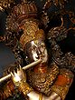 This magnificent 57-inch brass statue captures Lord Krishna in the enchanting *Tribhanga* pose, a graceful three-bend posture signifying divine elegance and fluidity. The intricate details, from the delicate folds of his garments to the expressive features of his face, showcase the exceptional artistry of traditional Indian craftsmanship. The golden hue of the brass adds a radiant glow, enhancing the statue's spiritual aura. Behind him stands a beautifully sculpted Kadamba tree, a significant symbol in Krishna's mythology. The Kadamba tree is often associated with the divine love between Krishna and Radha. Many tales depict Krishna's youthful escapades under the shade of this tree, adding depth and meaning to this evocative artwork. This statue is more than just a decorative piece; it’s a window into a rich tapestry of Indian culture and mythology, bringing the stories of the beloved Lord Krishna into your home or sacred space.