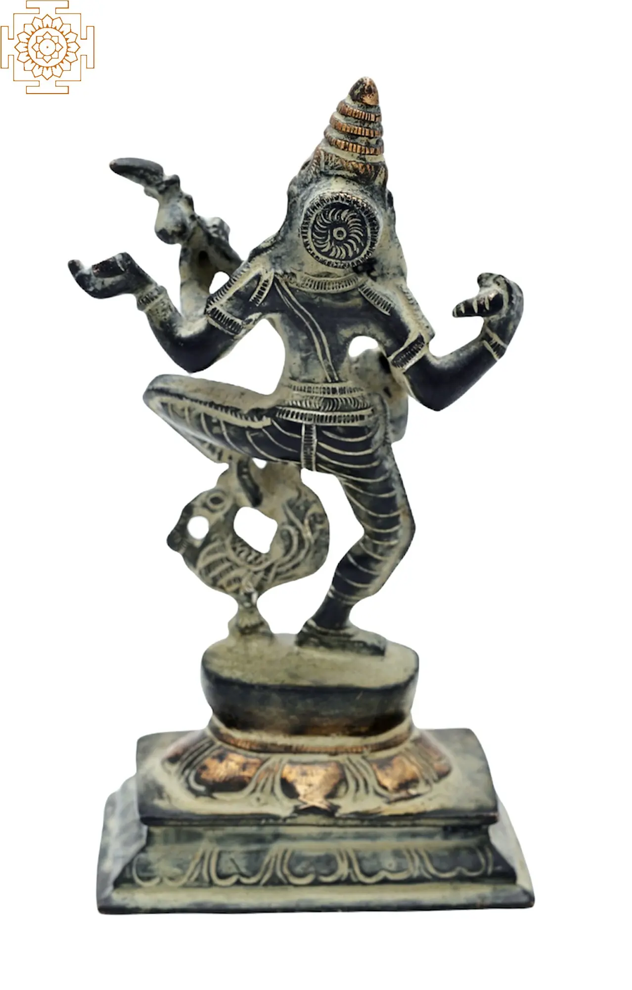 The source of Paramapita Brahma’s heavenly inspiration, which led to the formulation of Srishti, goddess Saraswati in this brass statue strikes a dynamic posture, symbolizing her movement in the mind of every artist, as the supreme creative force. Devi Saraswati has a youthful form, which is delicately adorned. She holds her Veena, Veda, and rosary in her hands and has her foot placed atop the Paramahansa- heavenly swan which is a symbol of pure wisdom in Hindu culture.