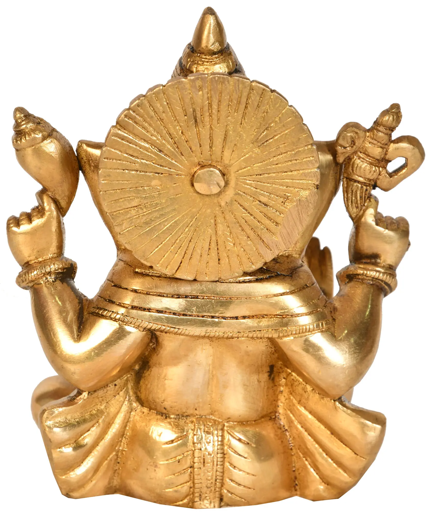 Aashirwad Ganesha, resplendent in divine majesty, sits adorned in celestial attire, bearing a trident (Trishul) mark on his trunk. His visage exudes benevolence, his upper hands clutching a “Goad” and “Noose”, while the right is poised in “Ashirwad Mudra”, the Gesture of Benediction. As he indulges in the sweet Modak, the essence of devotion and delight radiates from his countenance. Serpent Vasuki entwines his ample belly, a symbol of cosmic unity. Worshipping this form bestows the blessings of wisdom, guidance, and protection. This artwork, crafted in brass, signifies Ganesha’s role as the benevolent guardian, capable of leading one through life’s twists and turns, while nurturing the soul with divine sweetness.