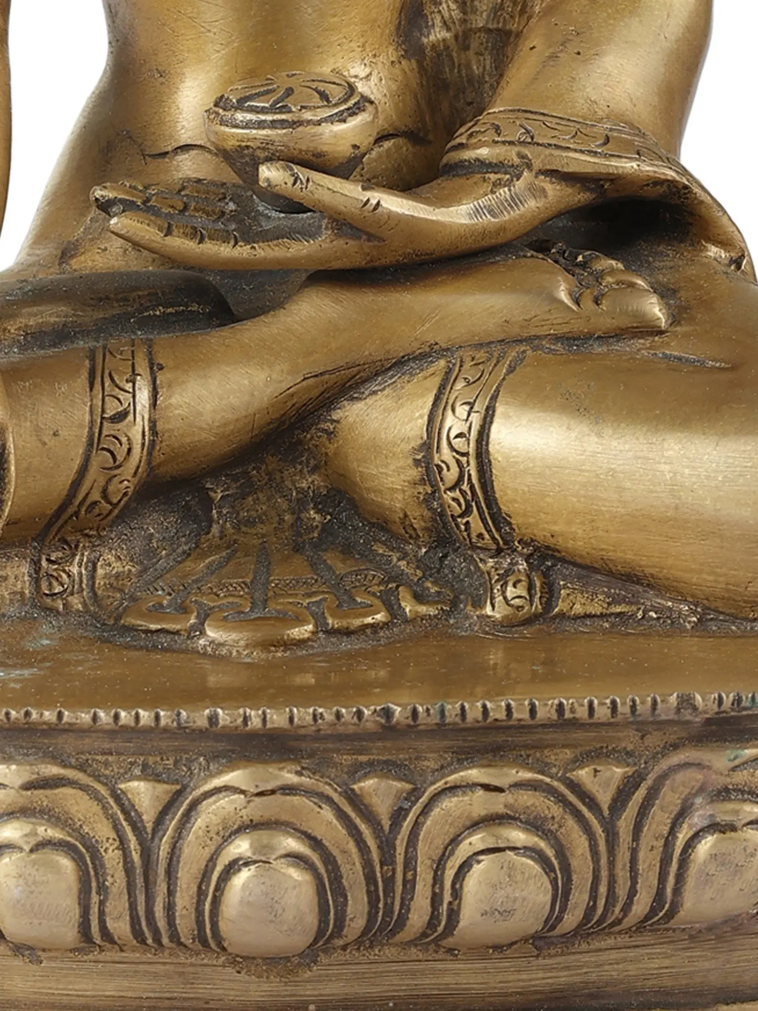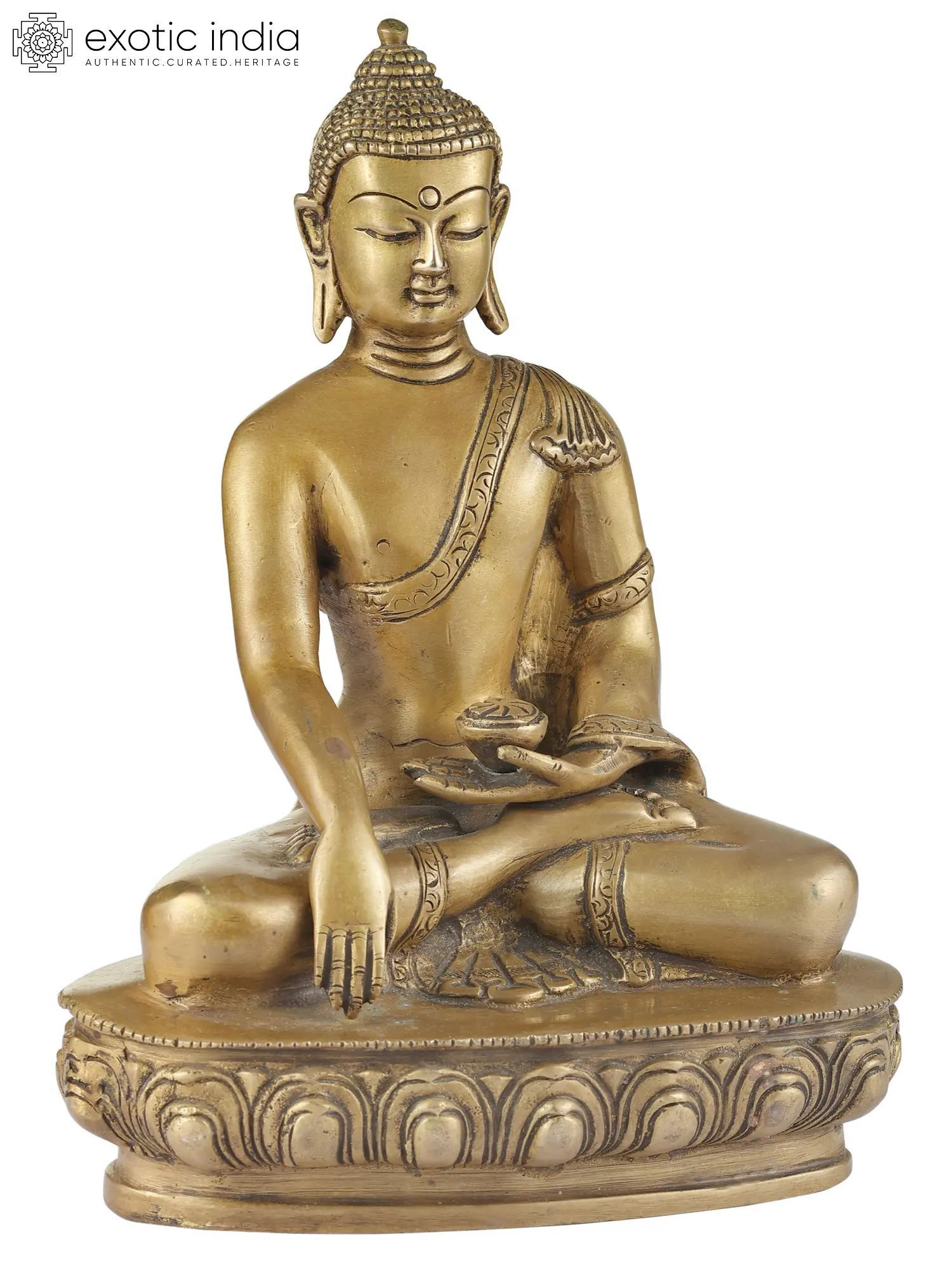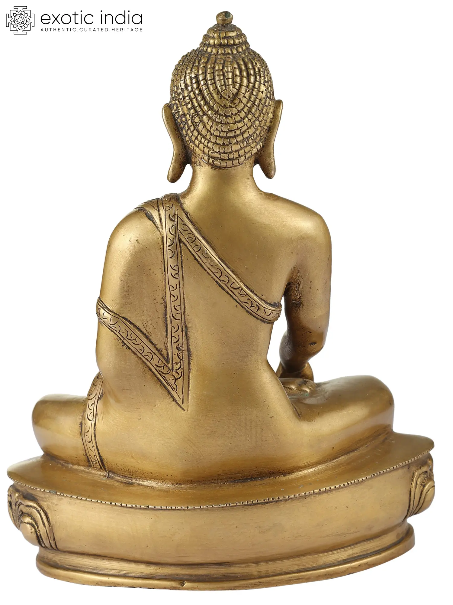 Handcrafted with meticulous attention to detail in India, this statue is a testament to the rich heritage of Indian metalwork. The use of brass, a material revered for its durability and ability to hold intricate designs, lends a timeless quality to the piece. The serene expression on Buddha's face, the delicate folds of his monastic robe, and the subtle ornamentation speak of the artisan's skill and devotion. Each element is carefully rendered, from the urna on his forehead, symbolizing spiritual insight, to the ushnisha, the cranial protuberance representing his wisdom. The serene posture, seated in the lotus position on a beautifully sculpted lotus pedestal, further enhances the meditative and tranquil aura of the sculpture. This is not merely an object of art but a conduit for peace and spiritual reflection.