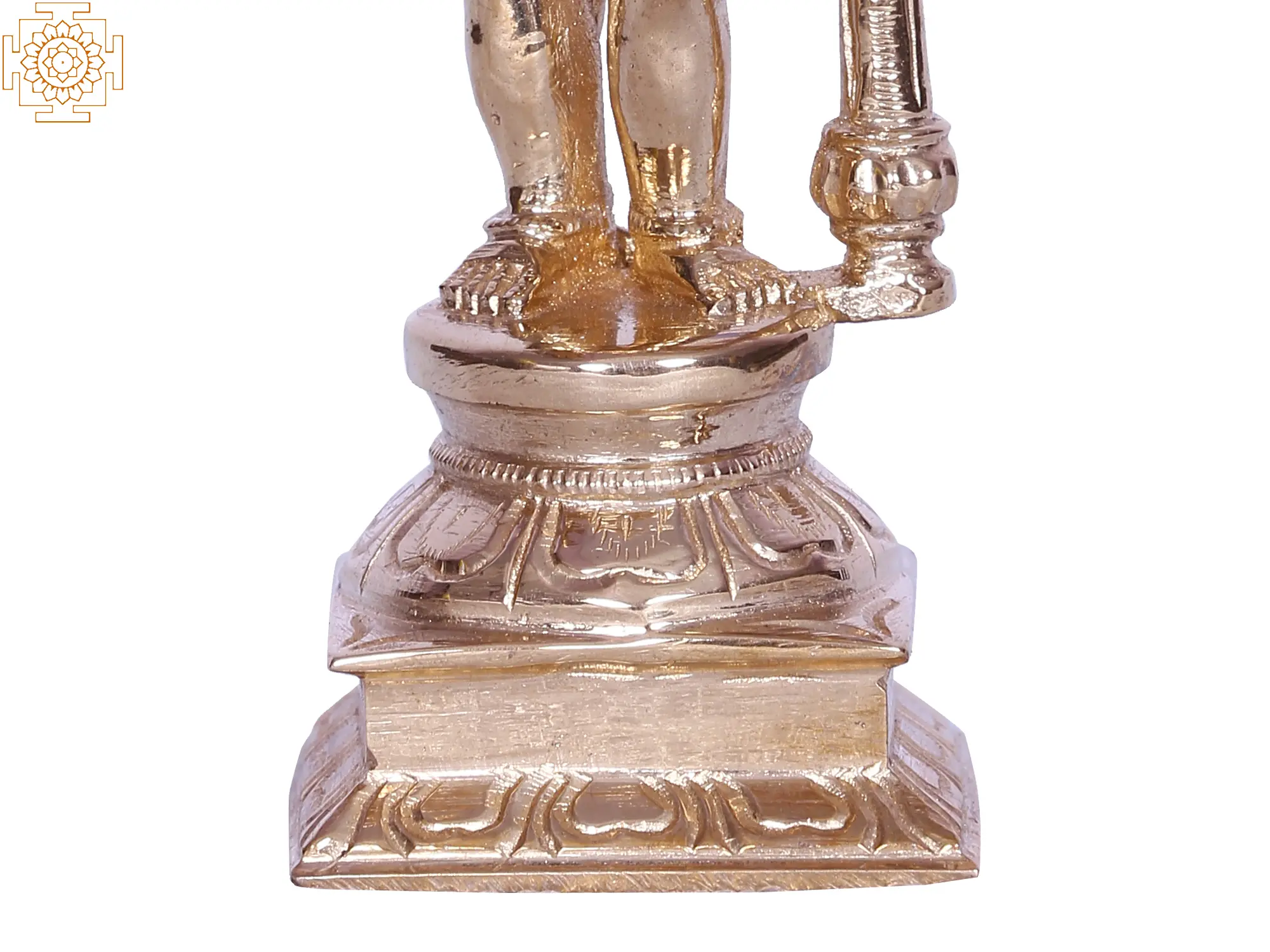 In this bronze creation, Blessing Anjaneya, the embodiment of unwavering devotion, stands resplendent on a lotus pedestal in the ethereal “Tribhanga posture”. His regal attire exudes majesty, while the sacred thread, Janeu, adorns him with sanctity. The divine benediction flows from his right hand, poised in “Ashirwad Mudra”, a celestial cascade of blessings. The mighty Mace (Gada) held gracefully in his left hand symbolises strength tempered with compassion. Worshipping this celestial visage of Lord Hanuman, “the Immortal One”, invokes courage, dispels fears, and grants the boon of divine protection. Amidst the cosmic dance, Anjaneya beckons seekers to the sacred realm, where devotion becomes an eternal hymn.