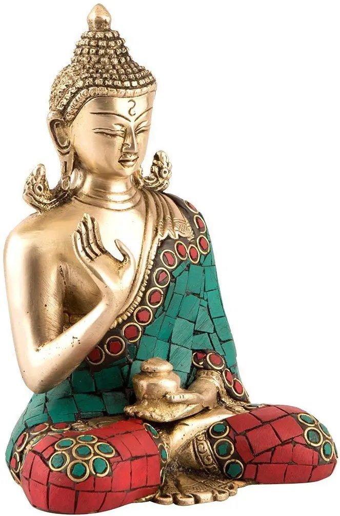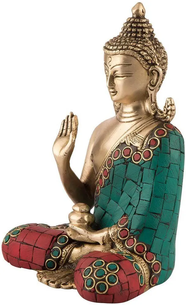 Sitting gracefully in the meditative lotus position, Lord Buddha’s right hand is extended in the “Abhaya Mudra”, bestowing blessings and protection upon all beings. The Ushnisha, symbolising his transcendent knowledge, crowns his serene countenance. His elongated earlobes represent his past as a prince who renounced material desires. In his left hand, he holds the alms bowl, symbolising humility and the practice of selflessness. A touch of elegance and beauty is added by the statue’s painstakingly carved inlay work, which highlights India’s rich artistic legacy. This sacred brass creation inspires you to embrace love, peace, and enlightenment on your spiritual journey.