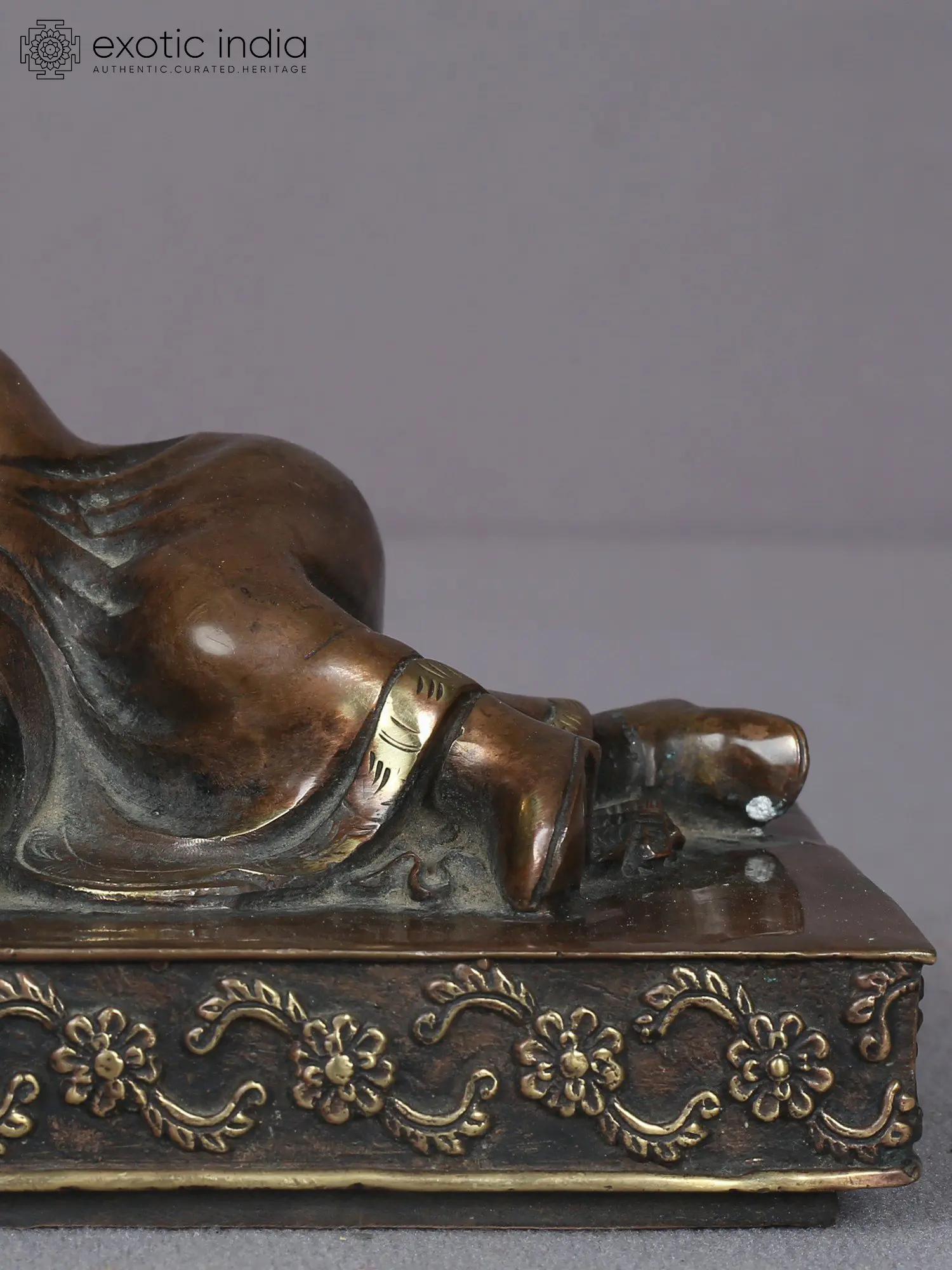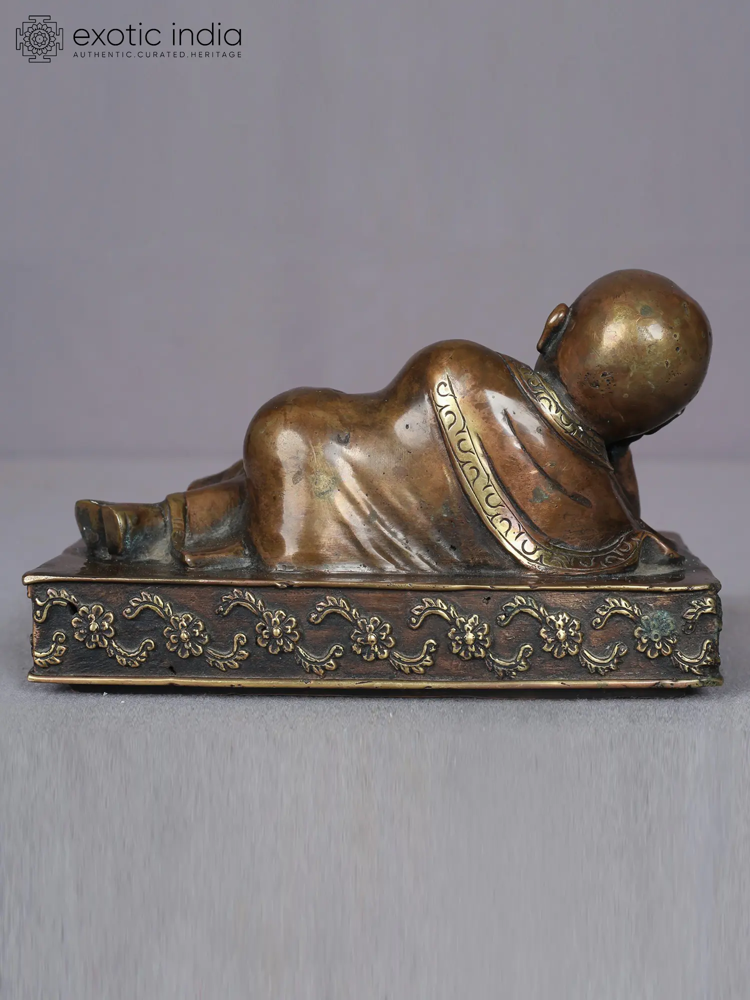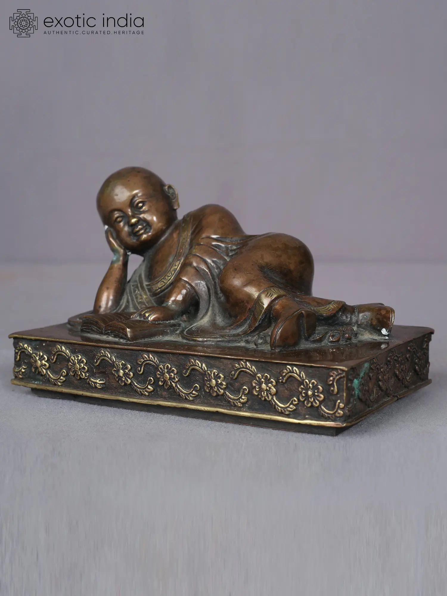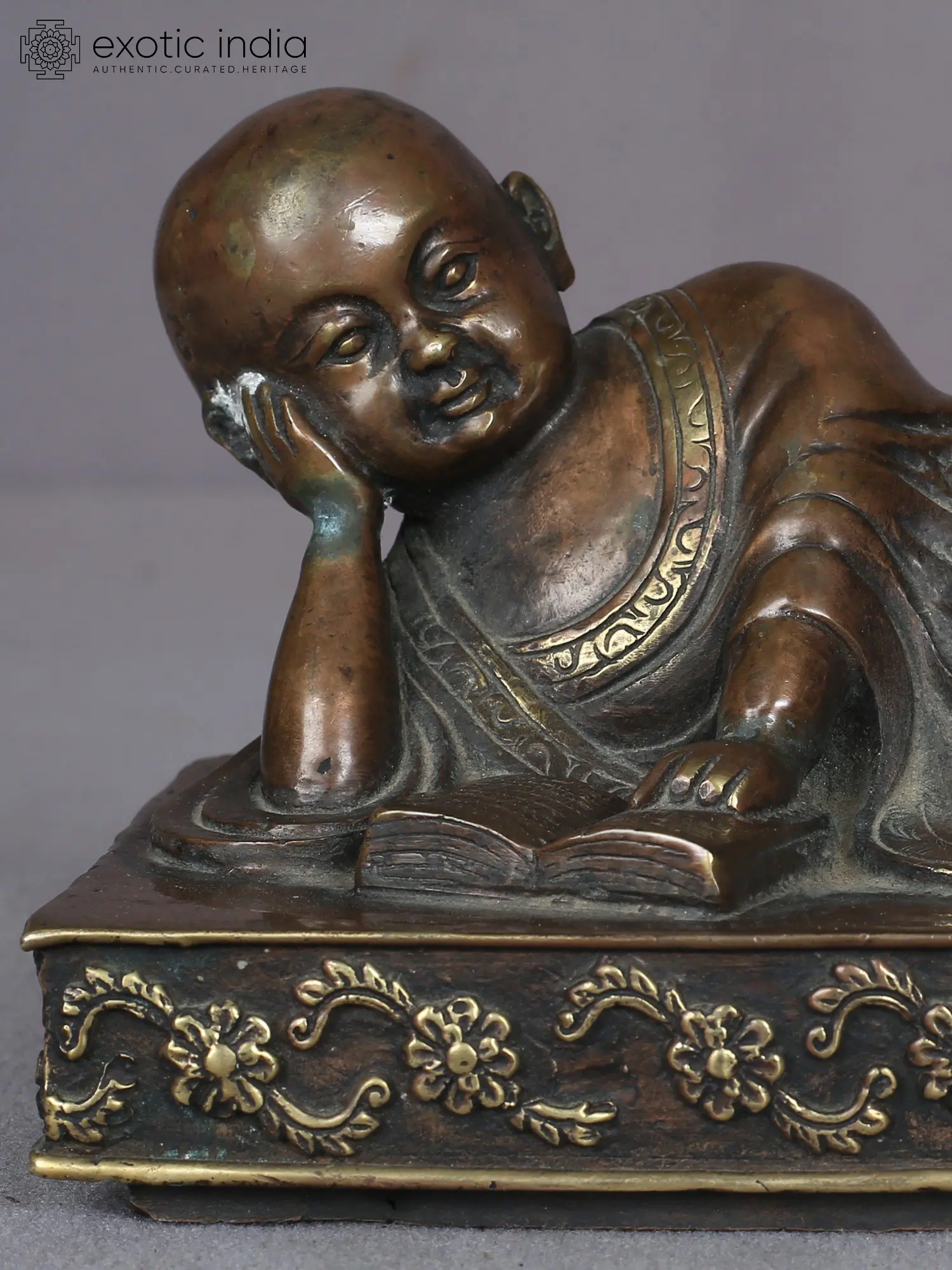 Nurturing the mind with virtuous literature and thoughts is one of the simplest ways in which a practitioner of Buddhism can begin their journey to higher levels of wisdom. Reading the teachings of the Buddha is a way to interact with Him. This concept is marvelously presented in this brass statue, showing a Buddha (enlightened being) immersed in reading. Relaxed while reclining on a splendidly delineated bed, the Buddha is simply a Buddhist monk, identified by his garments and shaved head. The tranquility of his mood is an expression of the state of mind, when one is reading or listening to the words of Buddha.