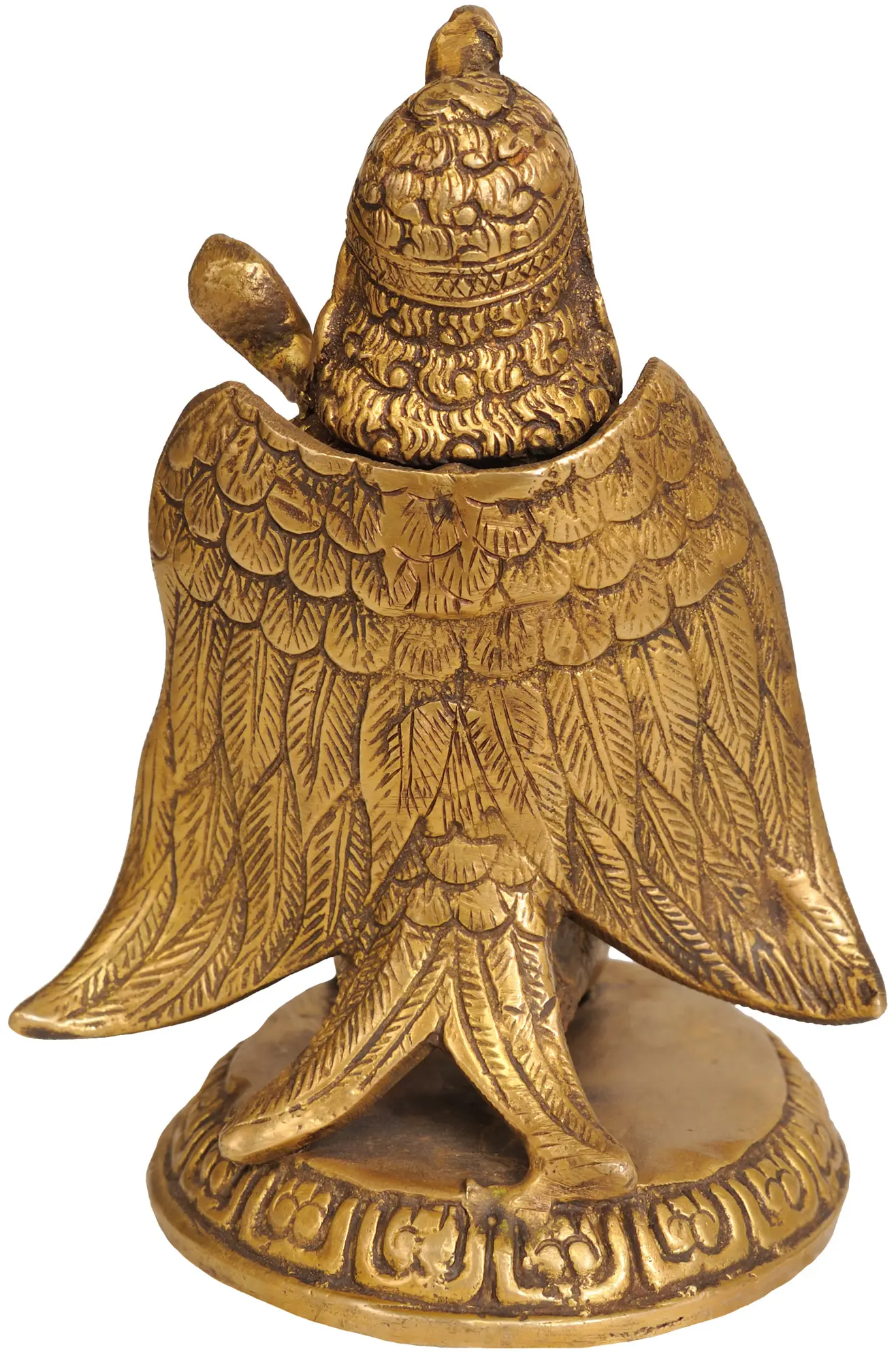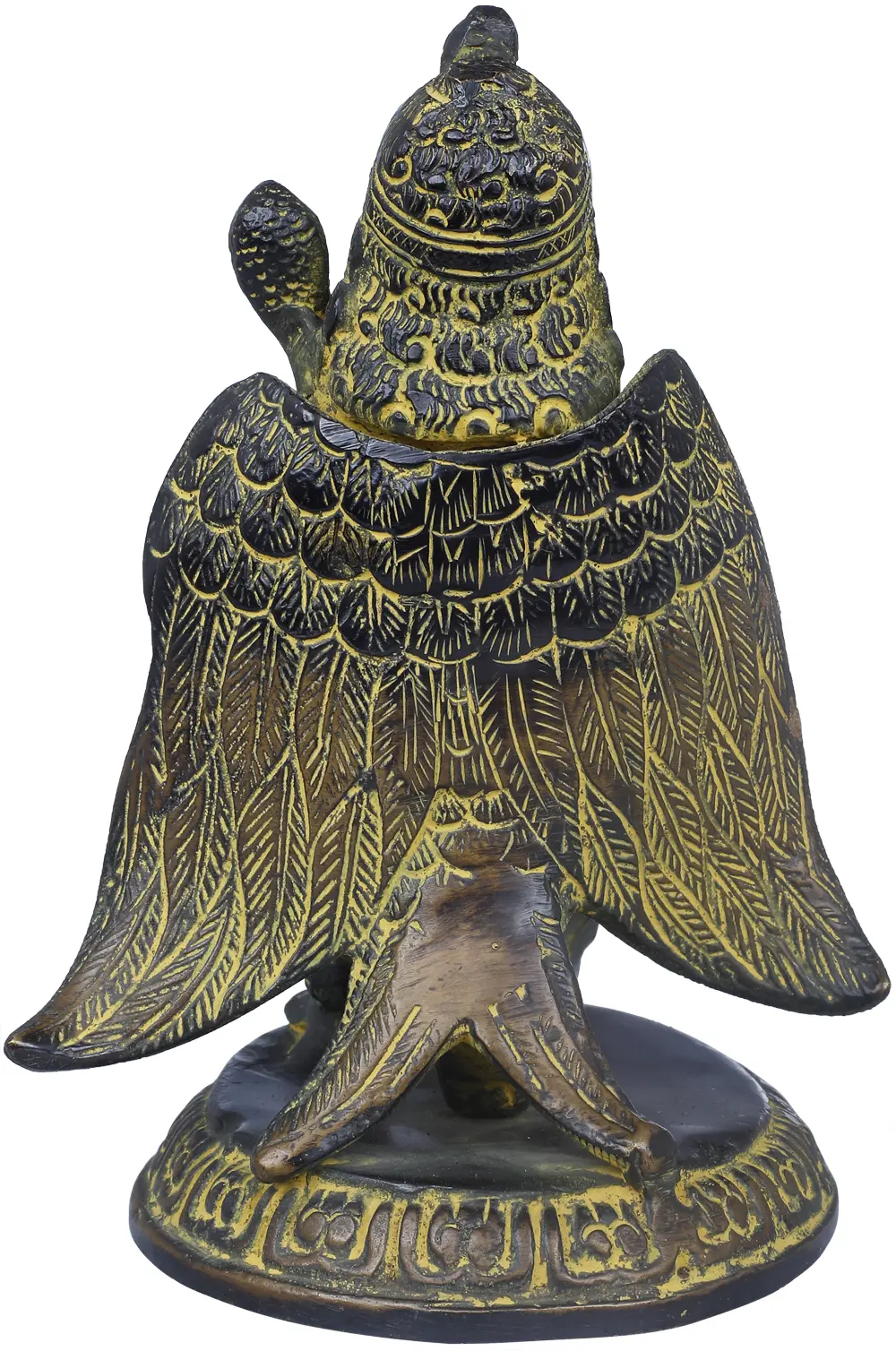 This sculpture captures the essence of Garuda's awe-inspiring form in Anjali mudra – a celestial bird with the head and wings of an eagle, a body like a human, and a spirit that soars beyond earthly boundaries. With wings outstretched, it conveys a sense of unfaltering vigilance and a tireless guardian's devotion. The intricate detailing, from the meticulously etched feathers to the meticulously carved talons, evokes a sense of reverence for Lord Vishnu’s devoted mount.