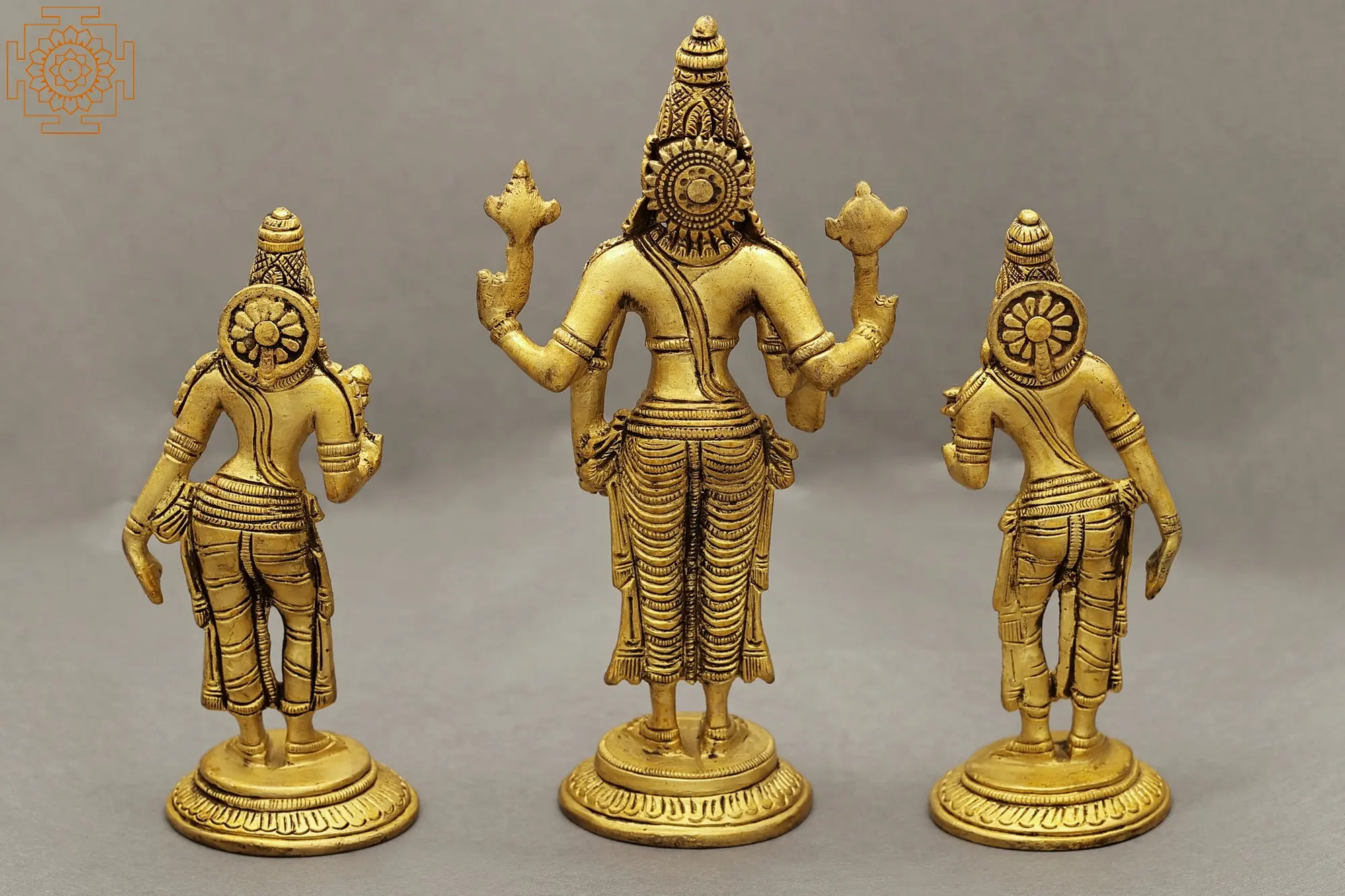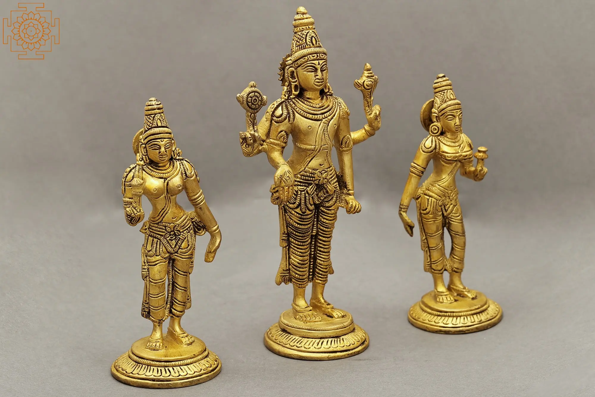 This brass statue set portrays the divine trio of Lord Vishnu with Shridevi and Bhudevi, symbolizing the essence of cosmic harmony. Sri Devi and Bhu Devi, standing gracefully in the Tri Bhanga pose, signify the embodiment of wealth and Earth's nurturing energy. Lord Vishnu, with his multifaceted symbolism, holds the conch and the discus, iconic attributes representing preservation and righteousness. His third hand extends in a gesture of blessings to his devoted worshippers, offering divine protection and guidance. Together, this trio embodies the balance and interconnectedness of the universe, providing a spiritual reminder of the eternal principles of creation, preservation, and sustenance.