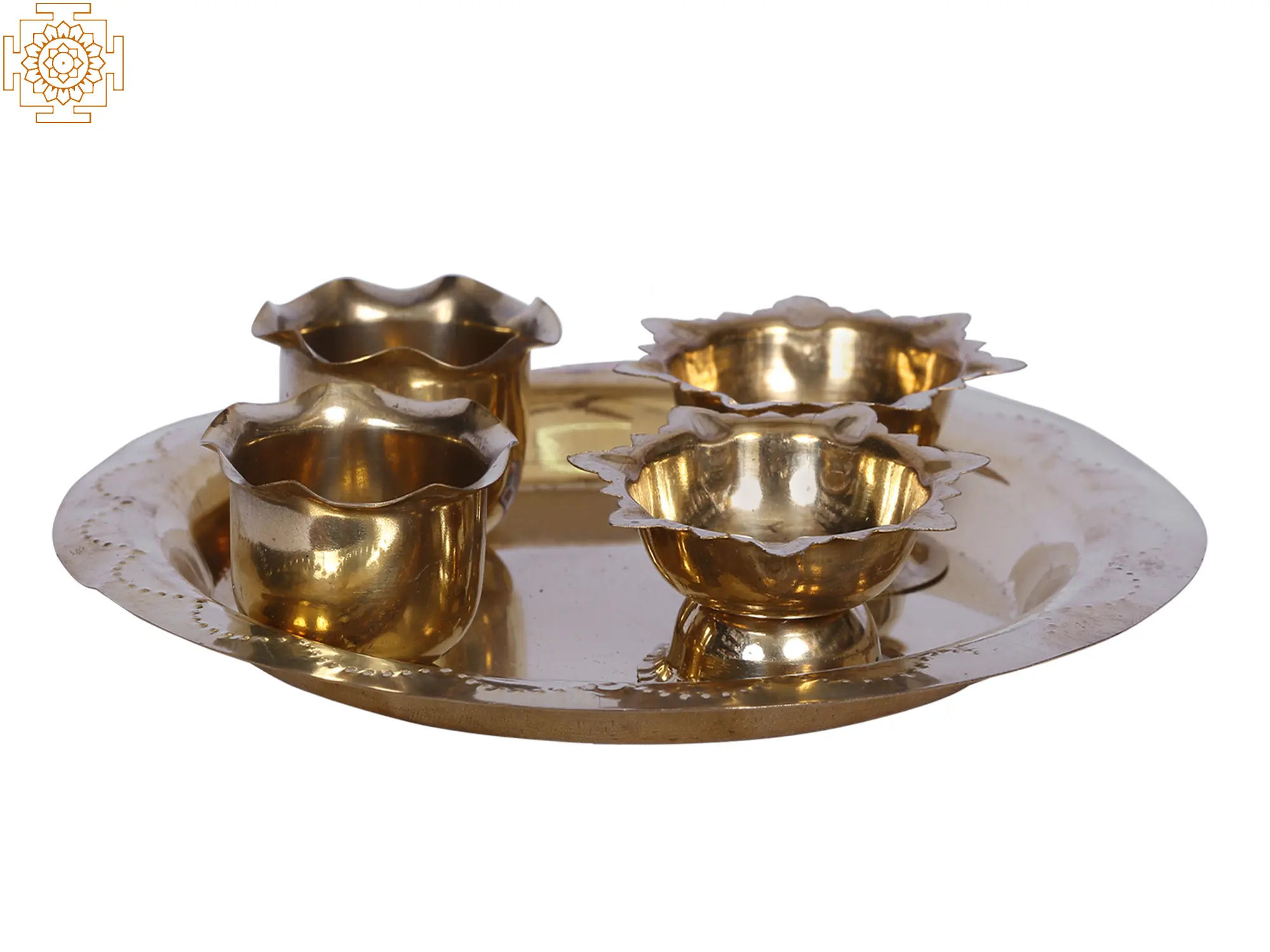 6" Brass Puja Thali with Attached Two Diya and Two Small Bowls