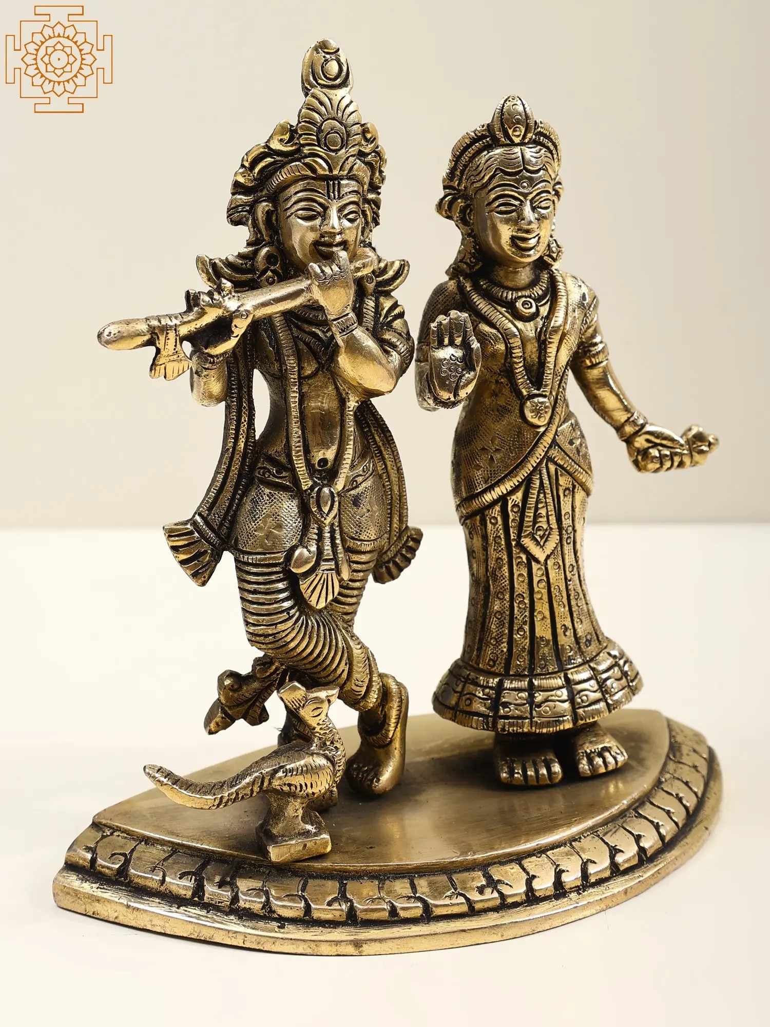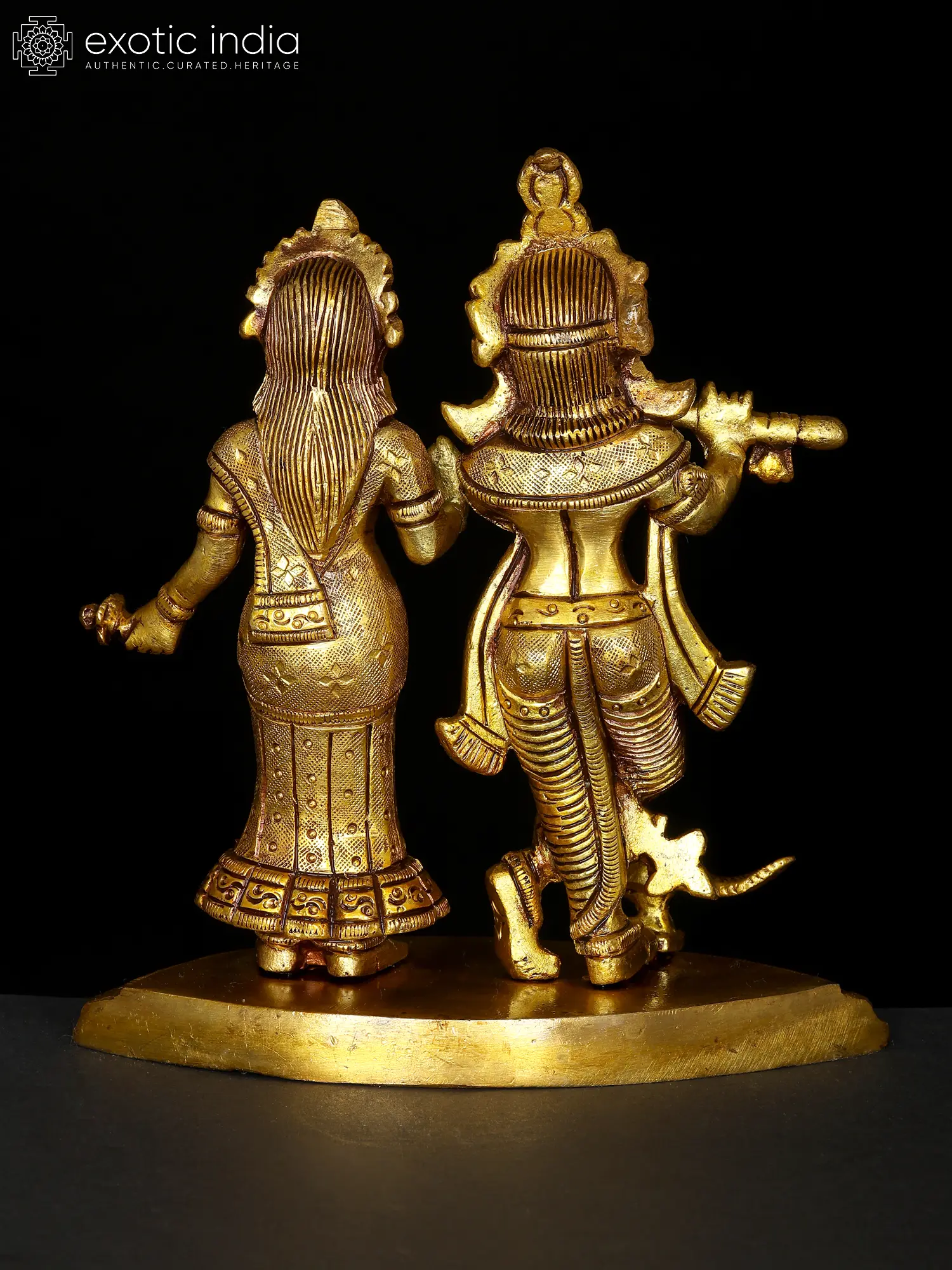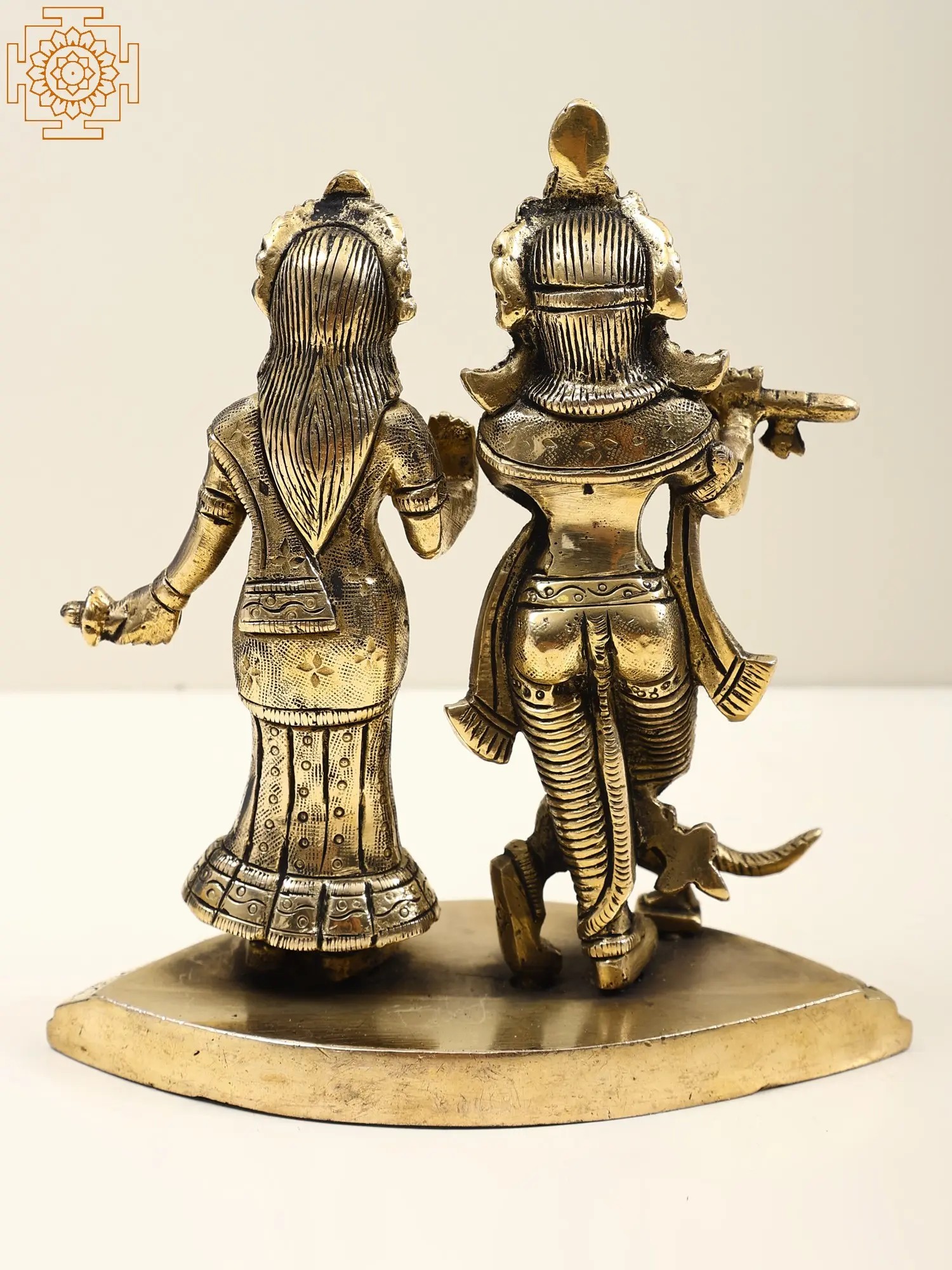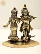 Radha and Krishna, adorned in regal attire, embody divine love and grace. Krishna’s mellifluous flute melodies enchant all, while Radha stands in a gesture of blessing, radiating celestial beauty and benevolence. Their eternal love symbolizes the union of the soul with the divine, transcending earthly boundaries. The music of Krishna’s flute signifies the call to spiritual awakening, drawing devotees towards the ultimate truth. Crafted in brass, this artwork invites you to immerse in their divine presence and experience the sublime ecstasy of their eternal love.
