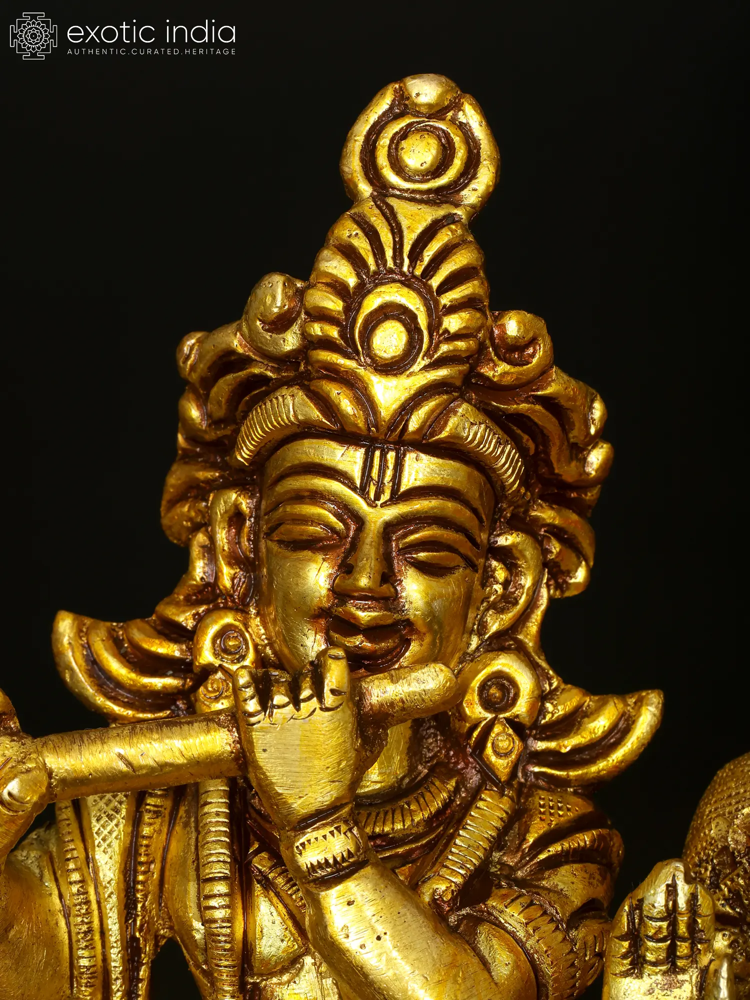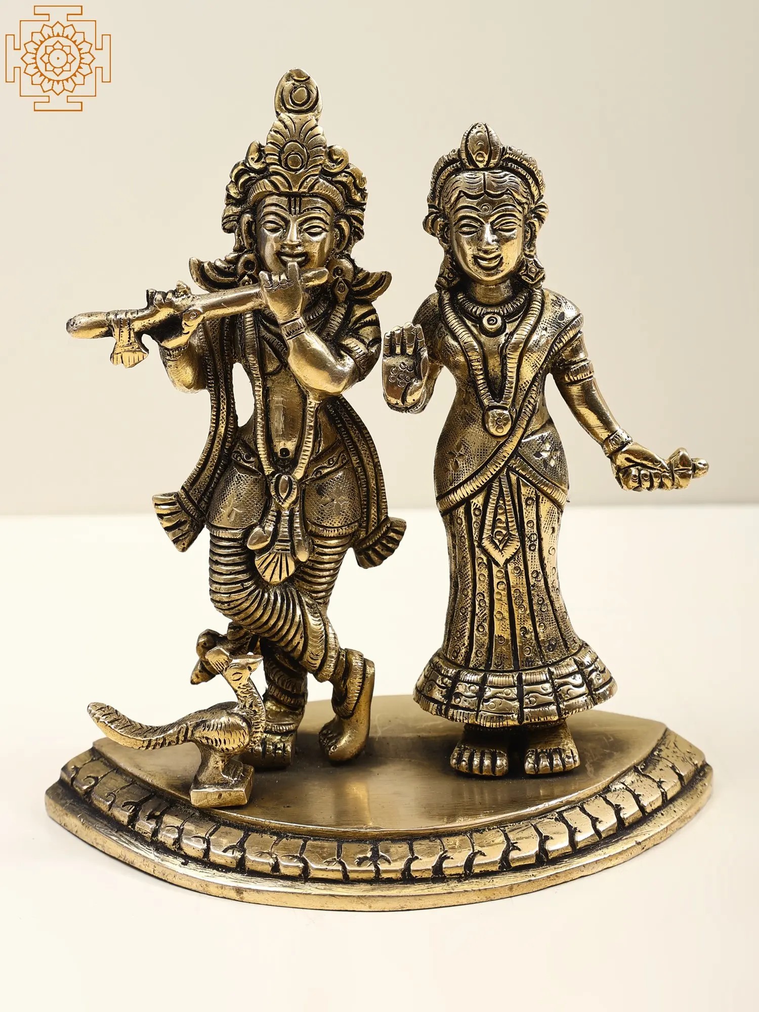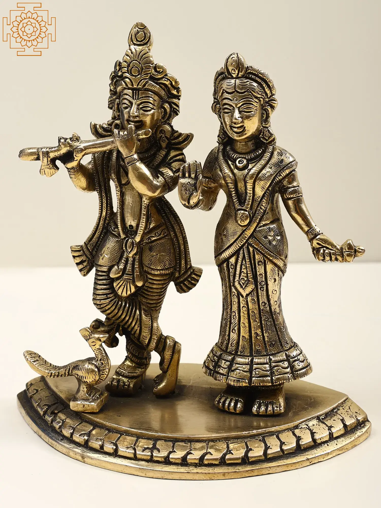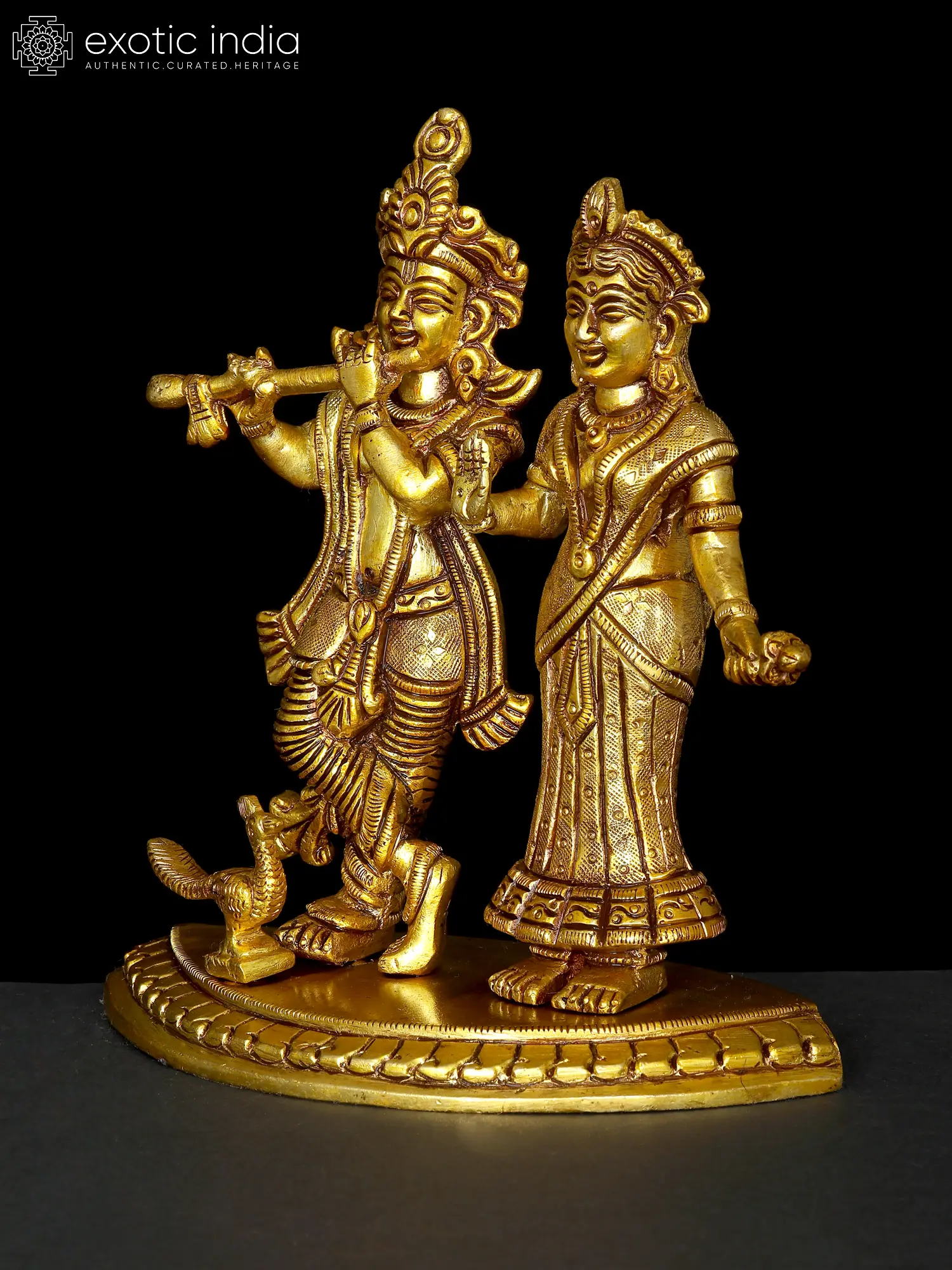 Radha and Krishna, adorned in regal attire, embody divine love and grace. Krishna’s mellifluous flute melodies enchant all, while Radha stands in a gesture of blessing, radiating celestial beauty and benevolence. Their eternal love symbolizes the union of the soul with the divine, transcending earthly boundaries. The music of Krishna’s flute signifies the call to spiritual awakening, drawing devotees towards the ultimate truth. Crafted in brass, this artwork invites you to immerse in their divine presence and experience the sublime ecstasy of their eternal love.