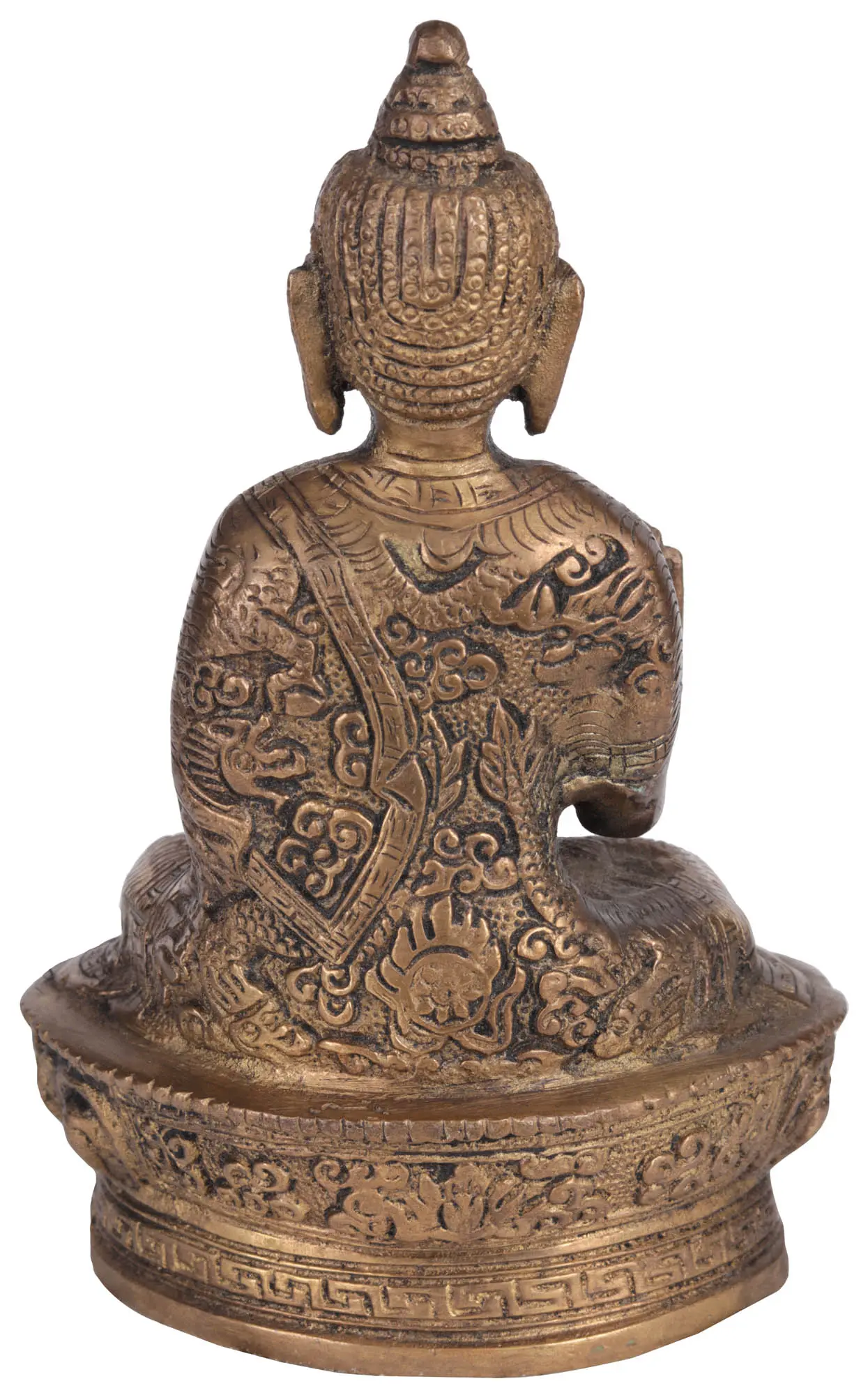 In this evocative portrayal, Shakyamuni Buddha's hand is raised in the Abhaya mudra, iconising fearlessness and offering protection to his devotees. Celebrate the convergence of spirituality and artistic craftsmanship, and allow this stunning brass sculpture to stand as a tribute to your appreciation for sacred symbolism, your admiration for intricate design, and your connection to the eternal teachings that Shakyamuni Buddha's presence bestows upon your life's journey.